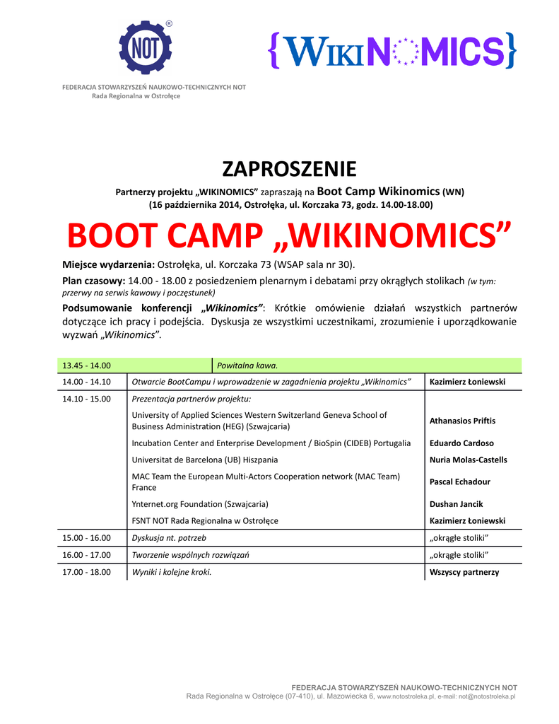FEDERACJA STOWARZYSZEŃ NAUKOWO-TECHNICZNYCH NOT Rada Regionalna w Ostrołęce ZAPROSZENIE Partnerzy projektu „WIKINOMICS” zapraszają na Boot Camp Wikinomics (WN) (16 października 2014, Ostrołęka, ul. Korczaka 73, godz. 14.00-18.00) BOOT CAMP „WIKINOMICS” Miejsce wydarzenia: Ostrołęka, ul. Korczaka 73 (WSAP sala nr 30). Plan czasowy: 14.00 - 18.00 z posiedzeniem plenarnym i debatami przy okrągłych stolikach (w tym: przerwy na serwis kawowy i poczęstunek) Podsumowanie konferencji „Wikinomics”: Krótkie omówienie działań wszystkich partnerów dotyczące ich pracy i podejścia. Dyskusja ze wszystkimi uczestnikami, zrozumienie i uporządkowanie wyzwań „Wikinomics”. 13.45 - 14.00 Powitalna kawa. 14.00 - 14.10 Otwarcie BootCampu i wprowadzenie w zagadnienia projektu „Wikinomics” 14.10 - 15.00 Prezentacja partnerów projektu: Kazimierz Łoniewski University of Applied Sciences Western Switzerland Geneva School of Business Administration (HEG) (Szwajcaria) Athanasios Priftis Incubation Center and Enterprise Development / BioSpin (CIDEB) Portugalia Eduardo Cardoso Universitat de Barcelona (UB) Hiszpania Nuria Molas-Castells MAC Team the European Multi-Actors Cooperation network (MAC Team) France Pascal Echadour Ynternet.org Foundation (Szwajcaria) Dushan Jancik FSNT NOT Rada Regionalna w Ostrołęce Kazimierz Łoniewski 15.00 - 16.00 Dyskusja nt. potrzeb „okrągłe stoliki” 16.00 - 17.00 Tworzenie wspólnych rozwiązań „okrągłe stoliki” 17.00 - 18.00 Wyniki i kolejne kroki. Wszyscy partnerzy FEDERACJA STOWARZYSZEŃ NAUKOWO-TECHNICZNYCH NOT Rada Regionalna w Ostrołęce (07-410), ul. Mazowiecka 6, www.notostroleka.pl, e-mail: [email protected] Info: Projekt „WIKINOMICS”. Celem projektu pilotażowego „Wikinomics” jest wspieranie procesu nabywania kluczowych kompetencji pracowniczych niezbędnych dla zapewnienia zatrudnienia w ciągle zmieniających się warunkach na rynku pracy. Projekt ustanawia tzw. wolną kulturę, czyli wolność użytkowania, dystrybucji i modyfikacji poprzez internet i inne media oraz metodologię „WIKI” jako podstawę do innowacyjnego podejścia dydaktycznego. Sieć ekspertów WikiAngels już stosuje elementy narzędzi wypracowanych w zakończonym projekcie „WikiSkills” w celu wsparcia Wikithonu z Forum Światowego Banku Wiedzy. W środowisku Wikipedii, samorodnie rozwija się nowy sposób uczenia się. Poprzez wspieranie synergicznych możliwości współpracy, środowiska „WIKI” zapewniają bogate spektrum efektywnego uczenia się w szerokim zakresie edukacyjnym i na różnych poziomach. Jest to wynikiem stosowania kultury swobodnego licencjonowania, czasami nazywanej „wikinomics”. Te innowacyjne podejścia wykazały duży potencjał na rzecz rozwoju kluczowych kompetencji wymaganych w ramach przyszłych potrzeb rynku pracy, takich jak kreatywność, innowacyjność, współpraca, umiejętność korzystania z technologii informacyjnokomunikacyjnych, umiejętność komunikowania się w języku ojczystym i w językach obcych, umiejętność uczenia się, świadomości społecznej i obywatelskiej, zmysłu inicjatywy i przedsiębiorczości. Projekt „WIKINOMICS” koncentruje się na edukacji zawodowej (kształcenie, szkolenie i doskonalenie zawodowe), która przygotowuje ludzi do pracy w konkretnych branżach, w rzemiośle. Cele szczegółowe Projektu „WIKINOMICS”: 1. Ukształtować ramy przekrojowego modelu, multi-sektorowych kompetencji kluczowych, zgodnie z ECVET (Europejskim Systemem Transferu w Kształceniu i Szkoleniu Zawodowym) oraz podać konkretne narzędzia i metody na jego realizację; 2. Opracować, wdrożyć i ewaluować specjalnie zaprojektowany moduł szkoleniowy, integrujący kulturę wolnego użytkowania opartą na aktywności uczestników i metodologię opartą na podejściu „Wiki” zwiększający rozwój kluczowych kompetencji pracownika, tak aby dopasować specyfikę kształcenia i szkolenia zawodowego w różnych sektorach; 3. Opracować serię wspólnych scenariuszy nauczania opartych na metodologii „WIKI”, w których uczestnicy działają wspólnie w celu osiągnięcia wspólnych efektów, rezultatów uczenia się; 4. Utworzyć trwałą wspólnotę dobrych praktyk pomiędzy podmiotami kształcenia zawodowego w Europie, pomagającą sobie wzajemnie w przyjmowaniu nowych modeli społeczno-ekonomicznych i pedagogicznych w dobie ery cyfrowej. Program i plan wydarzenia na http://wikinomics.com.pl/, http://www.wikinomics-project.eu/, www.notostroleka.pl. This project has been funded with support from the European Commission. This website reflects the views only of the author, and the Commission cannot be held responsible for any use which may be made of the information contained therein. Z poważaniem /-/ Kazimierz Łoniewski FEDERACJA STOWARZYSZEŃ NAUKOWO-TECHNICZNYCH NOT Rada Regionalna w Ostrołęce (07-410), ul. Mazowiecka 6, www.notostroleka.pl, e-mail: [email protected]