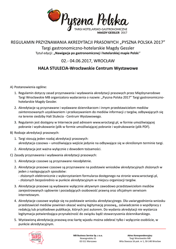 REGULAMIN PRZYZNAWANIA AKREDYTACJI PRASOWYCH „PYSZNA POLSKA 2017” Targi gastronomiczno-hotelarskie Magdy Gessler Tytuł edycji: „Nawigacja po gastronomicznej i hotelarskiej mapie Polski” 02.- 04.06.2017, WROCŁAW HALA STULECIA-Wrocławskie Centrum Wystawowe A) Postanowienia ogólne: 1. Regulamin dotyczy zasad przyznawania i wydawania akredytacji prasowych przez Międzynarodowe Targi Wrocławskie MB organizatora wydarzenia o nazwie: „Pyszna Polska 2017” Targi gastronomicznohotelarskie Magdy Gessler. 2. Akredytacje są przyznawane i wydawane dziennikarzom i innym przedstawicielom mediów zainteresowanych uzyskiwaniem i przekazywaniem do mediów informacji z targów, odbywających się na terenie siedziby Hali Stulecia - Centrum Wystawowego. 3. Regulamin jest dostępny w Internecie pod adresem www.wroctargi.pl, w formie umożliwiającej pobranie i wydrukowanie (plik w formie umożliwiającej pobranie i wydrukowanie (plik PDF). B) Rodzaje akredytacji prasowych: 1. Targi stosują jeden rozdaj akredytacji prasowych: akredytacja czasowa – umożliwiająca wejście jedynie na odbywające się w określonym terminie targi. 2. Akredytacja jest ważna wyłącznie z dowodem tożsamości. C) Zasady przyznawania i wydawania akredytacji prasowych: 1. Akredytacje czasowe są przyznawane nieodpłatnie. 2. Akredytacje prasowe czasowe są przyznawane na podstawie wniosków akredytacyjnych złożonych w jeden z następujących sposobów: - złożonych elektronicznie z wykorzystaniem formularza dostępnego na stronie www.wroctargi.pl, - złożonych bezpośrednio w punkcie akredytacyjnym w miejscu organizacji targów. 3. Akredytacje prasowe są wydawane wyłącznie aktywnym zawodowo przedstawicielom mediów zarejestrowanych sądownie i posiadających osobowość prawną oraz oficjalnym serwisom internetowym. 4. Akredytacje czasowe wydaje się na podstawie wniosku akredytacyjnego. Dla uwiarygodnienia wniosku przedstawiciel mediów powinien okazać ważną legitymację prasową,, zaświadczenie o współpracy z redakcją lub przykładowe publikacje, których jest autorem. Do wydania akredytacji nie wystarcza legitymacja potwierdzająca przynależność do związku bądź stowarzyszenia dziennikarskiego. 5. Wystawioną akredytację prasową oraz kartę wjazdu można odebrać tylko i wyłącznie osobiście, w punkcie akredytacyjnym. MB Business Service Sp. z o.o. Nowogrodzka 31 02-511 Warszawa Adres Korespondencyjny: Targi Wrocławskie MB Wita Stwosza 16 pok. nr 1, 50-148 Wrocław 6. Akredytacje czasowe można odbierać w punkcie akredytacyjnym w dniach trwania targów. 7. W trakcie wykonywania zadań dziennikarskich przez przedstawicieli mediów akredytacja musi być umieszczana przez jej posiadacza w miejscu widocznym dla służb porządkowych. 8. Przedstawiciele mediów ponoszą pełną odpowiedzialność za prawdziwość i prawidłowość podanych przez siebie danych niezbędnych do uzyskania akredytacji, w tym za skutki wynikłe z niepełnego lub błędnego podania danych. D) Korzyści z otrzymania akredytacji: 1. Akredytacja czasowa upoważnia przedstawicieli mediów do wejścia na teren Hali Stulecia-Centrum Wystawowego z zastrzeżeniem, że na niektóre wydarzenia ( np. wieczory branżowe, konferencje, seminaria) mogą obowiązywać osobne zaproszenia, wydawane przez organizatora. 2. Akredytacje czasowa upoważnia do nieodpłatnego wjazdu, samochodem osobowym na teren Centrum Wystawowego. 3. Akredytowany przedstawiciel mediów może otrzymać nieodpłatnie w Centrum Prasowym / wydarzenia materiały związane z targami (np. katalog targów, program targów, biuletyny informacyjne. 4. W celu ułatwienia pracy przedstawicielom mediów Organizator zapewnia iż w Centrum Prasowym na terenie wystawowy udostępni dostęp do komputerów podłączonych do internetu. 5. Do dyspozycji akredytowanych przedstawicieli mediów pozostaje pracownik Centrum Prasowego na terenie wystawowym albo w punkcie akredytacyjnym w innym miejscu organizacji targów. służący wszelką pomocą w nawiązaniu kontaktów z wystawcami targów / uczestnikami wydarzeń, a także w udostępnieniu informacji dotyczących ekspozycji targowych lub organizowanych wydarzeń. 6. Organizator zapewnia akredytowanym przedstawicielom mediów pomoc przy rezerwacji miejsca hotelowego, jednak zastrzegają sobie konieczność zgłoszenia takiej potrzeby najpóźniej 14 dni przed targami / wydarzeniem. MB Business Service Sp. z o.o. Nowogrodzka 31 02-511 Warszawa Adres Korespondencyjny: Targi Wrocławskie MB Wita Stwosza 16 pok. nr 1, 50-148 Wrocław