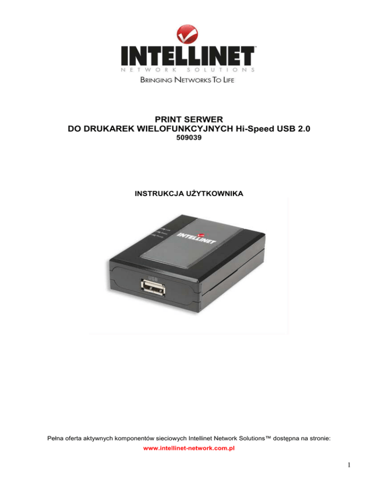 PRINT SERWER DO DRUKAREK WIELOFUNKCYJNYCH Hi-Speed USB 2.0 509039 INSTRUKCJA UśYTKOWNIKA Pełna oferta aktywnych komponentów sieciowych Intellinet Network Solutions™ dostępna na stronie: www.intellinet-network.com.pl 1 SPIS TREŚCI I. Wstęp......................................................................................................................... 3 II. Podłączenie oraz instalacja .................................................................................... 4 III. Aplikacja administratora „MFP Server Utilities”.................................................. 8 IV. Instalacja i współuŜytkowanie drukarek MFP...................................................... 9 V. Aplikacja „MFP Manager” .................................................................................... 14 VI. Konfiguracja print serwera – aplikacja „Server Manager” ............................... 16 VII. Zarządzanie przez WWW .................................................................................... 16 VIII. Tabela kompatybilności print serwera 509039 z urządzeniami MFP ............. 19 2 I. Wstęp Print serwer 509039 jest urządzeniem współpracującym z drukarkami wielofunkcyjnymi (MFP). UmoŜliwia współdzielenie wszystkich funkcji urządzeń MFP w sieci lokalnej. Dodatkowo, dzięki obsłudze komunikacji wielokierunkowej, pozwala na monitorowanie statusu podłączonych drukarek (poziom toneru, ilość papieru). Print serwer wielofunkcyjny obsługuje wszystkie funkcje urządzeń MFP: drukowanie, skanowanie, faksowanie oraz czytnik kart. Print serwer obsługuje drukarki MFP w systemach Windows 2000 z SP4 (lub wyŜszy) oraz Windows XP z SP1 (lub wyŜszy). Urządzenie moŜe takŜe pełnić funkcję zwykłego print serwera do jednozadaniowych drukarek USB, poniewaŜ obsługuje protokół sieciowy TCP/IP oraz protokoły drukowania LPR, RAW i IPP. W funkcji zwykłego print serwera, 509039 współpracuje z systemami Windows 98SE / Me / NT / 2000 / XP / 2003, Unix, Linux oraz MAC OS 9.X. Print serwer 509039 moŜe działać jednocześnie w trybie obsługującym urządzenie MFP oraz tradycyjne drukarki USB. Pozwala to na współdzielenie w sieci lokalnej kilku urządzeń jednocześnie. 3 II. Podłączenie oraz instalacja Podłączanie urządzeń 1. Podłącz print serwer wielofunkcyjny 509039 z urządzeniem wielofunkcyjnym (MFP) lub zwykłą drukarką, uŜywając odpowiedniego kabla USB. 2. UŜywając kabla Ethernetowego Cat5 podłącz print serwer do sieci LAN. 3. Podłącz zasilanie do 509039. Po przeprowadzeniu autotestu urządzenie jest gotowe do pracy. Uwaga! 1. UŜywaj tylko zasilacza dostarczonego w komplecie z urządzeniem. 2. W celu uniknięcia problemów z wykrywaniem i prawidłowym działaniem urządzeń, zaleca się podłączenie zasilania najpierw do print serwera, a dopiero potem do drukarki. Instalacja oprogramowania Oprogramowanie przeznaczone jest pod platformy Windows 2000 z SP4 (lub wyŜszy) oraz Windows XP z SP1 (lub wyŜszy). Przed przystąpieniem do instalacji naleŜy upewnić się, czy na komputerze nie są zainstalowane poprzednie wersje oprogramowania. 1. Umieść płytę CD w napędzie CD-ROM. Aplikacja powinna uruchomić się automatycznie. W innym przypadku naleŜy ręcznie uruchomić aplikację Autorun.exe znajdującą się na płycie. Pojawi się następujące menu: 2. Wybieramy opcję „MFP Server Instalation”, aby uruchomić instalatora oprogramowania. 4 3. Klikamy opcję „Next” i przechodzimy do kolejnego ekranu. Jeśli wybierzemy opcję „Change” będziemy mieli moŜliwość zmiany docelowego katalogu instalacji. Aby pozostawić bez zmian klikamy ponownie opcję „Next”. 4. System rozpocznie instalowanie składników oprogramowania administracyjnego. 5. W przypadku pojawienia się poniŜszego komunikatu, klikamy „Mimo to kontynuuj” (Continue anyway). 6. Następnie instalowane są sterowniki print serwera wielofunkcyjnego. Pojawić się moŜe podobny komunikat, jak poprzednio. Klikamy „Mimo to kontynuuj” (Continue anyway). 5 7. Po zainstalowaniu oprogramowania i sterowników, pojawi się ekran wyboru konfiguracji parametrów urządzenia. Jeśli nie chcemy teraz konfigurować, wybieramy opcję „No, I will configure the MFP Server later”. Aby od razu skonfigurować print serwer wybieramy „Yes, I want to configure the MFP Server now” i kilkamy „Next”. 8. Program przeskanuje naszą sieć lokalną w poszukiwaniu urządzeń MFP. Wybieramy z listy dostępnych urządzeń, to które chcemy konfigurować i klikamy „Next”. Jeśli za pierwszym razem nie wykryte zostaną Ŝadne urządzenia, uŜywamy przycisku „Refresh”, aby powtórzyć skanowanie. Jeśli nie uzyskamy efektu, po kilku próbach naleŜy zamknąć program, dokładnie sprawdzić wszystkie podłączenia oraz kable i powtórzyć skanowanie uruchamiając aplikację „MFP Manager”: Start > Programy > MFP Server Utilities > MFP Manager. 6 9. Wprowadzamy domyślne parametry: nazwę uŜytkownika „admin” oraz hasło „1234”, aby zalogować się do menu konfiguracyjnego. 10. Definiujemy nazwę urządzenia oraz wypełniamy (nie jest to konieczne) pole „opis urządzenia i klikamy „Next”. 11. Domyślne parametry sieciowe urządzenia MFP to: Adres IP: 192.168.2.2 Maska podsieci: 255.255.255.0 Aby zmienić ustawienia sieciowe ręcznie, moŜemy wybrać opcję „Manual IP” i samodzielnie wpisać parametry. NaleŜy pamiętać, aby print serwer był w tej samej podsieci, co pozostałe komputery naszej sieci lokanej. Jeśli mamy w naszej lokalnej sieci router z włączonym serwerem DHCP, to moŜemy skorzystać z opcji automatycznego przydzielania adresów IP, wybierając „DHCP”. Następnie klikamy „Next”. 12. Konfiguracja została zakończona. Klikamy „Finish”, aby zapisać ustawienia. 7 13. Ponownie klikamy „Finish”, aby zakończyć pracę instalatora. 14. Aby manager MFP był uruchamiany automatycznie po starcie systemu Windows,