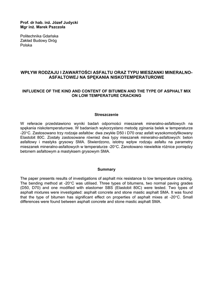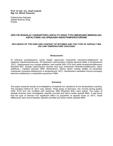 Prof. dr hab. inż. Józef Judycki Mgr inż. Marek Pszczoła Politechnika Gdańska Zakład Budowy Dróg Polska WPŁYW RODZAJU I ZAWARTOŚCI ASFALTU ORAZ TYPU MIESZANKI MINERALNOASFALTOWEJ NA SPĘKANIA NISKOTEMPERATUROWE INFLUENCE OF THE KIND AND CONTENT OF BITUMEN AND THE TYPE OF ASPHALT MIX ON LOW TEMPERATURE CRACKING Streszczenie W referacie przedstawiono wyniki badań odporności mieszanek mineralno-asfaltowych na spękania niskotemperaturowe. W badaniach wykorzystano metodę zginania belek w temperaturze -20°C. Zastosowano trzy rodzaje asfaltów: dwa zwykłe D50 i D70 oraz asfalt wysokomodyfikowany Elastobit 80C. Zostały zastosowane również dwa typy mieszanek mineralno-asfaltowych: beton asfaltowy i mastyks grysowy SMA. Stwierdzono, istotny wpływ rodzaju asfaltu na parametry mieszanek mineralno-asfaltowych w temperaturze -20°C. Zanotowano niewielkie różnice pomiędzy betonem asfaltowym a mastyksem grysowym SMA. Summary The paper presents results of investigations of asphalt mix resistance to low temperature cracking. The bending method at -20°C was utilised. Three types of bitumens, two normal paving grades (D50, D70) and one modified with elastomer SBS (Elastobit 80C) were tested. Two types of asphalt mixtures were investigated: asphalt concrete and stone mastic asphalt SMA. It was found that the type of bitumen has significant effect on properties of asphalt mixes at -20°C. Small differences were found between asphalt concrete and stone mastic asphalt SMA. 1. Wstęp W ostatnich latach główny nacisk podczas projektowania mieszanek mineralno-asfaltowych został położony na zapewnienie ich wysokiej odporności na deformacje trwałe. Jest to zrozumiałe z uwagi na dużą liczbę dróg, na których występują mniejsze lub większe koleiny. Większa odporność na deformacje wiąże się przede wszystkim ze wzrostem sztywności mieszanek mineralnoasfaltowych co z kolei jest niebezpieczne podczas spadków temperatury w okresie zimowym. Obniżanie temperatury w przypadku sztywnych mieszanek powoduje szybsze pojawienie się spękań niskotemperaturowych. Jest to szczególnie istotne w rejonach Polski PółnocnoWschodniej, gdzie temperatura w najchłodniejszych okresach zimy spada poniżej -30˚ C. Niebezpieczne dla „przesztywnionych” mieszanek mineralno-asfaltowych są również gwałtowne spadki temperatury oraz częste jej wahania. W chwili obecnej brak jest jasnych kryteriów jakimi powinien kierować się projektant podczas projektowania nowych mieszanek mineralno-asfaltowych bardziej odpornych na spękania niskotemperaturowe. O ile zagadnienie deformacji trwałych nawierzchni asfaltowych zostało w dużej mierze poznane i nauczono się przeciwdziałać koleinom, o tyle problem spękań niskotemperaturowych nie został w pełni rozwiązany. W artykule przedstawiono wyniki badań zginania mieszanek temperaturze -20°C oraz wnioski wynikające z tych badań. 2. mineralno-asfaltowych w Metodyka badań Odporność mieszanek mineralno-asfaltowych na spękania niskotemperaturowe badano na belkach o wymiarach 50x50x300 mm w temperaturze -20°C. Szczegółowy opis metody badań przedstawiono w [2]. Modyfikacją metody badania odporności mieszanek mineralno-asfaltowych w roku 2001 było stworzenie odrębnego stanowiska badawczego oraz opracowanie programu komputerowego, który usprawnił i przyspieszył całą procedurę badawczą. Usprawnienia wynikające z zastosowania programu komputerowego są następujące: • Możliwość łatwiejszego ustawienia czujnika indukcyjnego mierzącego przemieszczenie na spodzie belki w zakresie pomiarowym (krótszy czas badania), • Możliwość obserwacji w czasie badania zachowania się próbki na wykresie zależności wzrastającej siły do przemieszczenia, • Uzyskanie gotowych wyników: wartości odkształcenia granicznego, wytrzymałości na zginanie oraz modułu sztywności od razu po zakończeniu badania. Wszystkie te elementy pozwoliły na skrócenie czasu badania pojedynczej próbki co jest szczególne ważne w temperaturze -20˚C, ponieważ pozwala na ograniczenie wpływu temperatury otoczenia na wyniki badań. W badaniu zginania belek określano następujące parametry: • Odkształcenie graniczne, • Wytrzymałość na rozciąganie przy zginaniu, • Moduł sztywności. 3. Badane mieszanki mineralno-asfaltowe 3.1. Rodzaje badanych mieszanek mineralno-asfaltowych W badaniach zastosowano pięć mieszanek mineralno-asfaltowych: trzy z asfaltami zwykłymi (D50 RG i D70 RG) i dwie z asfaltem wysokomodyfikowanym elastomerem SBS (E80C RG). Do wszystkich mieszanek dodano środek adhezyjny Teramin 14. Zestawienie mma przedstawiono w tablicy 1. Lp. 1. 2. 3. 4. 5. 3.2. Tablica 1. Rodzaje zastosowanych mieszanek mineralno-asfaltowych Rodzaj mieszanki Zastosowane Przeznaczenie Wymagania lepiszcze Beton asfaltowy D50 RG Warstwa ścieralna, PN-S-96025:2000 0/12,8 KR 3 – KR 6 Beton asfaltowy D70 RG Warstwa ścieralna, PN-S-96025:2000 0/12,8 KR 1 – KR 2 Beton asfaltowy E80C RG Warstwa ścieralna PN-S-96025:2000 0/12,8 KR 3 – KR 6 Mastyks grysowy D50 RG Warstwa ścieralna, ZTV Asph. StB 94 0/11 KR 3 – KR 6 Mastyks grysowy E80C RG Warstwa ścieralna, PN-S-96025:2000 0/8 KR 3 – KR 6 Pozyskanie mieszanek mineralno-asfaltowych Ważnym elementem przeprowadzonych badań było przygotowanie miarodajnych próbek. Aby jak najlepiej odtworzyć rzeczywiste warunki pracy nawierzchni zdecydowano się na pobieranie mieszanek mineralno – asfaltowych z wytwórni mas bitumicznych. Pobieranie mieszanek miało miejsce po ich wytworzeniu, w chwili załadunku na samochody. Mieszanki po pobraniu były transportowane do laboratorium i tam były z nich wykonywane próbki do badań. Pobieranie mieszanek mineralno – asfaltowych z wytwórni pozwoliło na badanie materiału, który przeszedł rzeczywisty proces starzenia krótkoterminowego. Jest to ważne, ponieważ starzenie się asfaltu oraz zmiany jakie w nim zachodzą podczas otaczania w otaczarce maj