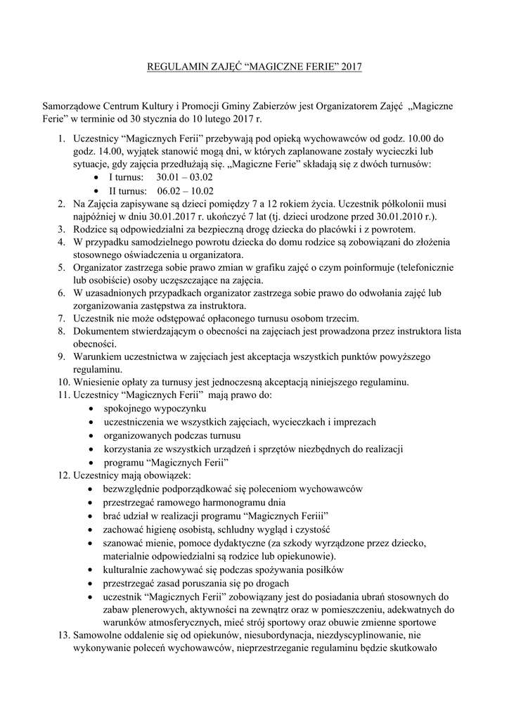 REGULAMIN ZAJĘĆ “MAGICZNE FERIE” 2017 Samorządowe Centrum Kultury i Promocji Gminy Zabierzów jest Organizatorem Zajęć „Magiczne Ferie” w terminie od 30 stycznia do 10 lutego 2017 r. 1. Uczestnicy “Magicznych Ferii” przebywają pod opieką wychowawców od godz. 10.00 do godz. 14.00, wyjątek stanowić mogą dni, w których zaplanowane zostały wycieczki lub sytuacje, gdy zajęcia przedłużają się. „Magiczne Ferie” składają się z dwóch turnusów: I turnus: 30.01 – 03.02 II turnus: 06.02 – 10.02 2. Na Zajęcia zapisywane są dzieci pomiędzy 7 a 12 rokiem życia. Uczestnik półkolonii musi najpóźniej w dniu 30.01.2017 r. ukończyć 7 lat (tj. dzieci urodzone przed 30.01.2010 r.). 3. Rodzice są odpowiedzialni za bezpieczną drogę dziecka do placówki i z powrotem. 4. W przypadku samodzielnego powrotu dziecka do domu rodzice są zobowiązani do złożenia stosownego oświadczenia u organizatora. 5. Organizator zastrzega sobie prawo zmian w grafiku zajęć o czym poinformuje (telefonicznie lub osobiście) osoby uczęszczające na zajęcia. 6. W uzasadnionych przypadkach organizator zastrzega sobie prawo do odwołania zajęć lub zorganizowania zastępstwa za instruktora. 7. Uczestnik nie może odstępować opłaconego turnusu osobom trzecim. 8. Dokumentem stwierdzającym o obecności na zajęciach jest prowadzona przez instruktora lista obecności. 9. Warunkiem uczestnictwa w zajęciach jest akceptacja wszystkich punktów powyższego regulaminu. 10. Wniesienie opłaty za turnusy jest jednoczesną akceptacją niniejszego regulaminu. 11. Uczestnicy “Magicznych Ferii” mają prawo do: spokojnego wypoczynku uczestniczenia we wszystkich zajęciach, wycieczkach i imprezach organizowanych podczas turnusu korzystania ze wszystkich urządzeń i sprzętów niezbędnych do realizacji programu “Magicznych Ferii” 12. Uczestnicy mają obowiązek: bezwzględnie podporządkować się poleceniom wychowawców przestrzegać ramowego harmonogramu dnia brać udział w realizacji programu “Magicznych Feriii” zachować higienę osobistą, schludny wygląd i czystość szanować mienie, pomoce dydaktyczne (za szkody wyrządzone przez dziecko, materialnie odpowiedzialni są rodzice lub opiekunowie). kulturalnie zachowywać się podczas spożywania posiłków przestrzegać zasad poruszania się po drogach uczestnik “Magicznych Ferii” zobowiązany jest do posiadania ubrań stosownych do zabaw plenerowych, aktywności na zewnątrz oraz w pomieszczeniu, adekwatnych do warunków atmosferycznych, mieć strój sportowy oraz obuwie zmienne sportowe 13. Samowolne oddalenie się od opiekunów, niesubordynacja, niezdyscyplinowanie, nie wykonywanie poleceń wychowawców, nieprzestrzeganie regulaminu będzie skutkowało upomnieniem, a w ostateczności wykluczeniem uczestnika z udziału w zajęciach (bez możliwości zwrotu opłaty za poszczególne turnusy). 14. Organizatorzy nie odpowiadają za rzeczy zagubione przez uczestników podczas zajęć oraz za zniszczenia rzeczy należących do dzieci, a dokonanych przez innych uczestników. Zachęcamy do tego, aby nie przynosić na zajęcia cennych urządzeń, np. telefonów komórkowych, tabletów, odtwarzaczy muzyki, itp. niekoniecznych do udziału w zajęciach. 15. W ramach wniesionej opłaty za pobyt dziecka na półkolonii organizator nie zapewnia drugiego śniadanie. 16. W ramach wniesionej opłaty za pobyt dziecka na półkolonii organizator zapewnia przejazdy autokarowe podczas wycieczek, bilety wstępu do obiektów ujętych w programie zajęć oraz materiały niezbędne do realizacji programu. 17. Rodzice lub opiekunowie mają obowiązek: Dokonać wpłaty za każdy turnus z góry tj. najpóźniej w dniu 30.01 do godziny 10.00, jedynie po dokonaniu wpłaty dziecko wpisane zostanie na listę uczestników Odebrać dziecko niezwłocznie po zakończeniu zajęć Opłata za każdy turnus ( tydzień ) wynosi 80 zł. Brak wpłaty będzie oznaczać rezygnację z turnusu. Zgłosić rezygnację dziecka z turnusu najpóźniej na tydzień przed jego rozpoczęciem. W przeciwnym wypadku uiszczona opłata nie zostanie zwrócona. Wypełnić formularz rejestracyjny uczestnika półkolonii. W przypadku odkrycia przez Organizatora fałszywych informacji w formularzu może on dokonać skreślenia dziecka z listy uczestników. 18. Zarządzeniem Dyrektora SCKiPGZ na każdy turnus przyjmowanych jest 25 uczestników. Ponadto dla dzieci pracowników udostępniona jest lista dodatkowych maksymalnie pięciu miejsc. Pracownicy wnoszą opłaty za uczestnictwo swoich dzieci takie jak pozostali opiekunowie i obowiązuje ich ten sam regulamin. W przypadku niewykorzystanie miejsc przez dzieci pracowników, miejsca te przechodzą na rzecz kolejnych uczestników z listy rezerwowej, którzy stają się uczestnikami zajęć. Z treścią powyższego regulaminu zapoznałem się, przyjmuje do wiadomości i akceptuje jego treść. …………………………………… /data, podpis opiekuna/