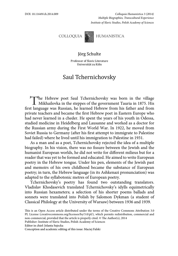 Colloquia Humanistica 3 (2014) Multiple Biographies, Transcultural Experience DOI: 10.11649/ch.2014.009 Institute of Slavic Studies, Polish Academy of Sciences COLLOQUIA HUMANISTICA Jörg Schulte Professor of Slavic Literature Universität zu Köln Saul Tchernichovsky T he Hebrew poet Saul Tchernichovsky was born in the village Mikhailovka in the steppes of the government Tauria in 1875. His first language was Russian, he learned Hebrew from his father and from private teachers and became the first Hebrew poet in Eastern Europe who had never learned in a cheder. He spent the years of his youth in Odessa, studied medicine in Heidelberg and Lausanne and worked as a doctor for the Russian army during the First World War. In 1922, he moved from Soviet Russia to Germany (after his first attempt to immigrate to Palestine had failed) where he lived until his immigration to Palestine in 1931. As a man and as a poet, Tchernichovsky rejected the idea of a multiple biography. In his vision, there was no fissure between the Jewish and the humanist European worlds, he did not write for different milieus but for a reader that was yet to be formed and educated. He aimed to write European poetry in the Hebrew tongue. Under his pen, elements of the Jewish past and memoirs of his own childhood became the substance of European poetry; in turn, the Hebrew language (in its Ashkenazi pronunciation) was adapted to the syllabotonic metres of European poetry. Tchernichovsky’s poetry has found two outstanding translators. Vladislav Khodasevich translated Tchernichovsky’s idylls equimetrically into Russian hexameters; a selection of his shorter poems ballads and sonnets were translated into Polish by Salomon Dykman (a student of Classical Philology at the University of Warsaw) between 1936 and 1939. This is an Open Access article distributed under the terms of the Creative Commons Attribution 3.0 PL License (creativecommons.org/licenses/by/3.0/pl/), which permits redistribution, commercial and non-commercial, provided that the article is properly cited. © The Author(s), 2014 Publisher: Institute of Slavic Studies, Polish Academy of Sciences Editor in chief: Jolanta Sujecka Conception and academic editing of this issue: Maciej Falski Jörg Schulte The translations do not include those poems in which Tchernichovsky established a firm connection between Hebrew and Polish poetry. Tcher nichovsky spoke and read Polish fluently and knew long passages of Pan Tadeusz by heart. One of his most famous lines “Man is nothing but a little plot of land,/ Man is nothing but the image of his native landscape” carries the distinct echo of Mickiewicz’s lines in Forefathers’ Eve: “Lecz twarz każdego jest jak ich kraina…” (“Their faces are as their homeland…”). Between 1909 and 1921, Tchernichovsky wrote fifteen Crimean sonnets in imitation of Adam Mickiewicz. I have translated four (out of fifteen) Hebrew sonnets into English in which the echoes of Mickiewicz’s Crimean sonnets are most noticeable. The originals are written in Hebrew alexan drines, i.e. in iambic hexameters with a caesura after the sixth syllable. 138 COLLOQUIA HUMANISTICA Saul Tchernichovsky Crimean Sonnets I. Ha-gam kohen lʾAlláh | bein ʾaḥav „Ṭshaṭirdag“ vʾal ketef hare Ḳrim | uvmotam yiṣagev, veḥashrat ʿavim lo | ʿim braḳim – tsnif shel ḥag, mah yafeh „Demerdshi“ | ha-ḳam binfotsot regev! Kotarto tivḳaʿ ʿav, | ulroʾsho ʾavne-negev: mi yirʿeh tsoʾno vo | ulroʿo yoʾmer: nhag. ʾadamdam-ʾefor brosh | vekhesef-livneh daḳ. Vahdar ʿets gofer lo | btaltalim raʿananim, haniṣʾe mikol gan | varam ʿal yaʿar pereʾ milvoʾ ha-geʾ vha-yam | vʿad biḳʿat Baʾar-Dereʾ. Uvvoʾhastav ha-ḳar | ufashaṭ ʿal ha-ganim, veʾavlah gefen Ḳrim | baʿdei zhavah unḥushtah, mah yafeh „Demerdshi“ | ha-tsofeh fne ʾAlushṭah! Is there a priest of Allah among the brothers of Chatyr-Dag? He rises on the shoulder of the Crimean mountains and on their heights, And thick clouds with lightning are his festive turban, How beautiful is Demirji that rose amid clumps of earth, His crown cuts the clouds, on his peak are stone obstacles. Who will graze his sheep there and who will tell the shepherd: “guide me”? He is red and grey, and at his foot lie southern gardens, The green of cypress branches and tender white poplars. The splendour of the cypress with fresh curls Rises from every garden higher than the wild forests, From the ends of the ravines and the sea to the valley Baar-Dere. And when cold autumn comes and spreads over the gardens, and the Crimean vineyards wear mourning in gold and in copper… how beautiful is Demerji looking towards Alushta! II. Bakhṭshisarai hanamt? | Bakhṭshisarai, hakhi loʾ gilu lakh ha-sod | ʿaden ḳehal mulayikh? Bifroṣ ha-leil ba-har | ʾet ḳasmav gam-ʿalayikh Ḥag’i ʾish pelʾi baʾ | barḥov, bashvil, basḥi. Mitsriyaḥ zeh ʿal yad | ha-ḳsarḳeṭ ḳol shel-bkhi yishmaʿ – veḳaraʾ bshem | kol gdudei parashayikh COLLOQUIA HUMANISTICA 139 Jörg Schulte ha-noflim ʾel ha-tsar | ʾel maḥneh maʿvidayikh, uvoʾu bvigdei ṣrad | u tslavei-fras umḥi. Vloʾ yoʾmer klum – ʾakh yor | ʾel-mul fnei haʿaravah ʿal shvil mehulal zeh | kvashuhu susei Ḳrim, bihyot dvar-Khan leḥoḳ | baṭirah ha-nishgavah. “Hoy ʾoru ʾaḥ ʾet ʾaḥ! | veʾish reʿo yaḥrim!” ki ʾoy laʿam, sheʾein | bʿolamo lo ʾakh tsriyaḥ, veshiḥet libo lzar | vezerʿo ʿal-kol-tsḥiyaḥ. Bakhchysarai, do you sleep? Bakhchysarai, Has the community of your mullahs revealed the secret of Eden to you? When the night scatters its spells on the mountains, also on you, The mysterious hadshi comes—in the street, on the path, in the mud. From the minaret next to the barracks sounds a crying voice, It calls the names of the regiments of your dragoons Who are falling for the Tsar, for the camp of your enslavers; They come in uniforms, with a cross of honour 
