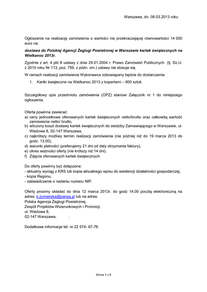 Warszawa, dn. 08.03.2013 roku Ogłoszenie na realizację zamówienia o wartości nie przekraczającej równowartości 14 000 euro na: dostawa do Polskiej Agencji Żeglugi Powietrznej w Warszawie kartek świątecznych na Wielkanoc 2013r. Zgodnie z art. 4 pkt 8 ustawy z dnia 29.01.2004 r. Prawo Zamówień Publicznych (tj. Dz.U. z 2010 roku Nr 113, poz. 759, z późn. zm.) ustawy nie stosuje się. W ramach realizacji zamówienia Wykonawca zobowiązany będzie do dostarczenia: 1. Kartki świąteczne na Wielkanoc 2013 z kopertami – 600 sztuk Szczegółowy opis przedmiotu zamówienia (OPZ) stanowi Załącznik nr 1 do niniejszego ogłoszenia. Oferta powinna zawierać: a) ceny jednostkowe oferowanych kartek świątecznych netto/brutto oraz całkowitą wartość zamówienia netto/ brutto, b) wliczony koszt dostawy kartek świątecznych do siedziby Zamawiającego w Warszawie, ul. Wieżowa 8, 02-147 Warszawa, c) najkrótszy możliwy termin realizacji zamówienia (nie później niż do 19 marca 2013 do godz. 13.00), d) warunki płatności (preferujemy 21 dni od daty otrzymania faktury), e) okres ważności oferty (nie krótszy niż 14 dni). f) Zdjęcia oferowanych kartek świątecznych Do oferty powinny być dołączone: - aktualny wyciąg z KRS lub kopia aktualnego wpisu do ewidencji działalności gospodarczej, - kopia Regonu, - zaświadczenie o nadaniu numeru NIP. Oferty prosimy składać do dnia 12 marca 2013r. do godz 14.00 pocztą elektroniczną na adres: [email protected] lub na adres: Polska Agencja Żeglugi Powietrznej, Zespół Projektów Wizerunkowych i Promocji, ul. Wieżowa 8, 02-147 Warszawa, . Dodatkowe informacje tel. nr 22 574- 67-76. Strona 1 z 2 Załącznik nr 1 do ogłoszenia Szczegółowy opis przedmiotu zamówienia (OPZ): Kartka świąteczna z motywem wielkanocnym (preferowane jajka wielkanocne - pisanki) - kwadratowa, format min. 135 x 135 mm, - okładka – papier ekologiczny, czerpany, możliwe tłoczenie lub/i wycięcia laserowe lub/i folia, bez napisów - wklejka podwójna z życzeniami i logo, - koperta samoklejąca - wliczony koszt transportu do siedziby Zamawiającego Ilość: 600 sztuk Strona 2 z 2