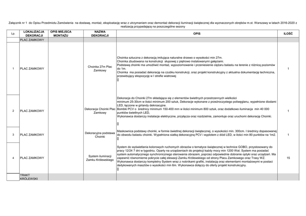 Załącznik nr 1 do Opisu Przedmiotu Zamówienia na dostawę, montaż, eksploatację wraz z utrzymaniem oraz demontaż dekoracji iluminacji świątecznej dla wyznaczonych obrębów m.st. Warszawy w latach 2016-2020 z realizacją przypadającą na poszczególne sezony Lp. 1 2 LOKALIZACJA DEKORACJI PLAC ZAMKOWY PLAC ZAMKOWY PLAC ZAMKOWY OPIS MIEJSCA MONTAŻU NAZWA DEKORACJI Choinka 27m Plac Zamkowy OPIS Choinka sztuczna z dekoracją imitująca naturalne drzewo o wysokości min 27m. Choinka zbudowana na konstrukcji słupowej z piętrowo instalowanymi gałęziami. Podstawą choinki ma umożliwić montaż, wypoziomowanie i przeniesienie ciężaru balastu na terenie z różnicą poziomów do 1m. Choinka ma posiadać dekorację na czubku konstrukcji, oraz projekt konstrukcyjny z aktualna dokumentację techniczna, przewidujący ekspozycję w I strefie wiatrowej [] Dekoracja do Choinki 27m składająca się z elementów świetlnych przestrzennych wielkości minimum 25-30cm w ilości minimum 200 sztuk, Dekoracje wykonane z przeźroczystego poliwęglanu, wypełnione diodami LED, łączone w girlandy dekroacyjne. Dekoracja Choinki Plac Bombki PCV o średnicy minimum 150-400 mm w ilości minimum 800 sztuk, oraz dodatkowo iluminacja min 40 000 Zamkowy punktów świetlnych LED, Wykonawca dostarczy instalacje elektryczne, przyłącza oraz rozdzielnie, zamontuje oraz uruchomi dekorację Choinki. ILOŚĆ 1 1 [] 3 4 PLAC ZAMKOWY PLAC ZAMKOWY TRAKT KRÓLEWSKI Maskownica podstawy choinki, w formie świetlnej dekoracji świątecznej, o wysokości min. 300cm. I średnicy dopasowanej Dekoracyjna podstawa do obwodu balastu choinki. Wypełniona siatką dekoracyjną PCV i wyplotem z diód LED, w ilości min 80 punktów na 1m2. Choinki [] System iluminacji Zamku Królewskiego System do wyświetlania kolorowych ruchomych obrazów o tematyce świątecznej w technice GOBO, przystosowany do pracy 12/24 7 dni w tygodniu. Oparty na urządzeniach do projekcji każdy mocy min 1200 Wat. System ma posiadać system automatycznego synchronicznego sterowania obrazem, poprzez odpowiednie dobranie optyki oraz urządzeń. Ma zapewnić równomierne pokrycie całej elewacji Zamku Królewskiego od strony Placu Zamkowego oraz Trasy WZ. Wykonawca dostarczy kompletny System wraz z nośnikami grafiki, instalacją oraz elementami montażowymi w postaci dedykowanych masztów o wysokości min 6m. Wykonawca dołączy do oferty projekt konstrukcyjny. [] 1 15 6 KRAKOWSKIE PRZEDMIESCIE + PLAC ZAMKOWY 7 SKWER HOVERA DEKORACJA DUŻYCH DRZEW 8 DEKORACJA WOLNOSTOJACA KRAKOWSKIE PRZEDMIEŚCIE/KA ROWA 9 DEKORACJA DRZEW KRAKOWSKIE PRZEDMIESCIE 10 DEKORACJA WOLNOSTOJACA KOŁO PAŁACU STASZICA 11 RONDO DE GAULLE'A 12 NOWY ŚWIAT - DO PL TRZECH KRZYŻY 13 PLAC TRZECH KRZYŻY słup latarniowy 9m latarniowa 3D Dekoracja latarniowa przestrzenna 3D iluminowana diodami LED, minimum 3000 punktów LED, okalająca słup latarniowy, wysokość min. 400 cm, szerokość min. 130 cm, z systemem sterowania radiowego. Dekoracja na konstrukcji aluminiowej spawanej TIG z odpowiednio dobranymi elementami mocującymi, Osprzętem elektrycznym oraz zabezpieczeniem nadprądowym. [] 130 dekoracja drzew Dekoracja dużych drzew na Skwerze, w systemie owijania pni i konarów, min. 24 000 punktów świetlnych LED z możliwością płynnej zmiany barwy światła. Należy zastosować oświelenie umożliwiające sterowaniem kolorów minmum dwóch kolorów w diodzie LED. [] 5 Przestrzenna dekoracja świetlna 3D o charakterze świątecznym, iluminowana lampkami LED, minium 5000 punktów świetlnych LED, konstrukcja aluminiowa wysokość minimum 4,5 m. Dekoracja nawiązująca do wzorów zaczerpniętych ze stylistyki i charakteru Traktu Królewskiego. Dekoracja na konstrukcji aluminiowej spawanej TIG z odpowiednio dobranymi elementami mocującymi, Osprzętem elektrycznym oraz zabezpieczeniem nadprądowym. [] 1 Dekoracja drzew na Krakowskim Przedmieściu, w systemie owijania pni i konarów, 1 drzewo minimum 1400 punktów świetlnych LED z możliwością płynnej zmiany barwy światła. Należy zastosować oświelenie umożliwiające sterowaniem kolorów minmum dwóch kolorów w diodzie LED. System sterowania radiowego. Dekoracja z osprzętem elektrycznym oraz zabezpieczeniem nadprądowym. [] 65 Przestrzenna dekoracja świetlna 3D o charakterze świątecznym, iluminowana lampkami LED, minium 5000 punktów świetlnych LED, konstrukcja aluminiowa wysokość minimum 4,5 m. Dekoracja nawiązująca do wzorów zaczerpniętych ze stylistyki i charakteru Traktu Królewskiego. Dekoracja na konstrukcji aluminiowej spawanej TIG z odpowiednio dobranymi elementami mocującymi, Osprzętem elektrycznym oraz zabezpieczeniem nadprądowym. [] 1 latarniowa 2D lub 3D Dekoracja latarniowa o charakterze świątecznym, przestrzenna iluminowana diodami LED, minimum 3000 punktów LED, okalająca słup latarniowy, wysokość min. 400 cm, średnica min. 160 cm, z systemem sterowania radiowego Dekoracja na konstrukcji aluminiowej spawanej TIG z odpowiednio dobranymi elementami mocującymi, Osprzętem elektrycznym oraz zabezpieczeniem nadprądowym. [] 6 latarniowa 2D lub 3D Dekoracja latarniowa o charakterze świątecznym, przestrzenna iluminowana diodami LED, minimum 3000 punktów LED okalająca słup latarniowy, wysokość min. 350 cm, średnica min. 120 cm, z systemem sterowania radiowego. Dekoracja na konstrukcji aluminiowej spawanej TIG z odpowiednio dobranymi elementami mocującymi, Osprzętem elektrycznym oraz zabezpieczeniem nadprądowym. [] 4 latarniowa 2D lub 3D Dekoracja latarniowa o charakterze świątecznym, przestrzenna iluminowana diodami LED, minimum 3000 punktów LED, okalająca słup latarniowy, wysokość min. 350 cm, średnica min. 120 cm, z systemem sterowania radiowego. Dekoracja na konstrukcji aluminiowej spawanej TIG z odpowiednio dobranymi elementami mocującymi, Osprzętem elektrycznym oraz zabezpieczeniem nadprądowym. [] 25 ARANŻACJA I 3D dekoracja drzew ARANŻACJA II 3D słup latarniowy 