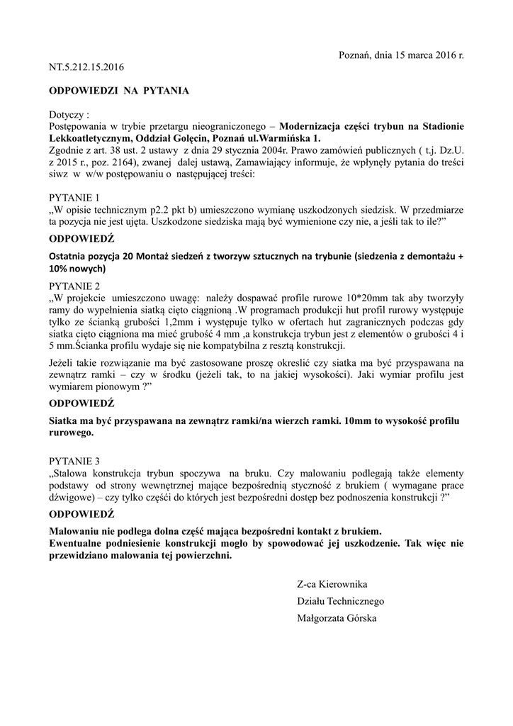 Poznań, dnia 15 marca 2016 r. NT.5.212.15.2016 ODPOWIEDZI NA PYTANIA Dotyczy : Postępowania w trybie przetargu nieograniczonego – Modernizacja części trybun na Stadionie Lekkoatletycznym, Oddział Golęcin, Poznań ul.Warmińska 1. Zgodnie z art. 38 ust. 2 ustawy z dnia 29 stycznia 2004r. Prawo zamówień publicznych ( t.j. Dz.U. z 2015 r., poz. 2164), zwanej dalej ustawą, Zamawiający informuje, że wpłynęły pytania do treści siwz w w/w postępowaniu o następującej treści: PYTANIE 1 „W opisie technicznym p2.2 pkt b) umieszczono wymianę uszkodzonych siedzisk. W przedmiarze ta pozycja nie jest ujęta. Uszkodzone siedziska mają być wymienione czy nie, a jeśli tak to ile?” ODPOWIEDŹ Ostatnia pozycja 20 Montaż siedzeń z tworzyw sztucznych na trybunie (siedzenia z demontażu + 10% nowych) PYTANIE 2 „W projekcie umieszczono uwagę: należy dospawać profile rurowe 10*20mm tak aby tworzyły ramy do wypełnienia siatką cięto ciągnioną .W programach produkcji hut profil rurowy występuje tylko ze ścianką grubości 1,2mm i występuje tylko w ofertach hut zagranicznych podczas gdy siatka cięto ciągniona ma mieć grubość 4 mm ,a konstrukcja trybun jest z elementów o grubości 4 i 5 mm.Ścianka profilu wydaje się nie kompatybilna z resztą konstrukcji. Jeżeli takie rozwiązanie ma być zastosowane proszę okreslić czy siatka ma być przyspawana na zewnątrz ramki – czy w środku (jeżeli tak, to na jakiej wysokości). Jaki wymiar profilu jest wymiarem pionowym ?” ODPOWIEDŹ Siatka ma być przyspawana na zewnątrz ramki/na wierzch ramki. 10mm to wysokość profilu rurowego. PYTANIE 3 „Stalowa konstrukcja trybun spoczywa na bruku. Czy malowaniu podlegają także elementy podstawy od strony wewnętrznej mające bezpośrednią styczność z brukiem ( wymagane prace dźwigowe) – czy tylko częśći do których jest bezpośredni dostęp bez podnoszenia konstrukcji ?” ODPOWIEDŹ Malowaniu nie podlega dolna część mająca bezpośredni kontakt z brukiem. Ewentualne podniesienie konstrukcji mogło by spowodować jej uszkodzenie. Tak więc nie przewidziano malowania tej powierzchni. Z-ca Kierownika Działu Technicznego Małgorzata Górska
