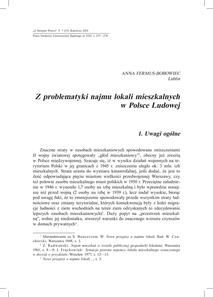 „Z Dziejów Prawa”. T. 7 (15). Katowice 2014 Prace Naukowe Uniwersytetu Śląskiego nr 3325, s. 257—278 Anna Fermus-Bobowiec Lublin Z problematyki najmu lokali mieszkalnych w Polsce Ludowej 1. Uwagi ogólne Znaczne straty w zasobach mieszkaniowych spowodowane zniszczeniami II wojny światowej spotęgowały „głód mieszkaniowy”1, obecny już zresztą w Polsce międzywojennej. Szacuje się, iż w wyniku działań wojennych na terytorium Polski w jej granicach z 1945 r. zniszczeniu uległo ok. 3 mln. izb mieszkalnych. Strata urasta do wymiaru katastrofalnej, jeśli dodać, że jest to ilość odpowiadająca pięciu miastom wielkości przedwojennej Warszawy, czy też połowie zasobu mieszkalnego miast polskich w 1950 r. Przeciętne zaludnienie w 1946 r. wynosiło 1,7 osoby na izbę mieszkalną i było wprawdzie mniejsze niż przed wojną (2 osoby na izbę w 1939 r.), lecz nadal wysokie, biorąc pod uwagę fakt, że to zmniejszenie spowodowały przede wszystkim straty ludnościowe oraz zmiany terytorialne, których konsekwencją były z kolei migracje ludności z ziem wschodnich na teren ziem odzyskanych (o zdecydowanie lepszych zasobach mieszkaniowych)2. Duży popyt na „przestrzeń mieszkalną”, wobec jej niedostatku, stworzył warunki do znacznego wzrostu czynszów w domach prywatnych3. Sformułowanie za S. B a n c e r z e m. W: Nowe przepisy o najmie lokali. Red. W. Cz a ch ó r s k i. Warszawa 1948, s. 3. 2 Z. R a d w a ń s k i: Najem mieszkań w świetle publicznej gospodarki lokalami. Warszawa 1961, s. 8—9; J. Fr ą ckow i a k: Sytuacja prawna najemcy lokalu mieszkalnego oznaczonego w decyzji o przydziale. Wrocław 1977, s. 12—13. 3 Nowe przepisy o najmie lokali…, s. 3. 1 258 Anna Fermus-Bobowiec Sytuacja mieszkaniowa w Polsce po II wojnie światowej wymagała więc z pewnością interwencji państwa, a formy prawne tej interwencji wpisują się doskonale w ideologię i zasady ustrojowe państw demokracji ludowej. Oczywiście, założeniem polityki mieszkaniowej była odbudowa zniszczonych domów i budowa nowych, czemu dały wyraz dekrety: z dnia 26 października 1945 r. o rozbiórce i naprawie budynków zniszczonych i uszkodzonych wskutek wojny4 oraz z dnia 3 lipca 1947 o popieraniu budownictwa5. Nie rozwiązywały one jednak bieżącego niedoboru mieszkań, a ich realizacja mogła być odczuwalna dopiero w przyszłości. Stąd zasadniczym celem polityki mieszkaniowej było znalezienie rozwiązań prawnych regulujących zasady gospodarowania istniejącym zasobem mieszkaniowym i chroniących zarazem interesy „człowieka pracy”. Punktem wyjścia stały się tu rozważania Fryderyka Engelsa, który w swojej publikacji, zatytułowanej W kwestii mieszkaniowej, wskazywał, iż racjonalne gospodarowanie istniejącymi budynkami mieszkalnymi poprzez wywłaszczenia obecnych właścicieli, względnie dokwaterowania, pozwoli zażegnać „głód mieszkaniowy”6. Rozwiązanie kwestii mieszkaniowej w Polsce Ludowej wpisuje się zatem także w problematykę własności prywatnej w ustroju komunistycznym, której zniesienie uznawano za podstawową zasadę komunizmu. Fryderyk Engels głosił przy tym konieczność zastąpienia własności prywatnej wspólnością własności, polegającą na wspólnym użytkowaniu wszystkich narzędzi produkcji oraz podziale produktów na podstawie wspólnego porozumienia7. Zakładano przy tym stopniowe znoszenie własności prywatnej, w szczególności poprzez jej ograniczanie8 i nakładanie na właścicieli prywatnych dodatkowych obowiązków9. Ten kierunek przybrało także polskie ustawodawstwo, które nie zniosło własności prywatnej, lecz znacznie ją ograniczyło, traktując ją jako własność kapitalistyczną10, „gorszą”, słabiej chronioną prawnie11. Dz.U. z 1947 r., Nr 37, poz. 181; Nowe przepisy o najmie lokali…, s. 3. Dz.U. Nr 52, poz. 270; Nowe przepisy o najmie lokali…, s. 3. 6 F. E n gel s: W kwestii mieszkaniowej. Warszawa 1949, s. 38. 7 F. E n gel s: Zasady komunizmu. Warszawa 1949, s. 23. 8 Ibidem, s. 25—26. 9 A. M a ch n i kow s k a: Prawo własności w Polsce w latach 1944—1981. Studium historycznoprawne. Gdańsk 2010, s. 47. 10 Własność prywatna nazywana była własnością burżuazyjną albo kapitalistyczną — F. E n gel s: Zasady…, s. 24. 11 W Polsce Ludowej nastąpiło odejście od jednolitego, indywidualistycznego pojmowania własności, charakterystycznego dla kapitalizmu na rzecz marksistowskiej koncepcji dyferencjacji własności, która swój wyraz znalazła w Konstytucji PRL i kodeksie cywilnym. Wyróżniano mianowicie: własność społeczną, własność indywidualną (prywatną) oraz własność osobistą. Własność społeczna była albo własnością ogólnonarodową, albo własnością grupową, tj. własnością spółdzielczą lub własnością innych organizacji społecznych ludu pracującego. Z kolei własność indywidualna dzieliła się na własność kapitalistyczną i własność drobnych wytwórców (w zależności od tego, czy właściciel opierał produkcję na pracy osobistej, czy na 4 5 Z problematyki najmu lokali mieszkalnych w Polsce Ludowej 259 Formą ograniczenia własności prywatnej stało się także wyłączenie z zakresu uprawnień właścicielskich możliwości dysponowania lokalem mieszkalnym oraz określania zasad korzystania z niego; przekazanie tych uprawnień administracji państwowej12. Było to „naturalną” konsekwencją przyjęcia w prawie socjalistycznym założenia, że prawo własności ma pełnić rolę służebną wobec społeczeństwa i realizować interes społeczny. Własność prywatna, określana w Polsce Ludowej mianem własności indywidualnej13, której przedmiotem były w szczególności nieznacjonalizowane prywatne domy czynszowe14, musiała być więc wykonywana z uwzględnieniem tego interesu15, a zatem także w sposób umożliwiający zaspokojenie potrzeb mieszkaniowych. Celowi temu został w ustawodawstwie Polski Ludowej przyzn