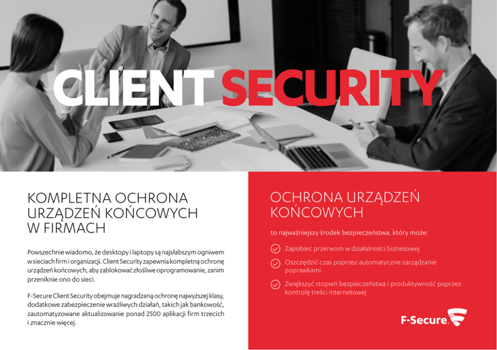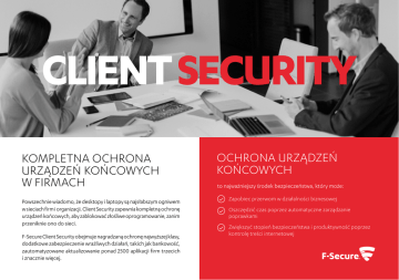 Client Security Kompletna ochrona urządzeń końcowych w firmach Powszechnie wiadomo, że desktopy i laptopy są najsłabszym ogniwem w sieciach firm i organizacji. Client Security zapewnia kompletną ochronę urządzeń końcowych, aby zablokować złośliwe oprogramowanie, zanim przeniknie ono do sieci. F-Secure Client Security obejmuje nagradzaną ochronę najwyższej klasy, dodatkowe zabezpieczenie wrażliwych działań, takich jak bankowość, zautomatyzowane aktualizowanie ponad 2500 aplikacji firm trzecich i znacznie więcej. Ochrona urządzeń końcowych to najważniejszy środek bezpieczeństwa, który może: Zapobiec przerwom w działalności biznesowej Oszczędzić czas poprzez automatyczne zarządzanie poprawkami Zwiększyć stopień bezpieczeństwa i produktywność poprzez kontrolę treści internetowej Client Security Znacznie więcej, niż ochrona urządzeń końcowych Oprócz kompletnej ochrony urządzeń końcowych, Client Security oszczędza czas poprzez automatyczne zarządzanie poprawkami i zwiększa produktywność pracowników poprzez kontrolowanie przeglądanych stron. Client Security* oferuje: Software Updater Automatycznie aktualizuje oprogramowanie Microsoftu i ponad 2500 aplikacji firm trzecich. DeepGuard Inteligentny silnik, chroniący przed złośliwym oprogramowaniem, który potrafi wykrywać ataki dnia zerowego. Web Content Control Zwiększa bezpieczeństwo i produktywność poprzez kontrolowany dostęp do witryn. Administrator może blokować dostęp do witryn według kategorii. Connection Control Aktywuje dodatkowe zabezpieczenia podczas wrażliwych transakcji, takich jak bankowość internetowa. Ochrona w czasie rzeczywistym F-Secure Security Cloud oferuje ochronę przed nowym złośliwym oprogramowaniem, ponieważ może wykorzystać informacje o zagrożeniach napotkanych przez inne chronione komputery, przez co reakcja jest znacznie bardziej skuteczna. Wielosilnikowa ochrona przed złośliwym oprogramowaniem Zapewnia wysoki stopień bezpieczeństwa poprzez liczne mechanizmy ochrony przed złośliwym oprogramowaniem. *Rozwiązanie Client Security jest dostępne w dwóch wersjach, Premium i Standard Zapora sieciowa Dodatkowa warstwa ochrony współdziała dynamicznie z kontrolą aplikacji. Browsing Protection Aktywnie zapobiega dostępowi do szkodliwych witryn za pośrednictwem złośliwych łączy lub treści. Device Control Kontroluje dostęp do urządzeń USB. Botnet Control Uniemożliwia przestępcom kontrolowanie komputerów, do których udało im się włamać, poprzez blokowanie komunikacji z domenami serwerów dowodzenia.