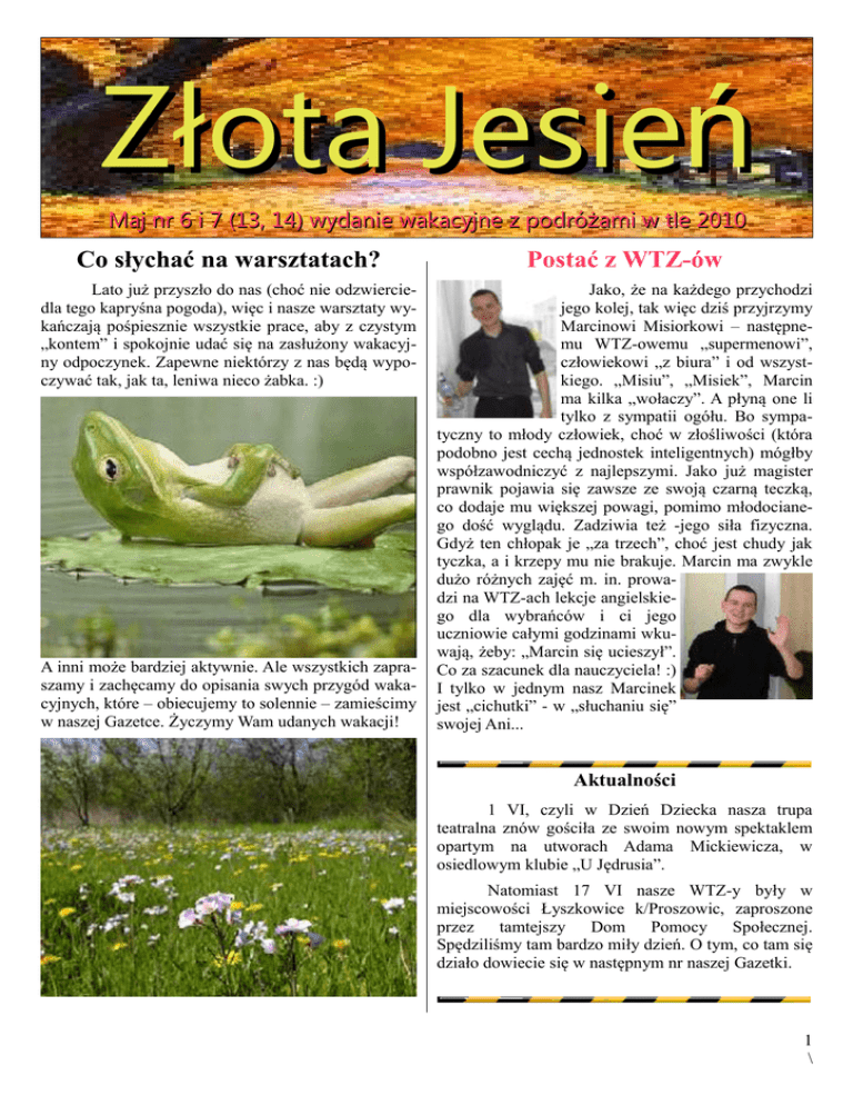 Złota Jesień Maj nr 6 i 7 (13, 14) wydanie wakacyjne z podróżami w tle 2010 Co słychać na warsztatach? Postać z WTZ-ów Lato już przyszło do nas (choć nie odzwierciedla tego kapryśna pogoda), więc i nasze warsztaty wykańczają pośpiesznie wszystkie prace, aby z czystym „kontem” i spokojnie udać się na zasłużony wakacyjny odpoczynek. Zapewne niektórzy z nas będą wypoczywać tak, jak ta, leniwa nieco żabka. :) Jako, że na każdego przychodzi jego kolej, tak więc dziś przyjrzymy Marcinowi Misiorkowi – następnemu WTZ-owemu „supermenowi”, człowiekowi „z biura” i od wszystkiego. „Misiu”, „Misiek”, Marcin ma kilka „wołaczy”. A płyną one li tylko z sympatii ogółu. Bo sympatyczny to młody człowiek, choć w złośliwości (która podobno jest cechą jednostek inteligentnych) mógłby współzawodniczyć z najlepszymi. Jako już magister prawnik pojawia się zawsze ze swoją czarną teczką, co dodaje mu większej powagi, pomimo młodocianego dość wyglądu. Zadziwia też -jego siła fizyczna. Gdyż ten chłopak je „za trzech”, choć jest chudy jak tyczka, a i krzepy mu nie brakuje. Marcin ma zwykle dużo różnych zajęć m. in. prowadzi na WTZ-ach lekcje angielskiego dla wybrańców i ci jego uczniowie całymi godzinami wkuwają, żeby: „Marcin się ucieszył”. Co za szacunek dla nauczyciela! :) I tylko w jednym nasz Marcinek jest „cichutki” - w „słuchaniu się” swojej Ani... A inni może bardziej aktywnie. Ale wszystkich zapraszamy i zachęcamy do opisania swych przygód wakacyjnych, które – obiecujemy to solennie – zamieścimy w naszej Gazetce. Życzymy Wam udanych wakacji! Aktualności 1 VI, czyli w Dzień Dziecka nasza trupa teatralna znów gościła ze swoim nowym spektaklem opartym na utworach Adama Mickiewicza, w osiedlowym klubie „U Jędrusia”. Natomiast 17 VI nasze WTZ-y były w miejscowości Łyszkowice k/Proszowic, zaproszone przez tamtejszy Dom Pomocy Społecznej. Spędziliśmy tam bardzo miły dzień. O tym, co tam się działo dowiecie się w następnym nr naszej Gazetki. 1 \ „Wędrówką jedną życie jest człowieka...” „Szukajcie prawdy jasnego płomienia, Szukajcie nowych, nieodkrytych dróg”. Tak wołał poeta, Adam Asnyk. I dla mnie jest to wielkie wezwanie do wędrówki przed siebie, w nowe, nieznane, czyli jeszcze nieodkryte przeze mnie światy. Ja kocham wszelkie podróże po świecie, bo każda z nich pomaga mi też „zwiedzić” siebie, poznać swoje siły, możliwości, odwagę, otwartość na innych, a także pragnienia mego serca. Właściwie, to każdy z nas wędruje po swej drodze życia. „Tak naprawdę nie wiemy, co ciągnie człowieka w świat. Ciekawość? Głód przeżyć? Potrzeba nieustannego dziwienia się? Człowiek, który przestaje się dziwić, jest wydrążony, ma wypalone serce. W człowieku, który uważa, że wszystko już było i nic nie może go zdziwić, umarło to, co najpiękniejsze - uroda życia” – pisał znany publicysta, Ryszard Kapuściński. I myślę, że to właśnie „dziwienie się” światu, ludziom, jest takim „prądem”, który pcha nas ku wędrowaniu. Wędrówka jest inspiracją dla wielu pisarzy. W literaturze pięknej znajdziemy jej wiele. Stanowi ona temat do refleksji i dyskusji. Podejmowana, często dla poznania sensu istnienia, odkrycia tego co nieznane, staje się głównym celem w życiu człowieka, a nawet najważniejszą jego częścią. Przypatrzmy się kilku z nich: o morskich podróżach Udaje mu się zrealizować swoje marzenia, w dodatku dociera do krain, których nie znają inni marynarze. Najpierw przybywa do kraju Liliputów, karłów. Tam dowiaduje się, jak to jest być olbrzymem, odkrywa że w miniaturowym świecie panują te same prawa, co w jego rzeczywistości. Następna podróż kończy się lądowaniem w kraju olbrzymów. Tu Guliwer ma okazję poznać swoją słabość, dowiaduje się co to znaczy być uzależnionym od innych, być zabawką w ich rękach. Ze swoich podróży bohater wraca bogatszy w doświadczenie, wiedzę o sobie i świecie. Potrafi też docenić wartość rodziny i domu. Natomiast w „Małym Księciu” Antoinego SaintExpery’ego bohater podróżuje, aby się czegoś nauczyć i zdobyć przyjaciół. Dzięki swej podróży Mały Książe dowiaduje się więcej o sobie i ludziach. Zawarł prawdziwe przyjaźnie. Poszerzył swoją dotychczasową wiedzę. Poznał wartość przyjaźni: „oswoić znaczy stworzyć więzy”. Dowiedział się, że przyjaźń to świadomy wybór, trzeba umieć ją szanować, bo dzięki niej życie nabiera blasku. A przy tym wszystkim trzeba być cierpliwym, bo wymaga ona czasu. Wędrówka jest traktowana jako symbol życia, jego kolejne etapy, nowe doświadczenia. Czy zgodzimy się z tym stwierdzeniem, iż „wędrowanie pozwala odkryć prawdę o sobie i innych ludziach”. Dzięki wędrówce poznajemy świat. Z czasem mamy własną opinię o ludziach i tym, co nas otacza. „Wszystkie dni stają się takie same wtedy, kiedy ludzie przestają dostrzegać to wszystko, czym obdarowuje ich los, podczas gdy słońce wędruje po niebie” Paulo Coelho. „Odyseja” Homera. Odyseusz, w czasie powrotu z wojny do rodzinnej Itaki, przeżywa wiele przygód. Każda z nich oraz upór w dążeniu do celu, pomaga mu w zdobywaniu doświadczenia. W swojej dziesięcioletniej podróży nauczył się podejmować ważne decyzje oraz dokonywać trudnych wyborów. Dzięki tej podróży odczuł smak zarówno radości jak i cierpienia. Podczas swojej tułaczki odwiedził wiele miejsc, poznał ludzi, a przede wszystkim samego siebie. Tytułowy bohater „Podróży Guliwera” marzy 2 \ Elżbieta Boduch Rozpoczynamy niniejszym nowy cykl artykułów opisujących inne (sąsiednie i nie tylko) państwa. Poznamy po trochu ich historię, kulturę i ciekaw miejsca, warte zwiedzenia. Kto wie, może kiedyś wybierzemy się tam... Holandia Historia: W starożytności Holandię zamieszkiwał