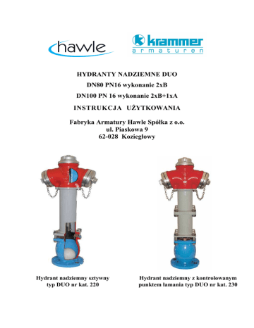 HYDRANTY NADZIEMNE DUO DN80 PN16 wykonanie 2xB DN100 PN 16 wykonanie 2xB+1xA INSTRUKCJA UŻYTKOWANIA Fabryka Armatury Hawle Spółka z o.o. ul. Piaskowa 9 62-028 Koziegłowy Hydrant nadziemny sztywny typ DUO nr kat. 220 Hydrant nadziemny z kontrolowanym punktem łamania typ DUO nr kat. 230 Spis treści : 1. INSTRUKCJA MONTAŻU 2. INSTRUKCJA OBSŁUGI 3. KONTAKT 1. INSTRUKCJA MONTAŻU Hydranty firmy Krammer przed wysłaniem są poddawane badaniom ciśnieniowym oraz sprawdzane pod względem działania. Dostarczane są w stanie gotowym do montażu. Przed hydrantem na przewodzie doprowadzającym zalecamy zabudować armaturę zaporową (zasuwę). Pozwala to przeprowadzić montaż lub wymianę części hydrantu bez przerywania zasilania w wodę pozostałej części sieci. Przed montażem należy w wykopie odpowiednio przygotować powierzchnię posadowienia hydrantu i zwrócić uwagę na jego głębokość zabudowy. Przy hydrancie zabezpieczonym w przypadku złamania (typ C) miejsce łamania powinno znajdować się 6 - 10 cm ponad poziomem terenu. Montaż przeprowadza się najczęściej na łuku kołnierzowym ze stopką o średnicy odpowiedniej do średnicy hydrantu, który zapewnia prawidłowe ustawienie hydrantu. Kolano ze stopką powinno być mocno zakotwione, a powierzchnia kołnierza musi być idealnie pozioma, aby hydrant został zabudowany pionowo. Hydranty DUO posiadają osadzoną w cokole uszczelkę kołnierzową oraz luźny kołnierz, które ułatwiają ich montaż i odpowiednie ustawienie położenia nasad. Do połączenia kołnierza hydrantu z łukiem kołnierzowym należy stosować śruby zabezpieczone przed korozją, które powinno się przykręcać równomiernie na krzyż. Następnie hydrant należy odpowiednio podeprzeć i wykonać jego odwodnienie. Konieczne, samoczynne opróżnienie kolumny hydrantu, zapewniające zabezpieczenie kolumny przed zamarzaniem zależy od prawidłowego systemu odprowadzenia wody z odwodnienia. Zalecane są trzy sposoby wykonania odprowadzania wody: - podsypka odsączająca, - odpompowywanie hydrantu. Podsypka odsączająca Wykonanie podsypki odsączającej jest sensowne w przypadku, gdy: − leżące poniżej warstwy gruntu przepuszczają wodę, − najwyższy poziom wody gruntowej leży poniżej podsypki odsączającej, − nie może wystąpić zamulenie lub zarośnięcie sączka. Podsypka odsączająca składa się z ok. 0,5 m3 nieagresywnego materiału umieszczonego przed i pod otworem spustowym (żwir, tłuczeń). Powyżej ze względu na niebezpieczeństwo zamarznięcia gruntu należy umieścić materiał pozbawiony kamieni, żwiru i gliny. Założenie sączka jest także konieczne przy zastosowaniu kamieni przesączających i pozwala szybko i bez przeszkód odprowadzić wodę z obszaru hydrantu lub przewodu. Odpompowanie hydrantu W przypadku, kiedy nie można zastosować ani odsączania ani odprowadzenia wody do studzienki spustowej, konieczne jest odpompowanie zamkniętej kolumny hydrantu, co jest niezbędne dla zapobieżenia zamarznięciu. Otwiera się wówczas odpływ i wypompowuje wodę z kolumny poprzez wystarczająco długi wąż ssący i pompę. W tym przypadku, należy zwrócić szczególną uwagę, aby nie spowodować przedostania się zanieczyszczeń do wnętrza hydrantu. Po wykonaniu odpowiedniego odwodnienia hydrantu należy zasypać wykop. Hydranty zabezpieczone w przypadku złamania (typ C) należy dobrze podeprzeć na powierzchni terenu przed działaniem sił poziomych pod płaszczyzną przewidzianego złamania. Zalecamy wykonanie płyty betonowej lub asfaltowej na zagęszczonym podłożu z tłucznia poniżej miejsca łamania. Jeżeli podparcie jest niedostateczne, wówczas w przypadku poziomego uderzenia w hydrant nie nastąpi zerwanie przewidzianych do tego śrub w miejscu łamania, lecz zostanie uszkodzony dolny kołnierz lub kolano kołnierzowe ze stopką. 2. INSTRUKCJA OBSŁUGI Hydranty nadziemne są zabezpieczone przed działaniem mrozu jedynie przy nienagannym odwodnieniu kolumny hydrantu. Odwodnienie kolumny hydrantu jest dopiero możliwe, kiedy został on całkowicie zamknięty. Zamykanie hydrantu - zgodnie z ruchem wskazówek zegara – należy kontynuować (nawet po zaniku odgłosu przepływu wody) aż do momentu wystąpienia sprężystego, silnego oporu. Kontrola odwadniania hydrantu jest najpewniejsza poprzez sprawdzenie odgłosu odprowadzanej wody. W wypadku najechania lub przejechania hydrantu zabezpieczonego w przypadku złamania w normalnych warunkach nie powstają szkody w hydrancie, ani w rurociągu. Śruby nacięte pękają w miejscu łamania i górną część odłącza się od dolnej części hydrantu. Dzięki położeniu wrzeciona poniżej miejsca łamania, wypływ wody z zamkniętego hydrantu jest wykluczony. Aby przywrócić działanie hydrantu nasadza się górną część przy zachowaniu odpowiedniego położenia nasad i wymienia pęknięte śruby na nowe. Śruby z miejscem łamania należy przykręcać równomiernie i na krzyż. Maksymalny moment dokręcania wynosi 22,8 ± 2 Nm! Po zmontowaniu hydrantu należy sprawdzić funkcjonowanie i szczelność hydrantu. Zalecamy przechowywanie na magazynie, co najmniej jednego kompletu (4 sztuk) śrub z miejscem łamania, oraz części zamiennych: tłoka uszczelniającego, zaworu napowietrzającego, kompletu uszczelek (pierścieni uszczelniających o przekroju okrągłym). Przeglądy techniczne i konserwacyjne Hydranty nadziemne DUO nie wymagają praktycznie konserwacji, zaleca się jednak, aby przynajmniej raz w ciągu roku przeprowadzić w następujący sposób przegląd technicznokonserwacyjny: - sprawdzić czy hydrant jest zamknięty, jeśli nie to należy go zamknąć, - sprawdzić czy zasuwa przed hydrantem jest otwarta, jeśli nie to należy powoli ją otworzyć, - skontrolować działanie hydrantu poprzez jego otwarcie i zamknięcie (sprawdzić łatwość otwierania i zamykania się hydrantu. Hydrant musi się otwierać i zamykać w sposób płynny i bez n
