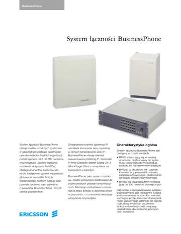 BusinessPhone System ³¹cznoœci BusinessPhone System ³¹cznoœci BusinessPhone oferuje mo¿liwoœci du¿ych systemów w oszczêdnym zestawie przeznaczonym dla ma³ych i œrednich organizacji potrzebuj¹cych od 8 do 200 numerów wewnêtrznych. System zapewnia mo¿liwoœæ do³¹czenia linii ISDN, obs³ugê abonentów bezprzewodowych, inteligentny system wiadomoœci g³osowych, wszystkie funkcje telefonicznego centrum obs³ugi oraz pozwala budowaæ sieci prywatne z systemów BusinessPhone i innych central abonenckich. Zintegrowana bramka (gateway) IP umo¿liwia stworzenie sieci prywatnej w ramach korporacyjnej sieci IP. BusinessPhone oferuje równie¿ zaawansowan¹ telefoniê IP i terminale IP firmy Ericsson; telefon Dialog 3413 i BackStage Client – nowy klient na komputerze osobistym. BusinessPhone, jako system modu³owy, mo¿na precyzyjnie dostosowaæ do zró¿nicowanych potrzeb komunikacyjnych. Mo¿na go rozbudowaæ i rozszerzyæ o nowe funkcje w dowolnej chwili w przysz³oœci, co uzasadnia inwestycje poczynione na pocz¹tku. Charakterystyka ogólna System ³¹cznoœci BusinessPhone jest dostêpny w trzech wersjach: BP50, mieszcz¹cy siê w zwartej obudowie, dostosowany do systemów telefonicznych wykorzystuj¹cych do 64 numerów wewnêtrznych. BP128i, w obudowie 19", zaprojektowany, aby pasowa³ do stojaka, zasilania rezerwowego i okablowania istniej¹cej infrastruktury ³¹cznoœci. BP250 dla organizacji/firmy wymagaj¹cej do 200 numerów wewnêtrznych. Ca³y sprzêt i oprogramowanie systemu BusinessPhone jest modu³owe. Mo¿na je dostosowywaæ w szerokim zakresie wymogów przepustowoœci i funkcjonalnoœci, zapewniaj¹c zdolnoœæ do dalszej rozbudowy systemu i dodawania funkcji w dowolnej chwili, znajduj¹c uzasadnienie dla wczeœniej poczynionych inwestycji. Rozwi¹zanie BusinessPhone oferuje zintegrowan¹ bramkê IP, któr¹ mo¿na wykorzystaæ do budowy sieci korporacyjnych opartych na protokole IP. BusinessPhone oferuje równie¿ zaawansowan¹ telefoniê IP przy u¿yciu terminali IP firmy Ericsson; telefon Dialog 3413 i BackStage Client – nowego klienta na komputerze osobistym. Mo¿liwoœci wewnêtrznej konfiguracji Dziêki ró¿nym kombinacjom modu³ów sprzêtu i oprogramowania, rdzeñ systemu BusinessPhone mo¿na skonfigurowaæ jako: bez stanowiska ³¹czeniowego (operatora) – uk³ad z liniami pod przyciski centralê abonenck¹ obs³ugiwan¹ przez operatora z podzia³em na dzier¿awców, s³u¿¹cy kilku firmom lub dzia³om system automatycznego rozdzia³u wywo³añ (ACD) dla centrum obs³ugi telefonicznej system obs³ugi goœci kombinacjê dowolnego z wy¿ej wymienionych. Dodatkowo dostêpne s¹ pakiety sieciowe BusinessPhone umo¿liwiaj¹ce tworzenie korporacyjnych cyfrowych sieci do przesy³u g³osu i danych, ³¹cz¹cych ró¿ne miejsca przy u¿yciu protoko³u IP i innych protoko³ów sieciowych. Us³uga sieciowa VoIP Rozwi¹zanie BusinessPhone VoIP pozwala na stworzenie sieci z dwóch 2 BusinessPhone 250 BusinessPhone 50 lub wiêcej systemów BusinessPhone i systemów central abonenckich, w³¹czaj¹c w to centralê MD110 firmy Ericsson, przez zintegrowan¹ bramkê VoIP w istniej¹cej infrastrukturze IP – w ten sposób oferuj¹c wspóln¹ transmisjê g³osu i danych – zamiast wykorzystywania ³¹czy dzier¿awionych tylko do przekazu g³osu. Obecnie ka¿da karta udostêpnia us³udze VoIP cztery, osiem lub szesnaœcie dwukierunkowych kana³ów. Sieæ zapewnia ca³kowit¹ przezroczystoœæ, ³¹cznie z us³ugami dodatkowymi. mi, z funkcj¹ wysy³ania krótkich wiadomoœci, rozmów grupowych, systemem przywo³awczym i alarmem. Firma Ericsson oferuje szerok¹ gamê telefonów analogowych jako uzupe³nienie telefonów cyfrowych BusinessPhone. Do systemu BusinessPhone mo¿na równie¿ pod³¹czaæ faksy i modemy. Telefonia IP BusinessPhone wykorzystuje stra¿nika (gatekeeper) H.323 do integracji abonentów IP BusinessPhone. Implementacja jest oparta na standardzie H.323 z dodatkowym rozszerzeniem firmowym obs³uguj¹cym terminale IP firmy Ericsson: Dialog 3413 – telefon ze wszystkimi funkcjami IP oraz BackStage iClient – klient PC. Terminale abonenckie BusinessPhone Dostêpna jest szeroka gama terminali abonenckich dostosowanych do ró¿nych organizacji i osób. Systemowe telefony cyfrowe oferuj¹ zaawansowan¹ telefoniê pracownikom biur. Dostêpne s¹ cztery modele: od podstawowego do dyrektorskiego. Rozbudowuj¹c system o modu³ ³¹cznoœci bezprzewodowej, mo¿emy wykorzystaæ ró¿norodne telefony bezprzewodowe takie jak modele biurowe oraz modele o wzmocnionej konstrukcji do u¿ytku poza budynka- Us³ugi operatora BusinessPhone mo¿e byæ oferowany z dwoma typami konsoli dla operatora, które mo¿na pod³¹czaæ przez standardowe gniazdo telefoniczne tak, aby konsole mo¿na by³o dodawaæ lub przenosiæ w inne miejsce: zaawansowane stanowisko operatora (OPS), konsola oparta na komputerze osobistym do obs³ugi i zarz¹dzania rozmowami telefon operatora Dialog 3214, specjalizowany lecz oszczêdny telefon systemowy z cyfrowym wyœwietlaczem i przyciskami szybkiego dostêpu do wiêkszoœci funkcji u¿ywanych przez operatora, z opcj¹ pozwalaj¹c¹ na dodanie czterech dodatkowych paneli z przyciskami, udostêpniaj¹cymi 68 programowalnych klawiszy. BusinessPhone 50 System BusinessPhone 50 jest pojedyncz¹ zwart¹ szafk¹ naœcienn¹ z piêcioma gniazdami kart mog¹cych pomieœciæ od oœmiu do 64 numerów wewnêtrznych. Szafka jest wyposa¿ona w wewnêtrzny zasilacz impulsowy, z opcj¹ zewnêtrznej baterii akumulatorów podtrzymuj¹cej zasilanie lub alternatywnego zasilacza pr¹du sta³ego. System BusinessPhone 50 jest szczególnie oszczêdny dla ma³ych biur. BusinessPhone 128i BusinessPhone 128i Rozmiary szafki umo¿liwiaj¹ monta¿ w stojakach 19-calowych, stanowi¹cych standard dla takich urz¹dzeñ ³¹cznoœci jak rutery, koncentratory sieciowe i wêz³y komutacyjne. To u³atwia jej instalacjê oraz integracjê z infrastruktur¹ ³¹cznoœci. BP128i ma 