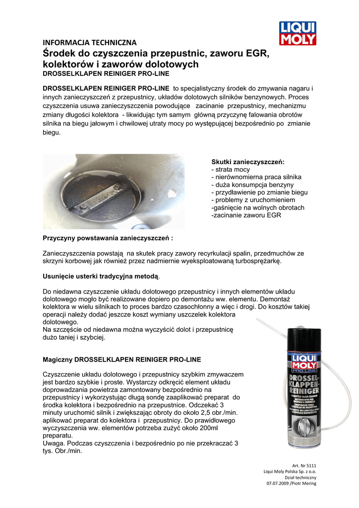 INFORMACJA TECHNICZNA Środek do czyszczenia przepustnic, zaworu EGR, kolektorów i zaworów dolotowych DROSSELKLAPEN REINIGER PRO-LINE DROSSELKLAPEN REINIGER PRO-LINE to specjalistyczny środek do zmywania nagaru i innych zanieczyszczeń z przepustnicy, układów dolotowych silników benzynowych. Proces czyszczenia usuwa zanieczyszczenia powodujące zacinanie przepustnicy, mechanizmu zmiany długości kolektora - likwidując tym samym główną przyczynę falowania obrotów silnika na biegu jałowym i chwilowej utraty mocy po występującej bezpośrednio po zmianie biegu. Skutki zanieczyszczeń: - strata mocy - nierównomierna praca silnika - duża konsumpcja benzyny - przydławienie po zmianie biegu - problemy z uruchomieniem -gaśnięcie na wolnych obrotach -zacinanie zaworu EGR Przyczyny powstawania zanieczyszczeń : Zanieczyszczenia powstają na skutek pracy zawory recyrkulacji spalin, przedmuchów ze skrzyni korbowej jak również przez nadmiernie wyeksploatowaną turbosprężarkę. Usunięcie usterki tradycyjna metodą. Do niedawna czyszczenie układu dolotowego przepustnicy i innych elementów układu dolotowego mogło być realizowane dopiero po demontażu ww. elementu. Demontaż kolektora w wielu silnikach to proces bardzo czasochłonny a więc i drogi. Do kosztów takiej operacji należy dodać jeszcze koszt wymiany uszczelek kolektora dolotowego. Na szczęście od niedawna można wyczyścić dolot i przepustnicę dużo taniej i szybciej. Magiczny DROSSELKLAPEN REINIGER PRO-LINE Czyszczenie układu dolotowego i przepustnicy szybkim zmywaczem jest bardzo szybkie i proste. Wystarczy odkręcić element układu doprowadzania powietrza zamontowany bezpośrednio na przepustnicy i wykorzystując długą sondę zaaplikować preparat do środka kolektora i bezpośrednio na przepustnice. Odczekać 3 minuty uruchomić silnik i zwiększając obroty do około 2,5 obr./min. aplikować preparat do kolektora i przepustnicy. Do prawidłowego wyczyszczenia ww. elementów potrzeba zużyć około 200ml preparatu. Uwaga. Podczas czyszczenia i bezpośrednio po nie przekraczać 3 tys. Obr./min. Art. Nr 5111 Liqui Moly Polska Sp. z o.o. Dział techniczny 07.07.2009 /Piotr Mering