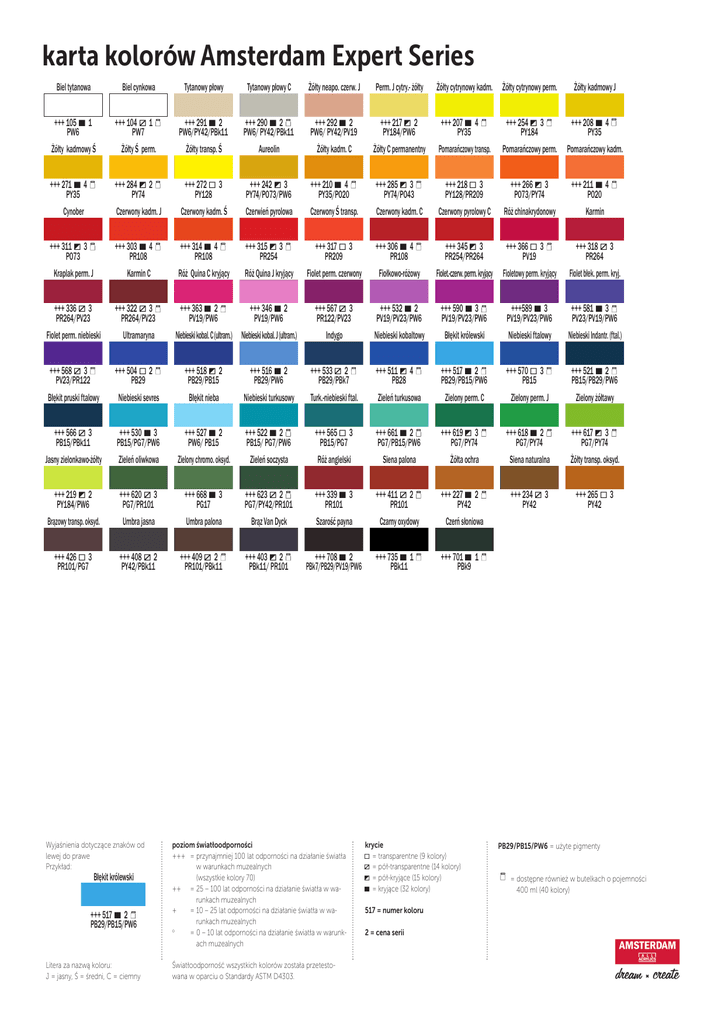karta kolorów Amsterdam Expert Series Biel tytanowa Biel cynkowa Tytanowy płowy Tytanowy płowy C Żółty neapo. czerw. J Perm. J cytry.- żółty +++ 105 4 1 PW6 +++ 104 2 1 PW7 +++ 291 4 2 PW6/PY42/PBk11 +++ 290 4 2 PW6/ PY42/PBk11 +++ 292 4 2 PW6/ PY42/PV19 +++ 217 3 2 PY184/PW6 +++ 271 4 4 PY35 +++ 284 3 2 PY74 Czerwony kadm. J +++ 272 1 3 PY128 Czerwony kadm. Ś +++ 242 3 3 PY74/PO73/PW6 Czerwień pyrolowa +++ 210 4 4 PY35/PO20 +++ 285 3 3 PY74/PO43 +++ 311 3 3 PO73 +++ 303 4 4 PR108 +++ 314 4 4 PR108 +++ 315 3 3 PR254 Róż Quina J kryjący +++ 317 1 3 PR209 Fiolet perm. czerwony +++ 306 4 4 PR108 +++ 346 4 2 PV19/PW6 +++ 567 2 3 PR122/PV23 +++ 532 4 2 PV19/PV23/PW6 +++ 590 4 3 PV19/PV23/PW6 +++589 4 3 PV19/PV23/PW6 Niebieski ftalowy Niebieski Indantr. (ftal.) +++ 511 3 4 PB28 +++ 517 4 2 PB29/PB15/PW6 +++ 570 1 3 PB15 +++ 521 4 2 PB15/PB29/PW6 +++ 618 4 2 PG7/PY74 +++ 617 3 3 PG7/PY74 Żółty kadmowy Ś Cynober Kraplak perm. J Żółty Ś perm. Karmin C Żółty transp. Ś Róż Quina C kryjący Żółty kadm. C Czerwony Ś transp. Żółty C permanentny Czerwony kadm. C Fiołkowo-różowy +++ 207 4 4 PY35 Pomarańczowy transp. +++ 218 1 3 PY128/PR209 Czerwony pyrolowy C +++ 345 3 3 PR254/PR264 +++ 322 2 3 PR264/PV23 +++ 568 2 3 PV23/PR122 +++ 504 1 2 PB29 +++ 518 3 2 PB29/PB15 Błękit nieba Niebieski turkusowy +++ 566 2 3 PB15/PBk11 +++ 530 4 3 PB15/PG7/PW6 Zieleń oliwkowa +++ 527 4 2 PW6/ PB15 Zielony chromo. oksyd. +++ 522 4 2 PB15/ PG7/PW6 +++ 565 1 3 PB15/PG7 +++ 661 4 2 PG7/PB15/PW6 +++ 619 3 3 PG7/PY74 +++ 219 3 2 PY184/PW6 +++ 620 2 3 PG7/PR101 +++ 668 4 3 PG17 +++ 623 2 2 PG7/PY42/PR101 +++ 339 4 3 PR101 +++ 411 2 2 PR101 +++ 227 4 2 PY42 +++ 426 1 3 PR101/PG7 +++ 408 2 2 PY42/PBk11 +++ 409 2 2 PR101/PBk11 +++ 403 3 2 PBk11/ PR101 +++ 708 4 2 PBk7/PB29/PV19/PW6 +++ 735 4 1 PBk11 +++ 701 4 1 PBk9 Błękit pruski ftalowy Jasny zielonkawo-żółty Brązowy transp. oksyd. Ultramaryna Niebieski sevres Umbra jasna Wyjaśnienia dotyczące znaków od lewej do prawe Przykład: Błękit królewski +++ 517 4 2 PB29/PB15/PW6 Litera za nazwą koloru: J = jasny, Ś = średni, C = ciemny Niebieski kobal. C (ultram.) Niebieski kobal. J (ultram.) Umbra palona +++ 516 4 2 PB29/PW6 Zieleń soczysta Brąz Van Dyck Indygo +++ 533 2 2 PB29/PBk7 Turk.-niebieski ftal. Róż angielski Szarość payna poziom światłoodporności +++ = przynajmniej 100 lat odporności na działanie światła w warunkach muzealnych (wszystkie kolory 70) ++ = 25 – 100 lat odporności na działanie światła w warunkach muzealnych + = 10 – 25 lat odporności na działanie światła w warunkach muzealnych o = 0 – 10 lat odporności na działanie światła w warunkach muzealnych Światłoodporność wszystkich kolorów została przetestowana w oparciu o Standardy ASTM D4303. Niebieski kobaltowy Zieleń turkusowa Siena palona Czarny oxydowy Błękit królewski Zielony perm. C Żółta ochra Czerń słoniowa krycie 1 = transparentne (9 kolory) 2 = pół-transparentne (14 kolory) 3 = pół-kryjące (15 kolory) 4 = kryjące (32 kolory) 517 = numer koloru 2 = cena serii +++ 254 3 3 PY184 Żółty kadmowy J +++ 208 4 4 PY35 Pomarańczowy perm. Pomarańczowy kadm. +++ 266 3 3 PO73/PY74 Róż chinakrydonowy +++ 366 1 3 PV19 Fiolet.-czerw. perm. kryjący Fioletowy perm. kryjący +++ 336 2 3 PR264/PV23 Fiolet perm. niebieski +++ 363 4 2 PV19/PW6 Aureolin Żółty cytrynowy kadm. Żółty cytrynowy perm. Zielony perm. J +++ 211 4 4 PO20 Karmin +++ 318 2 3 PR264 Fiolet błek. perm. kryj. +++ 581 4 3 PV23/PV19/PW6 Zielony żółtawy Siena naturalna Żółty transp. oksyd. +++ 234 2 3 PY42 +++ 265 1 3 PY42 PB29/PB15/PW6 = użyte pigmenty = dostępne również w butelkach o pojemności 400 ml (40 kolory)