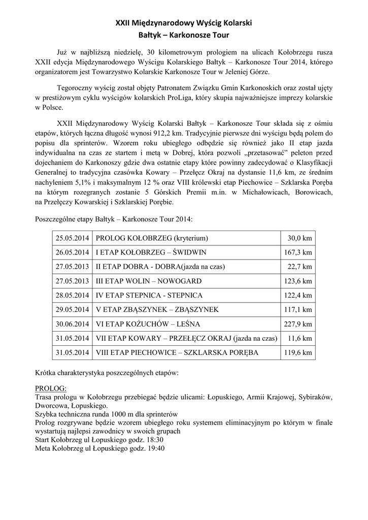 XXII Międzynarodowy Wyścig Kolarski Bałtyk – Karkonosze Tour Już w najbliższą niedzielę, 30 kilometrowym prologiem na ulicach Kołobrzegu rusza XXII edycja Międzynarodowego Wyścigu Kolarskiego Bałtyk – Karkonosze Tour 2014, którego organizatorem jest Towarzystwo Kolarskie Karkonosze Tour w Jeleniej Górze. Tegoroczny wyścig został objęty Patronatem Związku Gmin Karkonoskich oraz został ujęty w prestiżowym cyklu wyścigów kolarskich ProLiga, który skupia najważniejsze imprezy kolarskie w Polsce. XXII Międzynarodowy Wyścig Kolarski Bałtyk – Karkonosze Tour składa się z ośmiu etapów, których łączna długość wynosi 912,2 km. Tradycyjnie pierwsze dni wyścigu będą polem do popisu dla sprinterów. Wzorem roku ubiegłego odbędzie się również jako II etap jazda indywidualna na czas ze startem i metą w Dobrej, która pozwoli „przetasować” peleton przed dojechaniem do Karkonoszy gdzie dwa ostatnie etapy które powinny zadecydować o Klasyfikacji Generalnej to tradycyjna czasówka Kowary – Przełęcz Okraj na dystansie 11,6 km, ze średnim nachyleniem 5,1% i maksymalnym 12 % oraz VIII królewski etap Piechowice – Szklarska Poręba na którym rozegranych zostanie 5 Górskich Premii m.in. w Michałowicach, Borowicach, na Przełęczy Kowarskiej i Szklarskiej Porębie. Poszczególne etapy Bałtyk – Karkonosze Tour 2014: 25.05.2014 PROLOG KOŁOBRZEG (kryterium) 30,0 km 26.05.2014 I ETAP KOŁOBRZEG – ŚWIDWIN 167,3 km 27.05.2013 II ETAP DOBRA - DOBRA(jazda na czas) 22,7 km 27.05.2013 III ETAP WOLIN – NOWOGARD 123,6 km 28.05.2014 IV ETAP STEPNICA - STEPNICA 122,4 km 29.05.2014 V ETAP ZBĄSZYNEK – ZBĄSZYNEK 117,1 km 30.06.2014 VI ETAP KOŻUCHÓW – LEŚNA 227,9 km 31.05.2014 VII ETAP KOWARY – PRZEŁĘCZ OKRAJ (jazda na czas) 31.05.2014 VIII ETAP PIECHOWICE – SZKLARSKA PORĘBA 11,6 km 119,6 km Krótka charakterystyka poszczególnych etapów: PROLOG: Trasa prologu w Kołobrzegu przebiegać będzie ulicami: Łopuskiego, Armii Krajowej, Sybiraków, Dworcowa, Łopuskiego. Szybka techniczna runda 1000 m dla sprinterów Prolog rozgrywane będzie wzorem ubiegłego roku systemem eliminacyjnym po którym w finale wystartują najlepsi zawodnicy w swoich grupach Start Kołobrzeg ul Łopuskiego godz. 18:30 Meta Kołobrzeg ul Łopuskiego godz. 19:40 I ETAP KOŁOBRZEG – ŚWIDWIN Wyjazd z Kołobrzegu poprzedzony sześcioma rundami, które były na prologu następnie wyścig kieruje się wybrzeżem w kierunku Karlina, gdzie będzie rozgrywana Lotna Premia. Na tym etapie rozegrane zostaną również Lotna Premie w Tychowie, Brzeżnie oraz na rundach w Świdwinie. W roku 2013 r w Świdwinie wygrał Grzegorz Stępniak z CCC Polsat Polkowice. Etap dla sprinterów. Start Kołobrzeg ul. Łopuskiego godz. 13:00 Meta Świdwin Plac Konstytucji 3 Maja godz. 16:45 II ETAP DOBRA – DOBRA jazda indywidualna na czas Klasyczna „płaska” czasówka na trasie Dobra – Dobra z półmetkiem w miejscowości Sułkowo. Etap dla czasowców. Start/Meta Dobra ul Kościuszki godz. 9:30 Przyjazd ostatniego zawodnika do Dobrej 11:45 III ETAP WOLIN – NOWOGARD Zawodnicy z Wolina kierują się na Kamień Pomorski, Gryfice gdzie rozegrane będą Lotne Premie Następnie wyścig jedzie do Nowogardu gdzie metę etapu poprzedzą siedmioma okrążeniami 2300 m ulicami Nowogardu. Etap dla sprinterów. Start Wolin ul. Wojska Polskiego godz. 16:00 Meta Nowogard ul. 15 lutego godz. 18:45 III ETAP STEPNICA – STEPNICA Osiem rund 15,3 km ma trasie Stepnica – Miłowo – Zielonczyn – Czerwonak – Stepnica. Siedem Lotnych Premii w Stepnicy. Etap dla sprinterów. Start Stepnica ul. Bolesława Krzywoustego godz. 14:30 Meta Stepnica ul. Bolesława Krzywoustego godz. 17:10 V ETAP ZBĄSZYNEK – ZBASZYNEK Wyjazd ze Zbąszynka poprzedzony jedną rundą 4700m, następnie wyścig kieruje się na Nowy Tomyśl, Babimost gdzie będą rozgrywane Lotne Premie. Następnie wyścig wraca na trasę rundy, które była w Zbąszynku na starcie. Po przejechaniu pięciu okrążeń meta etapu. W 2011 r w Zbąszynku wygrał Krzysztof Jeżowski Bank BGŻ a w roku 2012 i 2013 r Grzegorz Stępniak z CCC Polsat Polkowice. Etap dla sprinterów. Start Zbąszynek ul. Wojska Polskiego godz. 17:00 Meta Zbąszynek ul Wojska Polskiego godz. 19:35 VI ETAP KOŻUCHÓW – LEŚNA Wyjazd w kierunku Leśnej poprzedzony sześcioma okrążeniami po ulicach Kożuchowa 1600m każda. Następnie wyścig jedzie do Leśnej mając na trasie Lotne Premie w: Małomicach, Osiecznicy, Czerwonej Wodzie, Żarskiej Wsi, Nowogrodźcu, Lubomierzu, Gryfowie Śląskim. Meta etapu w Leśnej zostanie poprzedzona jednym okrążeniem na ternie Gminy Leśna. W 2012 r w Leśnej wygrał Mateusz Komar z BDC Marc Pol a w 2013 r Konrad Dąbkowski z BDC Marc Pol. Etap dla zawodników lubiących „klasyki” Start Kożuchów ul Rynek godz. 11:00 Meta Leśna „Orliki” godz. 16:00 VII ETAP KOWARY – PRZEŁĘCZ OKRAJ jazda indywidualna na czas Tradycyjna czasówka Kowary – Przełęcz Okraj na dystansie 11,6km, ze średnim nachyleniem 5,1% i maksymalnym 12 %. Etap ten już od kilku lat rozstrzyga o kolejności zawodników w Klasyfikacji Generalnej. W 2013 roku ten etap wygrał Mateusz Taciak z CCC Polsat Etap dla górali. Start Kowary ul. 1 Maja godz. 9:00 Przyjazd ostatniego zawodnika na Przełęcz Okraj 11:30 VIII ETAP PIECHOWICE – SZKLARSKA PORĘBA Królewski etap tegorocznego wyścigu. Wyjazd z Piechowic poprzedzony pięcioma okrążeniami po ulicach Piechowic 2000m każde. Po małych rundach w Piechowicach zawodnicy jadą na rundę Piechowice – Michałowice – Piechowice gdzie w Michałowicach będzie rozegrana Premia Górska jak również w Piechowicach Lotna Premia. Z Piechowic wyścig jedzie na Lotną Premię w Podgórzynie by potem skierować się na Premię Górską w Borowicach. Następnie z Borowic wyścig jedzie na Lotną Premie do Kowar i dalej trasą czasówki dojeżdża do Premii Gorskiej na Przełęczy Kowarskiej z której główn