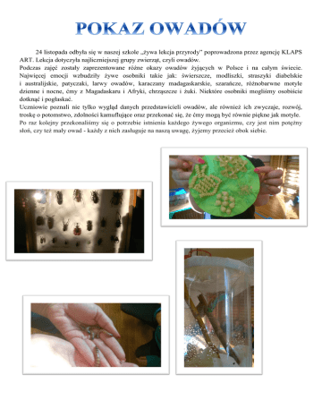 24 listopada odbyła się w naszej szkole „żywa lekcja przyrody” poprowadzona przez agencję KLAPS ART. Lekcja dotyczyła najliczniejszej grupy zwierząt, czyli owadów. Podczas zajęć zostały zaprezentowane różne okazy owadów żyjących w Polsce i na całym świecie. Najwięcej emocji wzbudziły żywe osobniki takie jak: świerszcze, modliszki, straszyki diabelskie i australijskie, patyczaki, larwy owadów, karaczany madagaskarskie, szarańcze, różnobarwne motyle dzienne i nocne, ćmy z Magadaskaru i Afryki, chrząszcze i żuki. Niektóre osobniki mogliśmy osobiście dotknąć i pogłaskać. Uczniowie poznali nie tylko wygląd danych przedstawicieli owadów, ale również ich zwyczaje, rozwój, troskę o potomstwo, zdolności kamuflujące oraz przekonać się, że ćmy mogą być równie piękne jak motyle. Po raz kolejny przekonaliśmy się o potrzebie istnienia każdego żywego organizmu, czy jest nim potężny słoń, czy też mały owad - każdy z nich zasługuje na naszą uwagę, żyjemy przecież obok siebie.
