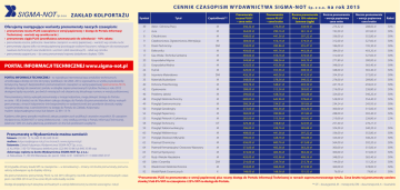 C E N N I K C Z A S O P I S M W YDAW N I C T WA S I G M A - N OT Sp. z o.o. ZAKŁAD KOLPORTAŻU Symbol Tytuł Częstotliwość** Prenumerata roczna PLUS* – cena netto Prenumerata roczna PLUS* – cena brutto S p. z o. o. Roczna prenumerata Plus z 10% rabatem (umowa ciągła) na rok 2015 Roczna prenumerata – wersja papierowa cena netto Roczna prenumerata – wersja papierowa cena brutto Rabat Oferujemy następujące warianty prenumeraty naszych czasopism: 39 Atest - Ochrona Pracy M 346,32 zł 376,56 zł 338,90 zł 274,32 zł 288,00 zł 50% • prenumerata roczna PLUS (czasopisma w wersji papierowej + dostęp do Portalu Informacji Technicznej – wartość wg cennika na br.) • prenumerata ciągła PLUS (przedłużana automatycznie do odwołania) – 10% rabatu • prenumerata roczna, półroczna i kwartalna czasopism w wersji papierowej – wartość wg cennika na br. • prenumerata ulgowa tylko na wersję papierową (przysługuje osobom fizycznym, należącym do stowarzyszeń naukowo-technicznych oraz studentom i uczniom szkół zawodowych) – rabat wg cennika • prenumerata zagraniczna – do ceny prenumeraty krajowej dodatkowo dopłata 100% 2 Aura M 264,00 zł 290,16 zł 261,14 zł 192,00 zł 201,60 zł 30% 8 Chłodnictwo M 408,00 zł 441,36 zł 397,22 zł 336,00 zł 352,80 zł 50% 9 Ciepłownictwo, Ogrzewnictwo, Wentylacja M 384,00 zł 416,16 zł 374,54 zł 312,00 zł 327,60 zł 50% 11 Dozór Techniczny DM 258,00 zł 283,86 zł 255,47 zł 186,00 zł 195,30 zł 50% 13 Elektronika M 456,00 zł 491,76 zł 442,58 zł 384,00 zł 403,20 zł 50% 17 Gaz, Woda i Technika Sanitarna M 384,00 zł 416,16 zł 374,54 zł 312,00 zł 327,60 zł 50% 20 Gospodarka Mięsna M 349,80 zł 388,56 zł 349,70 zł 277,80 zł 300,00 zł 50% 22 Gospodarka Wodna M 420,00 zł 453,96 zł 408,56 zł 348,00 zł 365,40 zł 50% 24 Hutnik M 420,00 zł 453,96 zł 408,56 zł 348,00 zł 365,40 zł 50% 28 Inżynieria Materiałowa DM 426,30 zł 460,56 zł 414,50 zł 354,30 zł 372,00 zł 50% 33 Materiały Budowlane M 348,00 zł 378,36 zł 340,52 zł 276,00 zł 289,80 zł 50% 40 Ochrona Przed Korozją M 509,76 zł 548,21 zł 493,39 zł 437,76 zł 459,65 zł 50% 42 Opakowanie M 288,00 zł 315,36 zł 283,82 zł 216,00 zł 226,80 zł 50% 46 Problemy Jakości M 396,00 zł 428,76 zł 385,88 zł 324,00 zł 340,20 zł 50% 48 Przegląd Elektrotechniczny M 600,00 zł 642,96 zł 578,66 zł 528,00 zł 554,40 zł 50% 49 Przegląd Gastronomiczny M 306,24 zł 334,51 zł 301,06 zł 234,24 zł 245,95 zł 50% 50 Przegląd Geodezyjny M 372,00 zł 403,56 zł 363,20 zł 300,00 zł 315,00 zł 50% 54 Przegląd Papierniczy M 360,00 zł 390,96 zł 351,86 zł 288,00 zł 302,40 zł 50% 55 Przegląd Piekarski i Cukierniczy M 282,00 zł 315,36 zł 283,82 zł 210,00 zł 226,80 zł 22% 58 Przegląd Techniczny DT 329,40 zł 358,83 zł 322,95 zł 257,40 zł 270,27 zł - PORTAL INFORMACJI TECHNICZNEJ www.sigma-not.pl PORTAL INFORMACJI TECHNICZNEJ – to największa internetowa baza artykułów technicznych, umożliwiająca dostęp on-line do tysięcy publikacji z lat 2004–2014, wyposażona w szybką wyszukiwarkę tematyczną. Naszym bezpośrednim prenumeratorom czasopism w wersji papierowej (prenumerata PLUS) oferujemy dostęp do zawartości portalu w obrębie zaprenumerowanych tytułów. Numery z roku 2015 dostępne będą na portalu, po dwóch miesiącach od ukazania się aktualnego numeru w wersji podstawowej. Prenumeratorzy, którzy wykupili prenumeratę u innego kolportera, mogą dokupić dostęp do Portalu w cenie – 90 zł (netto) na rok. Warunkiem zakupu dostępu do Portalu dla prenumeratorów, którzy wykupili prenumeratę u innych kolporterów (nie bezpośrednio w wydawnictwie) jest przesłanie dowodu wpłaty na prenumeratę wraz z zamówieniem na dostęp do Portalu do Zakładu Kolportażu: mailem: [email protected] lub faksem 22 891-13-74 Każdemu oferujemy ponadto możliwość zakupu pojedynczych publikacji i zeszytów wszystkich 30 czasopism Wydawnictwa SIGMA-NOT w wersji elektronicznej – ceny według cennika w Portalu Informacji Technicznej. (płatność: SMS-em, kartą płatniczą, przelewem on-line lub przelewem zwykłym). Prenumeratę w Wydawnictwie można zamówić: faksem: (22) 891 13 74, 840 35 89, 840 59 49 mailem: [email protected] na stronach: www.sigma-not.pl listownie: Zakład Kolportażu Wydawnictwa SIGMA-NOT Sp. z o.o., ul. Ku Wiśle 7, 00-707 Warszawa telefonicznie: (22) 840 30 86 lub 840 35 89 oraz dokonując wpłaty na konto Wydawnictwa SIGMA-NOT Sp. z o.o.: ul. Ratuszowa 11, 00-950 Warszawa, skr. poczt. 1004, nr 81 1240 6074 1111 0000 4995 0197 W przypadku zmiany stawki VAT na czasopisma i – w konsekwencji – zmiany cen brutto prenumeraty, prenumeratorzy zobowiązani są do dopłaty różnicy. Dla prenumeratorów prenumeraty PLUS na rok 2015 oferujemy roczniki archiwalne prenumerowanych czasopism z lat 2004-2014 na CD w cenie 40 pln netto każdy rocznik. Dostęp do pojedynczych zeszytów archiwalnych w wersji elektronicznej na stronie www.sigma- not.pl 59 Przegląd Telekomunikacyjny M 396,00 zł 428,76 zł 385,88 zł 324,00 zł 340,20 zł 50% 60 Przegląd Włókienniczy M 408,00 zł 441,36 zł 397,22 zł 336,00 zł 352,80 zł 50% 61 Przegląd Zbożowo-Młynarski M 396,00 zł 428,76 zł 385,88 zł 324,00 zł 340,20 zł 50% 62 Przemysł Chemiczny M 636,00 zł 680,76 zł 612,68 zł 564,00 zł 592,20 zł 50% 64 Przemysł Fermantacyjny i Owocowo-Warzywny M 372,00 zł 403,56 zł 363,20 zł 300,00 zł 315,00 zł 50% 65 Przemysł Spożywczy M 372,00 zł 403,56 zł 363,20 zł 300,00 zł 315,00 zł 50% 67 Rudy i Metale Niezależne M 420,00 zł 453,96 zł 408,56 zł 348,00 zł 365,40 zł 50% 69 Szkło i Ceramika DM 216,00 zł 239,76 zł 215,78 zł 144,00 zł 151,20 zł 50% 74 Wiadomości Elektrotechniczne M 432,00 zł 466,56 zł 419,90 zł 360,00 zł 378,00 zł 50% 92 Wokół Płytek Ceramicznych K 148,00 zł 168,36 zł 151,52 zł 76,00 zł 79,80 zł 50% *Prenumerata PLUS to prenumerata w wersji papierowej plus roczny dost