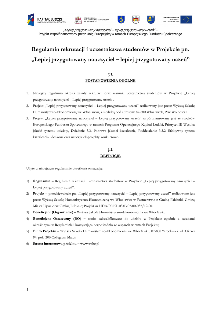 „Lepiej przygotowany nauczyciel – lepiej przygotowany uczeń” – Projekt współfinansowany przez Unię Europejską w ramach Europejskiego Funduszu Społecznego Regulamin rekrutacji i uczestnictwa studentów w Projekcie pn. „Lepiej przygotowany nauczyciel – lepiej przygotowany uczeń” § 1. POSTANOWIENIA OGÓLNE 1. Niniejszy regulamin określa zasady rekrutacji oraz warunki uczestnictwa studentów w Projekcie „Lepiej przygotowany nauczyciel – Lepiej przygotowany uczeń”. 2. Projekt „Lepiej przygotowany nauczyciel – Lepiej przygotowany uczeń” realizowany jest przez Wyższą Szkołę Humanistyczno-Ekonomiczną we Włocławku, z siedzibą pod adresem: 87-800 Włocławek, Plac Wolności 1. 3. Projekt „Lepiej przygotowany nauczyciel – Lepiej przygotowany uczeń” współfinansowany jest ze środków Europejskiego Funduszu Społecznego w ramach Programu Operacyjnego Kapitał Ludzki, Priorytet III Wysoka jakość systemu oświaty, Działanie 3.3, Poprawa jakości kształcenia, Poddziałanie 3.3.2 Efektywny system kształcenia i doskonalenia nauczycieli-projekty konkursowe. § 2. DEFINICJE Użyte w niniejszym regulaminie określenia oznaczają: 1) Regulamin – Regulamin rekrutacji i uczestnictwa studentów w Projekcie „Lepiej przygotowany nauczyciel – Lepiej przygotowany uczeń”. 2) Projekt – przedsięwzięcie pn. „Lepiej przygotowany nauczyciel – Lepiej przygotowany uczeń” realizowane jest przez Wyższą Szkołę Humanistyczno-Ekonomiczną we Włocławku w Partnerstwie z Gminą Fabianki, Gminą Miasta Lipna oraz Gminą Lubanie; Projekt nr UDA-POKL.03.03.02-00-032/12-00. 3) Beneficjent (Organizator) – Wyższa Szkoła Humanistyczno-Ekonomiczna we Włocławku 4) Beneficjent Ostateczny (BO) – osoba zakwalifikowana do udziału w Projekcie zgodnie z zasadami określonymi w Regulaminie i korzystająca bezpośrednio ze wsparcia w ramach Projektu; 5) Biuro Projektu – Wyższa Szkoła Humanistyczno-Ekonomiczna we Włocławku, 87-800 Włocławek, ul. Okrzei 94, pok. 200 Collegium Maius 6) 1 Strona internetowa projektu – www.wshe.pl „Lepiej przygotowany nauczyciel – lepiej przygotowany uczeń” – Projekt współfinansowany przez Unię Europejską w ramach Europejskiego Funduszu Społecznego § 3. INFORMACJE O PROJEKCIE 1. Projekt realizowany jest w okresie od 01 stycznia 2013 do 30 września 2015 roku. 2. Celem głównym Projektu jest wdrożenie do 30 września 2015 roku Nowego Programu Praktyk Pedagogicznych, którego efektem będzie lepsze przygotowanie kadry pedagogicznej do roli opiekunów praktyk i studentów do roli nauczycieli. 3. Projekt jest adresowany do: 1) 8 placówek oświatowych (4 szkoły podstawowe i 4 przedszkola) z terenu Gmin Partnerstwa Projektu. 2) 30 nauczycieli/ek wychowania przedszkolnego i wczesnoszkolnego pełniących rolę opiekunów praktyk. 3) 90 studentów/ek Wydziału Nauk Pedagogicznych Wyższej Szkoły Humanistyczno-Ekonomicznej we Włocławku o specjalności w zakresie pedagogiki wczesnoszkolnej, pedagogiki wczesnoszkolnej z przedszkolną, pedagogiki przedszkolnej z terapią dziecka. 4. Udział w oferowanych w ramach Projektu formach wsparcia jest bezpłatny. 5. Wszelkie informacje, dokumenty i formularze dotyczące realizacji Projektu dostępne będą na stronie internetowej projektu oraz w Biurze Projektu. § 4. KRYTERIA UDZIAŁU W PROJEKCIE BO Projektu może być osoba, która spełnia łącznie następujące warunki: 1) posiada status studenta Wydziału Nauk Pedagogicznych Wyższej Szkoły Humanistyczno-Ekonomicznej we Włocławku o specjalności: a) pedagogika wczesnoszkolna; b) pedagogika wczesnoszkolna z przedszkolną; c) pedagogika przedszkolna z elementami terapii dziecka; 2) wyraża gotowość do udziału we wdrażanym Nowym Programie Praktyk Pedagogicznych; 3) zamieszkuje na terenie województwa kujawsko-pomorskiego (w rozumieniu kodeksu cywilnego). § 5. OGÓLNE ZASADY REKRUTACJI 1. Rekrutacja do Projektu prowadzona będzie przez Organizatora cyklicznie wśród studentów następujących roczników: 2011/2012, 2012/2013, 2013/2014. 2. W ramach każdego naboru zrekrutowanych zostanie łącznie 90 studentów/ek. 3. Szczegółowe informacje na temat terminu naborów zamieszczone będą na stronie internetowej projektu. W przypadku niewystarczającej liczby kandydatów lub wyczerpania limitu miejsc Organizator projektu zastrzega sobie prawo do zmiany terminu zakończenia postępowania rekrutacyjnego. 2 „Lepiej przygotowany nauczyciel – lepiej przygotowany uczeń” – Projekt współfinansowany przez Unię Europejską w ramach Europejskiego Funduszu Społecznego 4. Rekrutacji do Projektu dokona komisja rekrutacyjna w składzie: kierownik projektu, asystent kierownika projektu, koordynator ds. praktyk pedagogicznych z ramienia Uczelni. 5. Każda akcja rekrutacyjna prowadzona będzie w 4 etapach: 1) akcja informacyjno-promocyjna; 2) prowadzenie rekrutacji BO; 3) weryfikacja zgłoszeń i ustalenie podstawowej i rezerwowej listy BO; 4) zebranie deklaracji uczestnictwa w projekcie wraz z oświadczeniami i rozpoczęcie udziału w projekcie. § 6. WYMAGANE DOKUMENTY 1. Osoby chętne do udziału w Projekcie muszą złożyć osobiście w Biurze Projektu komplet następujących dokumentów: 2. a) deklaracja uczestnictwa w Projekcie (zał. nr 1 do regulaminu); b) formularz zgody na przetwarzanie danych osobowych (zał. nr 2 do regulaminu); c) formularz danych osobowych (zał. nr 3 do regulaminu); d) zaświadczenie z Dziekanatu potwierdzające status studenta. Dokumenty rekrutacyjne, o których mowa w ust. 1 pkt. 1-2 dostępne będę w Biurze Projektu oraz do pobrania ze strony internetowej projektu. § 7. PRZEBIEG REKRUTACJI 1. Postępowanie rekrutacyjne odbywa się z zachowaniem równości szans kobiet i mężczyzn w dostępie do udziału w projekcie. 2. O przyjęciu do udziału w projekcie decyduje spełnienie poniższych kryteriów: a) spełnienie warunków udziału w projekcie określonych w § 4; b) złoż