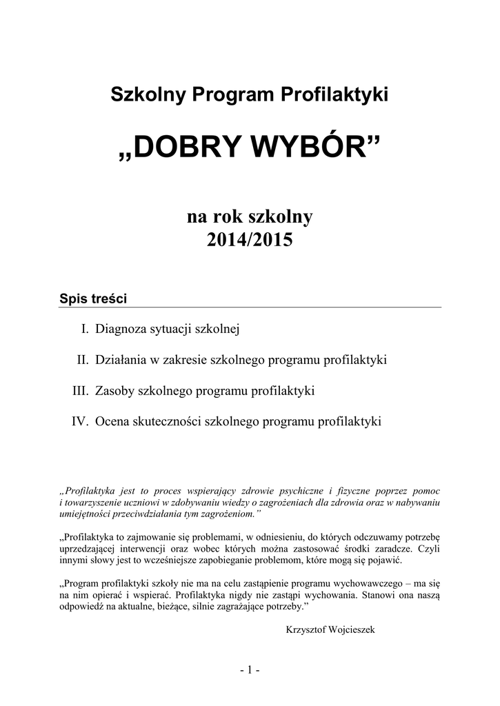 Szkolny Program Profilaktyki „DOBRY WYBÓR” na rok szkolny 2014/2015 Spis treści I. Diagnoza sytuacji szkolnej II. Działania w zakresie szkolnego programu profilaktyki III. Zasoby szkolnego programu profilaktyki IV. Ocena skuteczności szkolnego programu profilaktyki „Profilaktyka jest to proces wspierający zdrowie psychiczne i fizyczne poprzez pomoc i towarzyszenie uczniowi w zdobywaniu wiedzy o zagrożeniach dla zdrowia oraz w nabywaniu umiejętności przeciwdziałania tym zagrożeniom.” „Profilaktyka to zajmowanie się problemami, w odniesieniu, do których odczuwamy potrzebę uprzedzającej interwencji oraz wobec których można zastosować środki zaradcze. Czyli innymi słowy jest to wcześniejsze zapobieganie problemom, które mogą się pojawić. „Program profilaktyki szkoły nie ma na celu zastąpienie programu wychowawczego – ma się na nim opierać i wspierać. Profilaktyka nigdy nie zastąpi wychowania. Stanowi ona naszą odpowiedź na aktualne, bieżące, silnie zagrażające potrzeby.” Krzysztof Wojcieszek -1- I. DIAGNOZA SYTUACJI SZKOLNEJ Chcemy, żeby nasze działania profilaktyczne prowadzone były w odniesieniu do realnych problemów, które rzeczywiście występują lub mogą się pojawić. Dlatego ważnym elementem jest diagnoza, czyli określenie stanu potrzeb i celów działań profilaktycznych. Diagnoza w naszej szkole jest prowadzona wielotorowo. Opiera się na: wspólnych rozmowach, dyskusjach grona pedagogicznego, rozmowach z pracownikami administracyjnymi i obsługowymi szkoły (panie sprzątaczki, pan woźny), sugestiach rodziców, obserwacjach zachowań młodzieży, robieniu notatek i zadawaniu ważnych pytań, badaniach statystycznych, badaniach ankietowych prowadzonych w szkole – mierzenie jakości pracy szkoły Lista problemów, profilaktycznych: którymi zajmujemy się w ramach działań niewłaściwe nawyki żywieniowe (anoreksja, bulimia), wzrost osób nadpobudliwych, borykających się z problemami emocjonalnymi – przemoc i agresja, zwłaszcza rówieśnicza na terenie szkoły, w Internecie, a także w czasie drogi do szkoły, pojawiające się kradzieże rzeczy osobistych uczniów na terenie szkoły. kontakt i używanie substancji psychoaktywnych (alkohol, nikotyna, narkotyki), Najważniejsze cele działań profilaktycznych w I LO: zapewnienie bezpieczeństwa w szkole, wokół niej, a także w czasie imprez organizowanych przez szkołę, kształtowanie pozytywnych obyczajów i wzorów zachowań, przygotowanie do dokonywania umiejętnych wyborów w życiu, wyposażenie uczniów w wiedzę i umiejętności niezbędne w budowaniu dojrzałej osobowości, zdolnej przeciwstawić się presji z zewnątrz, wyposażenie nauczycieli w wiedzę potrzebną w realizacji zadań profilaktycznych szkoły, nauczenie postaw asertywnych w sytuacjach zagrożeń, zwrócenie uwagi na różne formy przemocy i agresji oraz sposoby ich zapobiegania, przede wszystkim cyberprzemoc, zapobieżenie powstawaniu problemów, które mogą być wynikiem spożywania alkoholu i narkotyków, zmniejszenie rozmiarów już występujących problemów związanych z nadużywaniem środków psychoaktywnych, Internetu, gier komputerowych, przemocą w rodzinie itd. -2- II. DZIAŁANIA A. DLA UCZNIÓW: Działania profilaktyczne realizowane w poszczególnych klasach, rozłożone są na trzy lata liceum i realizowane według następujących modułów. „Zajęcia integracyjne uczniów klas pierwszych” Przynależność i pozytywne oddziaływanie grupy rówieśniczej. Chcemy, aby taką grupą była klasa. Dlatego wprowadzamy zadania z zakresu integracji, budowania pozytywnych relacji i zwiększanie poczucia bezpieczeństwa już na samym początku ich edukacji. „Przeciwdziałanie tzw. <koceniu>” Jest to oficjalne przyjęcie uczniów klas pierwszych w poczet Smoleniaków – przeciwdziałanie przejawom agresji rówieśniczej tzw. „koceniu”. Polega na wspólnej zabawie i integracji społeczności szkolnej. W tym roku ma charakter pikniku integracyjnego. „Odlot – dokąd?” – program profilaktyczny Program, w trakcie, którego uczestnicy zostają wyposażeni w niezbędną wiedzę teoretyczną, dotyczącą substancji uzależniających, sposobów wchodzenia w uzależnienie. Realizator przedstawia czynniki sprzyjające wejściu w nałóg, pokazuje zdrowe sposoby radzenia sobie ze stresem. Zajęcia prowadzone są w zespołach klasowych przy użyciu nowoczesnych metod przekazu, aktywizujących uczestników. Chodzi o dokonanie poruszenia uczniów, którzy słuchają świadectwa osoby, która brała narkotyki - wzrasta wiarygodność prowadzącego. „Alkohol kradnie wolność” Zajęcia prowadzone przez pedagoga szkolnego + wystawa prac plastycznych przygotowanych przez młodzież. „Profilaktyka HIV/AIDS” Jest to spotkanie z profesjonalistą – lekarzem pracującym na co dzień z nosicielami wirusa HIV i chorymi na AIDS „Bezpieczne wakacje” Zajęcia, które mogą mieć charakter spotkań z policjantem lub pogadanek prowadzonych przez wychowawców klas. Celem zajęć jest zwrócenie uwagi na rolę ofiary w czynie przestępczym oraz zwrócenie większej uwagi młodych ludzi na odpowiedzialność karną za popełniane czyny w kontekście wyjazdów wakacyjnych. -3- „NOE” – program profilaktyczny Program, który stanowi próbę skutecznego i efektywnego wejścia w środowisko młodych ludzi. Zasadniczy wysiłek realizatorów programu skierowany jest na zmianę postaw wobec picia alkoholu. Spotkanie z młodzieżą ma charakter mityngu z dużą grupa młodzieży w czasie 4-5 godzin na terenie szkoły. Zaletą programu jest bardzo silne oddziaływanie prowadzących (terapeuci, trzeźwy alkoholik, koalkoholiczka – współmałżonka oraz dziecko z rodziny alkoholowej). “Emocjonalni Liderzy Młodzieżowi - ELM” – autorski program edukacyjnoprofilaktyczny Celem programu jest przygotowanie grupy uczniów, do bycia bardziej efektywnym w pomaganiu i wspieraniu swoich r