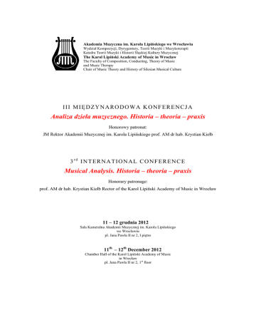 Akademia Muzyczna im. Karola Lipińskiego we Wrocławiu Wydział Kompozycji, Dyrygentury, Teorii Muzyki i Muzykoterapii Katedra Teorii Muzyki i Historii Śląskiej Kultury Muzycznej The Karol Lipiński Academy of Music in Wrocław The Faculty of Composition, Conducting, Theory of Music and Music Therapy Chair of Music Theory and History of Silesian Musical Culture I I I M I Ę D ZY N AR O D O WA K O NF ER E NC J A Analiza dzieła muzycznego. Historia – theoria – praxis Honorowy patronat: JM Rektor Akademii Muzycznej im. Karola Lipińskiego prof. AM dr hab. Krystian Kiełb 3 r d I N T ER NA T I O N A L C O NF ER E N C E Musical Analysis. Historia – theoria – praxis Honorary patronage: prof. AM dr hab. Krystian Kiełb Rector of the Karol Lipiński Academy of Music in Wrocław 11 – 12 grudnia 2012 Sala Kameralna Akademii Muzycznej im. Karola Lipińskiego we Wrocławiu pl. Jana Pawła II nr 2, I piętro 11th – 12th December 2012 Chamber Hall of the Karol Lipiński Academy of Music in Wrocław pl. Jana Pawła II nr 2, 1st floor 2 Kierownictwo naukowe i organizacyjne / Scholarly and Organisational Supervision prof. AM dr hab. Anna Granat-Janki Organizacja konferencji / Conference Organisers mgr Dorota Kanafa mgr Aleksandra Pijarowska mgr Agnieszka Zwierzycka mgr Izabella Paradowska oraz Biuro Promocji i Organizacji Imprez / Office for Promotion and Events Koordynator kontaktów zagranicznych / International Relation Coordinator dr Maria Brzuchowska Studio Technik Multimedialnych Akademii Muzycznej im. Karola Lipińskiego we Wrocławiu / Multimedia Techniques Studio of the Karol Lipiński Academy of Music in Wrocław Organizacja koncertu / Concert Organisers Wydział Instrumentalny Akademii Muzycznej im. Karola Lipińskiego we Wrocławiu – Zakład Muzyki Jazzowej / The Instrumental Faculty of the Karol Lipiński Academy of Music in Wrocław – Jazz Department Przygotowanie wystawy / Exhibition Organiser Biblioteka Główna Akademii Muzycznej im. Karola Lipińskiego we Wrocławiu / The Main Library of the Karol Lipiński Academy of Music in Wrocław Tłumaczenie / English Translation mgr Ewa Skotnicka 3 Akademia Muzyczna im. Karola Lipińskiego we Wrocławiu 4 PROGRAM / PROGRAMME Wtorek, 11 grudnia 2012 / Tuesday, 11th December 2012 Sala Kameralna / Chamber Hall Akademii Muzycznej im. Karola Lipińskiego we Wrocławiu pl. Jana Pawła 2 nr 2, I piętro 9.30 / 9.30 a.m. Otwarcie konferencji / Opening Address Rektor AM we Wrocławiu – prof. AM dr hab. Krystian Kiełb 9.45 – 10.25 / 9.45 – 10.25 a.m. Wykład inauguracyjny/ Keynote lecture Robert S. Hatten(Austin) Beyond “Beyond Analysis” [Wykraczając poza „Beyond Analysis”] Historia i teoria analizy / The History and Theory of Analysis 10.30 – 11.30 / 10.30 – 11.30 a.m. Prowadzenie / Chair Teresa Malecka (Kraków) 10.30 – 11.00 Zuzana Martináková (Banská Ńtiavnica) Development of Modal Thinking from Palestrina to the Present Time [Rozwój modalnego myślenia od Palestriny do czasów współczesnych] 11.00 – 11.30 Katarzyna Szymańska-Stułka (Warszawa) Światło, czas, przestrzeń, barwa, narracja... – kilka spojrzeń na nowe elementy dzieła muzycznego [Light, Time, Space, Timbre, Narration… – a Few Glances at New Elements of a Musical Work] 11.30 – 12.00 przerwa na kawę /11.30 – 12.00 p.m. coffee break Koncepcje analizy i interpretacji / The Concepts of Analysis and Interpretation 12.00 – 13.40 / 12.00 – 1.40 p.m. Prowadzenie / Chair Anna Granat-Janki (Wrocław) 5 12.00 – 12.40 Mieczysław Tomaszewski (Kraków) – Keynote lecture Odczytywanie oksymoronu. Rekonesans [Interpreting an Oxymoron. A Reconnaissance] 12.40 – 13.10 Sławomira Żerańska-Kominek (Warszawa) Towards an Analysis of Oral Music [Analizując muzykę oralną] 13.10 – 13.40 Krystyna Juszyńska (Łódź) Analiza akustyczna nagrań pianistycznych jako metoda badania interpretacji artystycznej dzieła muzycznego [Acoustic Analysis of Piano Recordings as a Method of Investigation into Artistic Interpretation of a Musical Work] 13.40 – 15.00 przerwa obiadowa / 1.40 – 3.00 p.m. lunch break W kręgu semiotyki, semantyki, retoryki / Within the Field of Semiotics, Semantics and Rhetoric 15.00 – 16.30 / 3.00 – 4.30 p.m. Prowadzenie / Chair Andrzej Tuchowski (Zielona Góra, Wrocław) 15.00 – 15.30 Jean-Pierre Bartoli (Paryż) – Keynote lecture For a Renewed Approach to Musical Analysis from General Rhetoric [Nowe podejście do analizy muzycznej od strony retoryki ogólnej] 15.30 – 16.00 Anna Granat-Janki (Wrocław) Relacje intertekstualne i intersemiotyczne w „Listach polskich” Marty Ptaszyńskiej i ich aspekt aksjologiczny [Intertextual and Intersemiotic Relations in Marta Ptaszyńska’s “Polish Letters” and their Axiological Aspect] 16.00 –16.30 Gundega Šmite (Ryga) Some Analytical Aspects of the Realization of Verbal Text in a Contemporary Choral Music [Wybrane aspekty analizy związków słowno-muzycznych we współczesnej muzyce chóralnej] 16.30 – 17.00 przerwa na kawę / 4.30 – 5.00 coffee break 6 Konteksty dzieła / The Contexts of a Work 17.00 – 18.30 / 5.00 – 6.30 p.m. Prowadzenie / Chair Sławomira Żerańska-Kominek (Warszawa) 17.00 – 17.30 Andrzej Tuchowski (Zielona Góra, Wrocław) Analiza dzieła muzycznego w świetle tradycji narodowych [Music Analysis in the Light of National Traditions] 17.30 – 18.00 Renata Skupin (Gdańsk) Orientalizm w „Koncercie” na sopran i orkiestrę op. 8 Tadeusza Z. Kasserna [The Orientalism in Tadeusz Z. Kassern's “Concerto” for Voice and Orchestra op. 8] 18.00 – 18.30 Andrzej Wolański (Wrocław) Fenomen alby Brangeny z „Tristana i Izoldy” Richarda Wagnera [The Phenomenon of Brangane’s alba from “Tristan and Isolde” by Richard Wagner] 19.00 / 7.00 p.m. Koncert / Concert Jazz Combo Akademii Muzycznej Opiekun artystyczny / Artistic manager Aleksander Mazur W programie: hity i standardy jazzowe The programme: Jazz Standards & Hits S