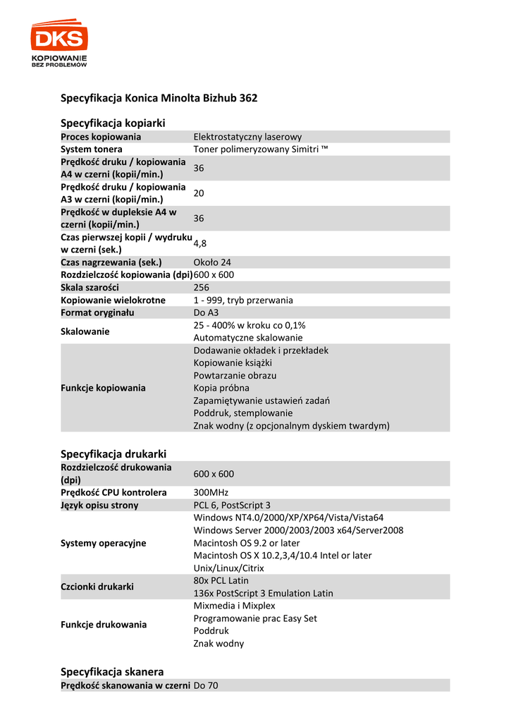 Specyfikacja Konica Minolta Bizhub 362 Specyfikacja kopiarki