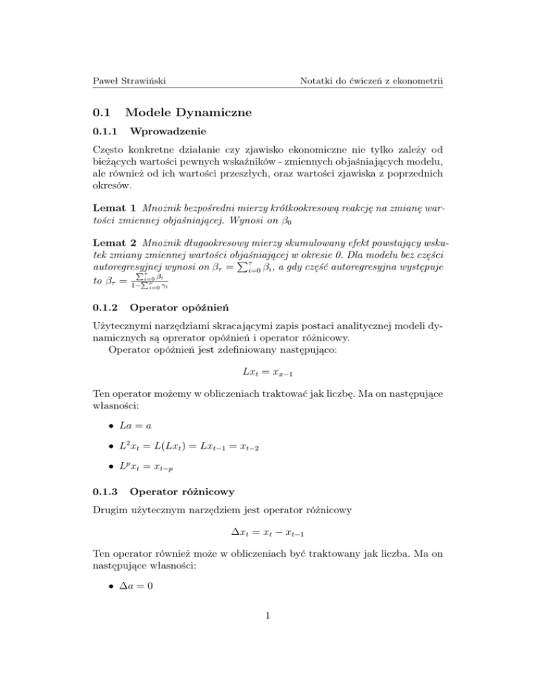 Paweł Strawiński 0.1 0.1.1 Notatki do ćwiczeń z ekonometrii Modele Dynamiczne Wprowadzenie Często konkretne działanie czy zjawisko ekonomiczne nie tylko zależy od bieżących wartości pewnych wskaźników - zmiennych objaśniających modelu, ale również od ich wartości przeszłych, oraz wartości zjawiska z poprzednich okresów. Lemat 1 Mnożnik bezpośredni mierzy krótkookresową reakcję na zmianę wartości zmiennej objaśniającej. Wynosi on β0 Lemat 2 Mnożnik długookresowy mierzy skumulowany efekt powstający wskutek zmiany zmiennej wartości objaśniającej w okresie 0. Dla modelu bez części Pτ autoregresyjnej wynosi on β = β , a gdy część autoregresyjna występuje τ i=0 i Pτi=0 βi to βτ = 1−Pp γi i=0 0.1.2 Operator opóźnień Użytecznymi narzędziami skracającymi zapis postaci analitycznej modeli dynamicznych są oprerator opóźnień i operator różnicowy. Operator opóźnień jest zdefiniowany następująco: Lxt = xx−1 Ten operator możemy w obliczeniach traktować jak liczbę. Ma on następujące własności: • La = a • L2 xt = L(Lxt ) = Lxt−1 = xt−2 • Lp xt = xt−p 0.1.3 Operator różnicowy Drugim użytecznym narzędziem jest operator różnicowy ∆xt = xt − xt−1 Ten operator również może w obliczeniach być traktowany jak liczba. Ma on następujące własności: • ∆a = 0 1 Paweł Strawiński Notatki do ćwiczeń z ekonometrii • ∆2 xt = ∆∆xt = ∆(xt − xt−1 ) = (xt − xt−1 ) − (xt−1 − xt−2 ) • ∆p xt = . . . = (xt − xt−1 ) − . . . − (xt−(p+1) − xt−p ) • xt = xt−1 + ∆xt • ∆xt = (1 − L)xt Możemy połączyć użycie obu operatorów: ∆2 xt = (1 − L)2 xt = (1 − 2L + L2 )xt = xt − 2xt−1 + xt−2 = ∆xt − ∆xt−1 Dodatkowo zauważmy, że: (1−L)2 xt = (1−L)(1−L)xt = (1−L)(xt −xt−1 ) = (xt −xt−1 )−(xt−1 −xt−2 ) Dynamiczne równanie regresji możemy przedstawić jako: yt = α + ∞ X βi Li xt + t = α + B(L)xt + t i=0 gdzie B jest wielomianem zmiennej L: B(L) = β0 L0 + β1 L1 + β2 L2 + . . . Wielomian operatora opóźnień to wyrażenie postaci: 2 3 A(L) = 1 + aL + (aL) + (aL) + . . . = ∞ X aLi i=0 jeśli | a |< 1, wtedy: A(L) = 0.1.4 1 1 − aL Modele o opóźnieniach rozłożonych Distributed Lags Model z opóźnieniami rozłożonymi ma następującą formę: yt = α + β ∞ X γi Li xt + εt i=0 możemy go zapisać jako: yt = α + β(1 − γL)−1 xt + εt 2 (1) Paweł Strawiński 0.1.5 Notatki do ćwiczeń z ekonometrii Model autoregresyjny Ten sam model możemy zapisać w formie autoregresyjnej. Mnożąc (1) przez (1 − γL) otrzymujemy: yt (1 − γL) = α(1 − γL) + βxt + εt (1 − γL) po uporządkowaniu dostajemy: yt = α(1 − γ) + βxt + γyt−1 + (1 − γL)εt możemy go również zapisać za pomocą operatora opóźnień: C(L)yt = α∗ + βxt + ε∗ 0.1.6 Modele autoregresyjne o opóźnieniach rozłożonych (ARDL) Autoregressive Distributed Lags Bardziej ogólnym zapisem modeli dynamicznych jest postać ARDL. yt = µ + p X i=1 γi yt−i + r X βj xt−j + δwt + εt (2) j=0 gdzie o składniku losowym t zakładamy że jest homoscedastyczny i nieskorelowany. Możemy zapisać model (2) w bardziej zwięzłej postaci: C(L)yt = µ + B(L)xt + δwt + εt gdzie: C(L) = 1 − γ1 L1 − γ2 L2 − . . . − γp Lp oraz B(L) = β0 − β1 L1 − β2 L2 − . . . − βr Lr Model w tej postaci zapisujemy jeszcze krócej jako ARDL(p, r). Liczby wskazują na rząd wielomianów operatorów użytych do zapisu modelu. Klasyczny Model Regresji Liniowej jest specjalnym przypadkiem ARDL dla którego p = 0, oraz r = 0. 0.1.7 Stacjonarność Lemat 3 Proces stochastyczny jest słabo (wariancyjnie) stacjonarny jeśli var(xi ) = σ 2 < ∞ oraz cov(xt , xt+h ) = cov(xt+j , xt+j+h ) = γh dla dowolnych t, j, h. 3 Paweł Strawiński Notatki do ćwiczeń z ekonometrii Intuicyjnie proces stochastyczny jest stacjonarny jeżeli ma skończoną wariancję oraz kowariancje między obserwacjami nie zależą od czasu, a jedynie od odległości między obserwacjami. Lemat 4 Proces zintegrowany stopnia przedP∞zero, oznaczamy I(0). Można 2 stawić go w postaci xt − E(xt ) = i=0 εt−i , gdzie εt ∼IID (0, σ ) - biały szum. Lemat 5 Proces stochastyczny xt nazywamy procesem zintegrowanym rzędu d jeżeli ∆d xt jest I(0). 0.1.8 Stabilność modelu dynamicznego Stabilność modelu dynamicznego zależy od części autoregresyjnej modelu. Lemat 6 Model dynamiczny nazywamy modelem stabilnym jeżeli pierwiastki wielomianu operatora opóźnień jego części autoregresyjnej leżą poza kołem jednostkowym. Rozwiązaniem stabilnym modelu dynamicznego nazywamy rozwiązanie dla którego yt = yt−1 = . . . = yt−p , xt = xt−1 = . . . = xt−q , oraz ∀iεi = 0 0.1.9 Model ARIMA Nazwa modelu jest zbitką trzech nazw. AR pochodzi od procesu autoregresyjnego, I od procesu zintegrowanego, a MA od procesu średniej ruchomej. Postać analityczna modelu jest dość skomplikowana: ∆d yt = µ + γ1 ∆d yt−1 + γ2 ∆d yt−2 + . . . + γp ∆d yt−p + εt − θ1 εt−1 − . . . − θq εt−q ale zapis można uprościć stosując wielomiany operatora opóźnień i operator różnicowy: C(L)[(1 − ∆L)d yt ] = µ + D(L)εt Innym sposobem zapisu modelu jest ARIM A(p, d, q), gdzie p oznacza rząd procesu autoregresyjnego, q rząd procesu średniej ruchomej, a d rząd integracji procesu. 0.1.10 Pierwiastki jednostkowe i Test Dickey’a-Fullera Jeżeli proces stochastyczny zawiera pierwiastek który leży wewnątrz bądź na obrzeżu koła jednostkowego, to jest procesem niestacjonarnym. Test Dicke’yaFullera wykrywa obecność pierwiastków jednostkowych. 4 Paweł Strawiński Notatki do ćwiczeń z ekonometrii Jeżeli mamy model autoregresji w którym zmienna yt jest szeregiem czasowymi postaci: yt = ρyt−1 + εt (3) Chcemy sprawdzić czy zmienna yt jest stacjonarna. Wydaje się, że wystarczy przeprowadzić test czy ρ = 1 za pomocą sta