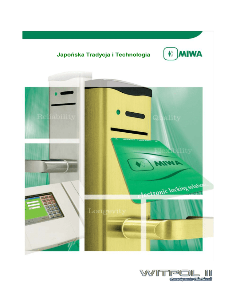 Japońska Tradycja i Technologia Doświadczenie... Aby spełnić potrzeby najbardziej wymagających Klientów, MIWA korzysta z najnowszych rozwiązań technologicznych. Efekty tego postępowania, są realizowane w jedenj z najnowocześniejszych fabryk w Japoni (Tamaki-work), która powstała w 1995 roku, z okazji 50-ej rocznicy istnienia Firmy MIWA. MIWA – Globalny Lider w Zamkach Elektronicznych MIWA jest jedną z największych prywatnych firm rodzinnych na świecie, zajmującą się produkcją zamków. Ponad 50 lat doświadczenia w tej branży, pozwala na projektowanie oraz wykonywanie najwyższej jakości produktów, od zamków drzwiowych poprzez samozamykacze, aż do kompleksowych systemów bezpieczeństwa, stosowanych w hotelach na całym świecie. Firma MIWA z ogromnym zaangażowaniem podchodzi do kwesti ochrony środowiska naturalnego, na każdym etapie produckji swoich systemów. Przed fabryką Tamaki-work, znajduje się fontanna z wodą poprodukcyjną, w której żyją karpie. Od 1981 roku – po wprowadzeniu po raz pierwszy do hoteli, bezprzwodowego zamka elektronicznego – do dnia dzisiejszego – z najnowszym systemem zamków dualnych AL5H – MIWA wyznacza globalne standardy w produckji zamków elektronicznych. Długoletnia Współpraca z Odbiorcami... Serwis i Pomoc Produkcja najleszpych rozwiązań to tylko początek współpracy z Użytkownikami. MIWA, jako jedyna firma na świecie w tej branży, oferuje Państwu pełną 3-letnią gwarancję na wszystkie swoje produkty w standardzie i bez żadnych dodatkowych dopłat. Poprzez sieć swoich oddziałów oraz niezależnych dystrybutorów na całym świecie , zapewniamy najwyższej jakości serwis oraz pomoc na każdym etapie współpracy. Jakość... Elastyczność... Bezpieczeństwo... Jeden mądry zamek. Jeden mądry wybór. MIWA AL5H – Dualna Technologia w Jednym Zamku Obecnie, Hotele oczekują znacznie więcej, niż tylko bezpiecznego zamknięcia pokoi gościnnych. System MIWA AL5H, ze swoim inteligentym rozwiązaniem, oferuje Państwu dzisiaj bezpieczny system kontroli dostępu oraz wykorzystując karty chipowe, nieograniczone możliwości jego rozwoju w przyszłości. Jednocześnie, MIWA na każdym etapie produkcji spełnia najwyższe wymogi i standardy, co jest potwierdzone przez: • Certyfikat Jakości ISO 9001 • Certyfikat UL - 10B • Certyfikat CE • Europejski Certyfikat Ognioodporności EN1634 • Zgodność z Polskimi Normami Ognioodporności EI30 • Certyfikat Zgodności DDA System MIWA AL5H, to również: Kompleksowa Kontrola Dostępu – karty i zamki mogą być programowane w bardzo elastyczny sposób, umożliwiając dostęp do wybranych pomieszczeń w określonych przedziałach czasowych. Bezproblemowa Obsługa – jako jedyny producent na świecie, MIWA oferuje 3 lata gwarancji. Rejestr Wydanych Kart – eliminujemy możliwość wydania karty, bez wpływów do kasy hotelowej. Odczyt Wejść – każdy zamek zapamiętuje 600 ostatnich otwarć. Wyjątkowy Mechanizm – specjalna konstrukacja zamka mechanicznego, gwarantuje jego długoletnią pracę. Nieulotna Pamięć – przy wymianie bateri, wszystkie informacje w zamku, pozostają w jego pamięci. Połączenie z PMS – możliwość podłączenia do dowolnego systemu recepcyjnego PMS. Wygląd, Wygoda i Bezpieczeństwo • kilka rodzajów wykończenia powierzchni oraz kilka rodzajów klamek, pozwala na wybór najbardziej optymalnego rozwiązania do Państwa hotelu, • taki sam kształt szyldów od strony pokoju oraz korytarza, • specjalna konstrukcja zapewniająca trwałość i bezpieczeństwo, • dostęp do elektroniki oraz baterii, tylko od strony pokoju, • wodoodporna elektronika, przy zewnętrzych zastosowaniach, np. bramy wjazdowe Systemy Zamków Elektronicznych Łatwość... Solidność... Czytniki Ścienne W Łatwość Użytkowania sytuacjach, gdy nie ma możliwości zainstalowania zamka na drzwiach, możemy wykorzystać specjalne czytniki ścienne, np. do sterowania i kontroli: • bramą wjazdową lub szlabanem, • Wkładamy kartę do zamka, • bramą garażową, • Od strony pokoju, wygodna gałka do • drzwiami wejściowymi do hotelu, zamknięcia rygla blokującego, • Sygnalizajca niskiego stanu baterii, tylko dla Personelu hotelu, • Klamki zawsze wracają do pozycji poziomej, dzięki specjalnemu mechanizmowi, • windą – umożliwiając dostęp do chronionych stref, tylko wybranym gościom (np. wjazd na parking podziemny lub na piętro dla VIP-ów), • inne pomieszczenia, • Opcjonalny i stosowany na specjalne życzenie klucz mechaniczny, z ponad 130 milionami kombinacji Zamki w systemie MIWA AL5H, możemy dowolnie programować, zgodnie z aktualnymi potrzebami oraz wymaganiami hotelu. Dzięki temu, uzyskujemy najbardziej „elastyczny” system kontroli dostępu: Pokój Gościnny - Ustawienie zamka, jako standarowy pokój gościnny, pozwala na dostęp do pokoju tylko wybranym Użytkownikom (karty Gościa / karty Personelu gdy gość nie jest zamknięty od środka / karty Awaryjne) Pomieszczenie Ogólne - Możliwy dostęp zarówno dla Gości jak też Personelu, np. główne wejście do hotelu, wjazd na parking, etc. Pomieszczenie Służowe - Możliwość ustawienia zamków jako tzw. zamki biurowe: pierwsze użycie karty otwiera zamek i drzwi są otwarte, kolejne użycie karty zamyka drzwi. Wygodne rozwiązanie w części biurowo – administracyjnej Hotelu, Pomieszczenie Specjalne - Przeznaczone dla wybranych Użytkowników, np. pokój VIP, sale konferencyjne, etc. Automatyczne Strefy Czasowe - Zamki możemy zaprogramować na specjalne strefy czasowe podczas których, zamek będzie cały czas otwarty, np. drzwi wejściowe do hotelu, od godziny 06 do 23.00 cały czas otwarte a po godzinie 23.00 otwarcie tylko po użyciu ważnej karty Gościa / Personelu. Czas Letni i Zimowy - Wewnętrzny zegar z kalendarzem w zamku, z automatycznym przestawianiem z czasu letniego na zimowy i na odwrót. Czas Ważności dla Gości - Zam