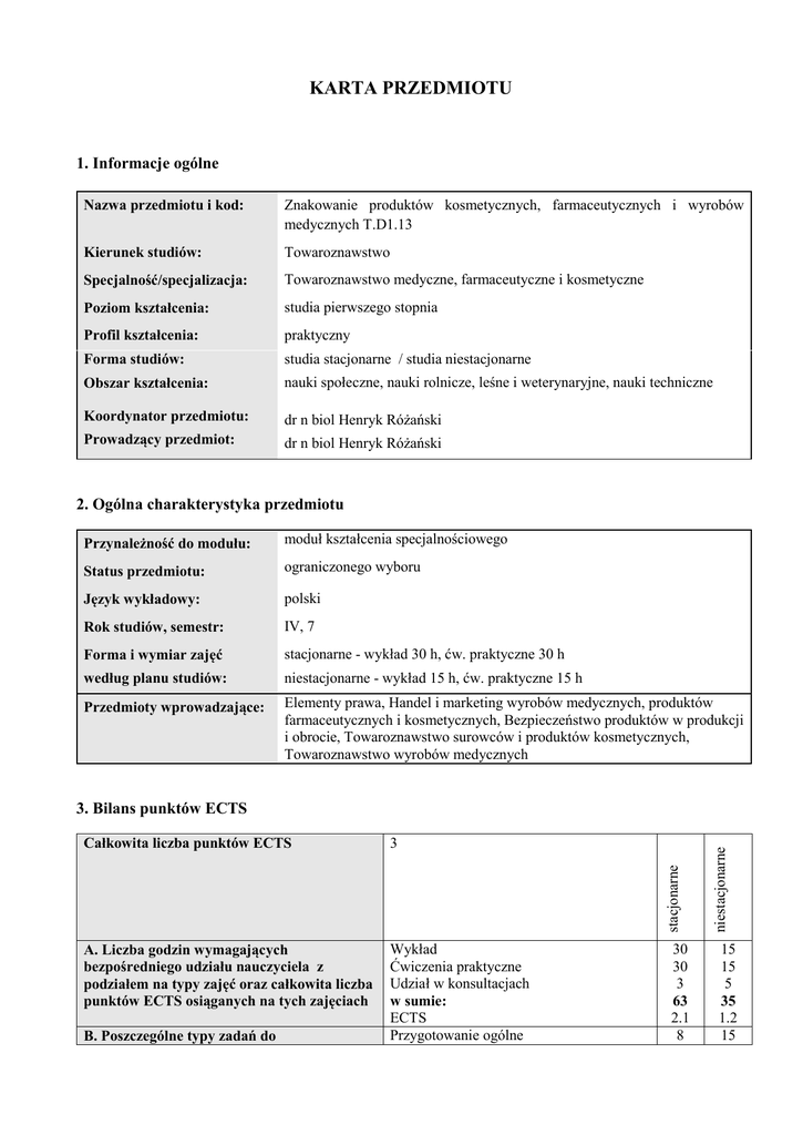 KARTA PRZEDMIOTU 1. Informacje ogólne Nazwa przedmiotu i kod: Znakowanie produktów kosmetycznych, farmaceutycznych i wyrobów medycznych T.D1.13 Kierunek studiów: Towaroznawstwo Specjalność/specjalizacja: Towaroznawstwo medyczne, farmaceutyczne i kosmetyczne Poziom kształcenia: studia pierwszego stopnia Profil kształcenia: praktyczny Forma studiów: studia stacjonarne / studia niestacjonarne Obszar kształcenia: nauki społeczne, nauki rolnicze, leśne i weterynaryjne, nauki techniczne Koordynator przedmiotu: dr n biol Henryk Różański Prowadzący przedmiot: dr n biol Henryk Różański 2. Ogólna charakterystyka przedmiotu Przynależność do modułu: moduł kształcenia specjalnościowego Status przedmiotu: ograniczonego wyboru Język wykładowy: polski Rok studiów, semestr: IV, 7 Forma i wymiar zajęć stacjonarne - wykład 30 h, ćw. praktyczne 30 h według planu studiów: niestacjonarne - wykład 15 h, ćw. praktyczne 15 h Przedmioty wprowadzające: Elementy prawa, Handel i marketing wyrobów medycznych, produktów farmaceutycznych i kosmetycznych, Bezpieczeństwo produktów w produkcji i obrocie, Towaroznawstwo surowców i produktów kosmetycznych, Towaroznawstwo wyrobów medycznych 3 A. Liczba godzin wymagających bezpośredniego udziału nauczyciela z podziałem na typy zajęć oraz całkowita liczba punktów ECTS osiąganych na tych zajęciach Wykład Ćwiczenia praktyczne Udział w konsultacjach w sumie: ECTS Przygotowanie ogólne B. Poszczególne typy zadań do niestacjonarne Całkowita liczba punktów ECTS stacjonarne 3. Bilans punktów ECTS 30 30 3 63 2.1 8 15 15 5 35 1.2 15 samokształcenia studenta (niewymagających bezpośredniego udziału nauczyciela) wraz z planowaną średnią liczbą godzin na każde i sumaryczną liczbą ECTS C. Liczba godzin praktycznych/laboratoryjnych w ramach przedmiotu oraz związana z tym liczba punktów ECTS Przygotowanie do ćwiczeń Przygotowywanie do kolokwium Przygotowanie sprawozdań Praca w bibliotece w sumie: ECTS Ćwiczenia praktyczne Przygotowanie do ćwiczeń Przygotowanie sprawozdań w sumie: ECTS 5 5 5 4 27 0,9 30 5 5 40 1.3 15 10 10 5 55 1.8 15 15 10 40 1.3 4. Opis przedmiotu Cel przedmiotu: Celem przedmiotu jest przekazanie wiedzy dotyczącej prawidłowego znakowania opakowań kosmetyków, produktów farmaceutycznych i wyrobów medycznych w świetle regulacji prawnych Metody dydaktyczne: wykład informacyjny z prezentacją multimedialną, ćwiczenia praktyczne Treści kształcenia: Wykłady: 1. Znakowanie opakowań kosmetyków w świetle regulacji prawnych 2. Znakowanie produktów farmaceutycznych w świetle regulacji prawnych 3. Znakowanie wyrobów medycznych w świetle uregulowań prawnych 4. Rozporządzenie REACH 5. Rozporządzenie CLP 6. Najczęściej występujące nieprawidłowości w zakresie oznakowana kosmetyków 7. Znaczenie oznakowania opakowania i ulotki informacyjnej kosmetyku i produktu farmaceutycznego Ćwiczenia praktyczne: 1. Analiza ulotki informacyjnej produktu farmaceutycznego 2. Ocena prawidłowości oznakowań kosmetyków, produktów farmaceutycznych i wyrobów medycznych 3. Przygotowanie etykiety kosmetyku zgodnie z wymaganiami prawnymi 4. Przygotowanie oznakowania opakowania różnych grup produktów farmaceutycznych 5. Przygotowanie oznakowania różnych grup wyrobów medycznych 5. Efekty kształcenia i sposoby weryfikacji Efekty kształcenia Efekt przedmiotu Student, który zaliczył przedmiot (spełnił minimum wymagań) Efekt kierunkowy Wiedza: T.D1.13_K_W01 T.D1.13_K_W02 T.D1.13_K_U01 Zna akta prawne dotyczące prawidłowego oznakowania kosmetyków, produktów farmaceutycznych i wyrobów medycznych Wyjaśnia znaczenie oznakowania opakowań oraz znaczenie ulotki informacyjnej lub instrukcji użytkowania posługując się właściwymi przepisami prawa. Umiejętności: K_W06 K_W15 K_W05 K_W15 Posiada umiejętność wykorzystania źródeł i wymagań prawnych w K_U02 T.D1.13_K_U02 T.D1.13_K_K01 celu prawidłowego oznakowania kosmetyków, farmaceutycznych i wyrobów medycznych Potrafi przygotować etykiety kosmetyków, farmaceutycznych i wyrobów medycznych Kompetencje społeczne: produktów K_U03 Ma świadomość ważności zagadnień opracowania oznakowania opakowań kosmetyków, produktów farmaceutycznych i wyrobów medycznych K_K04 Sposoby weryfikacji efektów kształcenia: Lp. Efekt Sposób weryfikacji przedmiotu 1 4 T.D1.13_K_W01 Kolokwium pisemne czasowo T.D1.13_K_W02 Kolokwium pisemne czasowo T.D1.13_K_U01 Ćwiczenie praktyczne 5 T.D1.13_K_U02 Ćwiczenie praktyczne 7 T.D1.13_K_K01 Ćwiczenie praktyczne 2 produktów Ocena formująca Ocena końcowa ograniczone sprawdzian wiedzy ocena z kolokwium ograniczone samodzielne przygotowanie etykiety ocena przygotowanej etykiety Kryteria oceny: w zakresie wiedzy Na ocenę 3,0 Na ocenę 5,0 Na ocenę 3,0 Na ocenę 5,0 Na ocenę 3,0 Na ocenę 5,0 Na ocenę 3,0 Na ocenę 5,0 Na ocenę 3,0 Student uzyskał od 50% do 65% poprawnych odpowiedzi kolokwium pisemnego. Student uzyskał powyżej 95% poprawnych odpowiedzi kolokwium pisemnego. Student uzyskał od 50% do 65% poprawnych odpowiedzi kolokwium pisemnego. Student uzyskał powyżej 95% poprawnych odpowiedzi kolokwium pisemnego. w zakresie umiejętności Efekt kształcenia z T.D1.13_K_W01 z T.D1.13_K_W01 z T.D1.13_K_W02 z T.D1.13_K_W02 Potrafi wyszukać i zastosować ale z pomocą nauczyciela akta prawne niezbędne do właściwego przygotowania etykiety kosmetyków, produktów farmaceutycznych i wyrobów medycznych Potrafi wyszukać i prawidłowo zastosować wszystkie akta prawne niezbędne do właściwego przygotowania etykiety kosmetyków, produktów farmaceutycznych i wyrobów medycznych Przygotowuje z pomocą nauczyciela etykiety kosmetyków, produktów farmaceutycznych i wyrobów medycznych Samodzielnie przygotowuje etykiety kosmetyków, produktów farmaceutycznych i wyrobów medycznych w zakresie kompetencji społecznych T.D1.13_K_U01 Rozumie istotę ważności oznakowania opakowań kosmetyków, pr