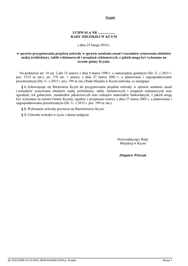 Projekt UCHWAŁA NR .................... RADY MIEJSKIEJ W KCYNI z dnia 25 lutego 2016 r. w sprawie przygotowania projektu uchwały w sprawie ustalenia zasad i warunków sytuowania obiektów małej architektury, tablic reklamowych i urządzeń reklamowych, z jakich mogą być wykonane na terenie gminy Kcynia. Na podstawie art. 18 ust. 2 pkt 15 ustawy z dnia 8 marca 1990 r. o samorządzie gminnym (Dz. U. z 2015 r. poz. 1515 ze zm.), art. 37b ust. 1 ustawy z dnia 27 marca 2003 r. o planowaniu i zagospodarowaniu przestrzennym (Dz. U. z 2015 r. poz. 199 ze zm.) Rada Miejska w Kcyni uchwala, co następuje: § 1. Zobowiązuje się Burmistrza Kcyni do przygotowania projektu uchwały w sprawie ustalenia zasad i warunków sytuowania obiektów małej architektury, tablic reklamowych i urządzeń reklamowych oraz ogrodzeń, ich gabarytów, standardów jakościowych oraz rodzajów materiałów budowlanych, z jakich mogą być wykonane na terenie Gminy Kcynia, zgodnie z przepisami ustawy z dnia 27 marca 2003 r. o planowaniu i zagospodarowaniu przestrzennym (Dz. U. z 2015 r. poz. 199 ze zm.). § 2. Wykonanie uchwały powierza się Burmistrzowi Kcyni. § 3. Uchwała wchodzi w życie z dniem podjęcia. Przewodniczący Rady Miejskiej w Kcyni Zbigniew Witczak Id: D1EC049F-61A2-493C-9B49-0A8848A299AA. Projekt Strona 1 UZASADNIENIE W celu przeciwdziałaniu lokalizowaniu w przestrzeni publicznej w sposób praktycznie dowolny i bez żadnych ograniczeń co do wyglądu tablic i urządzeń reklamowych ustawa z dnia 24 kwietnia 2015 r. o zmianie niektórych ustaw w związku ze wzmocnieniem narzędzi ochrony krajobrazu (Dz. U. 2015 poz. 774) przyznała radom gmin kompetencję do ustalania w formie samodzielnego aktu prawa miejscowego zasad i warunków sytuowania obiektów małej architektury, tablic i urządzeń reklamowych oraz ogrodzeń, ich gabarytów, standardów jakościowych oraz rodzajów materiałów budowlanych, z jakich mogą być wykonane na terenie gminy Kcynia (zwanych dalej Zasadami). Dotychczas brak było odpowiednich rozwiązań prawnych. Samorząd lokalny miał bowiem, do dnia uchwalenia tzw. Ustawy krajobrazowej, bardzo ograniczone możliwości wpływania na ład reklamowy na swoim terenie. Na terenach innych niż obszarowe formy ochrony przyrody, czy parki kulturowe, ustalenie zasad i warunków sytuowania tablic i urządzeń reklamowych było jedynie możliwe poprzez miejscowe plany zagospodarowania przestrzennego (por. art. 15 ust. 3 pkt 9 ustawy o planowaniu i zagospodarowaniu przestrzennym). Nierozwiązywalny był problem skutecznej egzekucji zapisów miejscowych planów w zakresie reklam na nieruchomościach nie wchodzących w skład gminnego zasobu. Ustawa krajobrazowa daje również narzędzia do przeciwdziałaniu nasilającemu się zjawisku grodzenia osiedli tzw. gettoizacja. Przepisy umożliwiają ustalenie zakazu sytuowania ogrodzeń oraz określenia warunków i terminu dostosowania istniejących ogrodzeń do zakazów, zasad i warunków określonych w uchwale rady gminy. Opracowanie Zasad umożliwi również ewentualne podjęcie uchwały w sprawie określenia wysokości opłaty reklamowej i jej pobieranie od posiadaczy tablic i urządzeń reklamowych. Przyjęcie Uchwały w sprawie przygotowania projektu uchwały o zasadach i warunkach sytuowania obiektów małej architektury, tablic reklamowych i urządzeń reklamowych oraz ogrodzeń, ich gabaryty, standardy jakościowe oraz rodzaje materiałów budowlanych, z jakich mogą być wykonane, umożliwi rozpoczęcie prac przez Burmistrza Kcyni nad projektem uchwały o Zasadach. Mając powyższe na uwadze, podjęcie niniejszej uchwały należy uznać za celowe i zasadne. Id: D1EC049F-61A2-493C-9B49-0A8848A299AA. Projekt Strona 1
