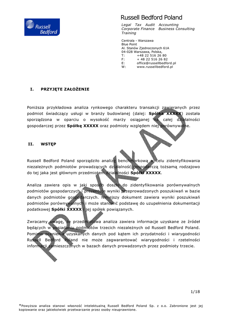 Russell Bedford Poland Legal Tax Audit Corporate Finance Training Accounting Business Consulting Centrala - Warszawa Blue Point Al. Stanów Zjednoczonych 61A 04-028 Warszawa, Polska, T: +48 22 516 26 80 F: + 48 22 516 26 82 E: [email protected] W: www.russellbedford.pl I. PRZYJĘTE ZAŁOŻENIE Poniższa przykładowa analiza rynkowego charakteru transakcji zawieranych przez podmiot świadczący usługi w branży budowlanej (dalej: Spółka XXXXX) została sporządzona w oparciu o wysokość marży osiąganej na całej działalności gospodarczej przez Spółkę XXXXX oraz podmioty względem niej porównywalne. II. WSTĘP Russell Bedford Poland sporządziło analizę benchmarkową w celu zidentyfikowania niezależnych podmiotów prowadzących działalność gospodarczą tożsamą rodzajowo do tej jaka jest głównym przedmiotem działalności Spółki XXXXX. Analiza zawiera opis w jaki sposób doszło do zidentyfikowania porównywalnych podmiotów gospodarczych i prezentuje wyniki przeprowadzonych poszukiwań w bazie danych podmiotów gospodarczych. Niniejszy dokument zawiera wyniki poszukiwań podmiotów porównywalnych i może stanowić podstawę do uzupełnienia dokumentacji podatkowej Spółki XXXXX i jej spółek powiązanych. Zwracamy uwagę, że przedmiotowa analiza zawiera informacje uzyskane ze źródeł będących w posiadaniu podmiotów trzecich niezależnych od Russell Bedford Poland. Pomimo ocenienia uzyskanych danych pod kątem ich przydatności i wiarygodności Russell Bedford Poland nie może zagwarantować wiarygodności i rzetelności informacji zamieszczonych w bazach danych prowadzonych przez podmioty trzecie. 1/18 *Powyższa analiza stanowi własność intelektualną Russell Bedford Poland Sp. z o.o. Zabronione jest jej kopiowanie oraz jakiekolwiek przetwarzanie przez osoby nieuprawnione. Przykładowa analiza benchmarkowa sporządzona przez ekspertów Russell Bedford Poland Sp. z o.o. III. POSZUKIWANIE PORÓWNYWALNYCH PODMIOTÓW W celu znalezienia podmiotów porównywalnych dokonaliśmy analizę firm zajmujących się produkcją i sprzedażą urządzeń dźwigowych oraz znaleźliśmy podmioty o podobnym poziomie zaawansowania technologicznego i o podobnych funkcjach do tych pełnionych przez Spółkę XXXXX. 1. DEFINICJA PODMIOTÓW PORÓWNYWALNYCH Podmioty traktowane jako porównywalne dla potrzeb niniejszej analizy powinny odpowiadać następującej charakterystyce: • działać na rynku urządzeń dźwigowych, • dokonywać sprzedaży towarów i usług do niepowiązanych odbiorców, • oferować usługi pomocnicze związane z eksploatacją urządzeń dźwigowych, • opracowywać ekspertyzy, plany budowy i montażu dotyczące urządzeń dźwigowych, • tworzyć lub wdrażać innowacyjne technologie wykorzystywane na rynku krajowym, • do grona klientów zaliczać zarówno zakłady produkcyjne jak i podmioty konkurencyjne na rynku, • spełniać wspólne kryterium geograficzne (prowadzić zakład w Polsce). Celem badania było porównanie zagregowanych wyników spółek, przy uwzględnieniu faktu, że wymienione firmy nie prowadzą działalności identycznej, lecz działalność porównywalną. Celem określenia kryteriów porównywalności jest znalezienie punktu odniesienia do oceny przydatności danych z rynku. 2/18 *Powyższa analiza stanowi własność intelektualną Russell Bedford Poland Sp. z o.o. Zabronione jest jej kopiowanie oraz jakiekolwiek przetwarzanie przez osoby nieuprawnione. Przykładowa analiza benchmarkowa sporządzona przez ekspertów Russell Bedford Poland Sp. z o.o. 2. PRZEDSTAWIENIE PODMIOTÓW PORÓWNYWALNYCH W poniższej tabeli w oparciu o przyjęte kryteria wyszukiwania zostało wytypowanych 12 podmiotów porównywalnych pod względem prowadzonej działalności gospodarczej do Spółki XXXXX. Poniższa tabela nr 1 przedstawia charakterystykę podmiotów porównywalnych względem Spółki XXXXX L.p. 1. Nazwa Dane podmiotu adresowe Spółka AAAAA z ograniczoną (ulica) Przedmiot (miasto) AAAAA odpowiedzialnością (dalej: AAAAA) Spółka Opis przedmiotu działalności działalności obejmuje produkcję projekty suwnic województwo typów oraz dolnośląskie serwisowanie Spółki i wszystkich montaż, naprawy i urządzeń dźwignicowych. KRS: 00000XXXXX Spółka AAAAA wykonuje również modernizację konstrukcji nośnych, napędów i sterowania dźwignic jak również ekspertyzy i oceny stanu dźwignic i również usługi technicznego podtorzy. Świadczy związane z budową i remontami podtorzy i torów dźwignicowych zawiesi np. oraz linowych, łańcuchowych, pasowych. Dostarcza części akcesoria prawidłowego oferowanych zamienne niezbędne i do funkcjonowania zespołów suwnicowych. 3/18 *Powyższa analiza stanowi własność intelektualną Russell Bedford Poland Sp. z o.o. Zabronione jest jej kopiowanie oraz jakiekolwiek przetwarzanie przez osoby nieuprawnione. Przykładowa analiza benchmarkowa sporządzona przez ekspertów Russell Bedford Poland Sp. z o.o. 2. Spółka BBBBB z ograniczoną (ulica) Spółka BBBBB oferuje urządzenia (miasto) transportu odpowiedzialnością (dalej: Spółka BBBBB) bliskiego takie jak suwnice, żurawie, wciągarki, województwo wciągniki oraz osprzęt małopolskie transportowy tj. zawiesia i trawersy. Projektuje podtorza dla KRS: 00000XXXXX suwnic i posadowienia dla żurawi. Zajmuje się również świadczeniem usług modernizacyjnych konserwacją oraz i serwisowaniem urządzeń dostarczonych klientowi lub powierzonych nadzorowi. Spółka BBBBB produkuje specjalistyczne dźwignicowe platform urządzenia i serwisowe wiertniczych przemysłowe dla oraz konstrukcje stalowe. 3. Spółka CCCCC z ograniczoną (ulica) Spółka (miasto) produkuje odpowiedzialnością (dalej: Spółka różnych województwo opolskie CCCCC) CCCCC projektuje suwnice typów oraz i i żurawie wykonuje montaże i demontaże urządzeń dźwignicowych. KRS: 00000XXXXX Świadczy również modernizacyjne naprawy i oraz usługi remonty, k