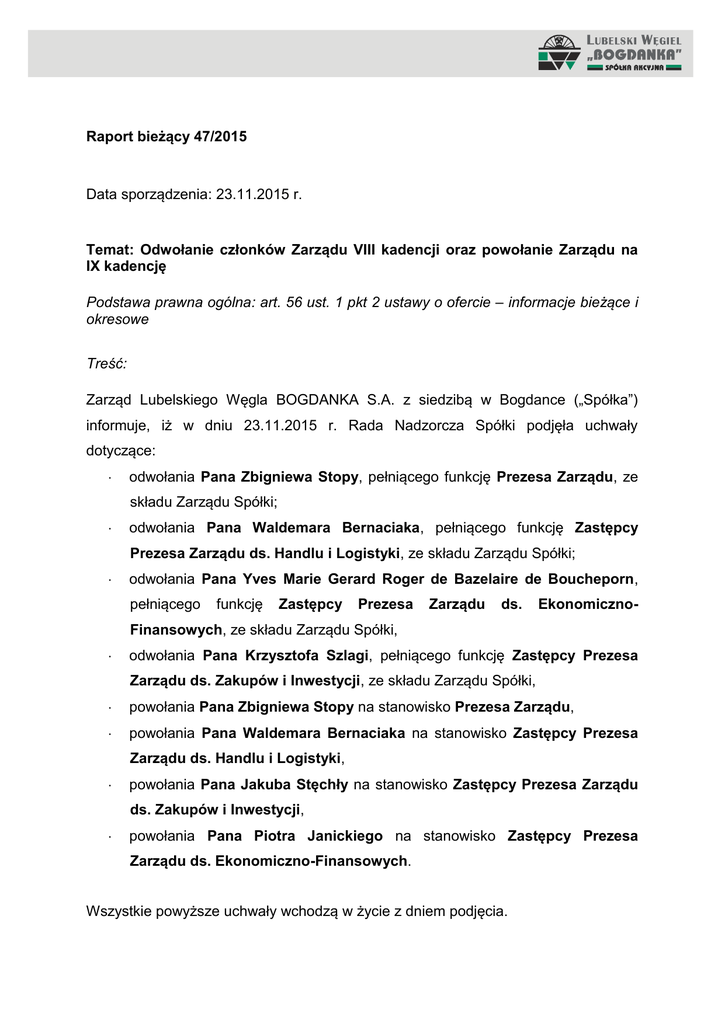 Raport bieżący 47/2015 Data sporządzenia: 23.11.2015 r. Temat: Odwołanie członków Zarządu VIII kadencji oraz powołanie Zarządu na IX kadencję Podstawa prawna ogólna: art. 56 ust. 1 pkt 2 ustawy o ofercie – informacje bieżące i okresowe Treść: Zarząd Lubelskiego Węgla BOGDANKA S.A. z siedzibą w Bogdance („Spółka”) informuje, iż w dniu 23.11.2015 r. Rada Nadzorcza Spółki podjęła uchwały dotyczące: odwołania Pana Zbigniewa Stopy, pełniącego funkcję Prezesa Zarządu, ze składu Zarządu Spółki; odwołania Pana Waldemara Bernaciaka, pełniącego funkcję Zastępcy Prezesa Zarządu ds. Handlu i Logistyki, ze składu Zarządu Spółki; odwołania Pana Yves Marie Gerard Roger de Bazelaire de Boucheporn, pełniącego funkcję Zastępcy Prezesa Zarządu ds. Ekonomiczno- Finansowych, ze składu Zarządu Spółki, odwołania Pana Krzysztofa Szlagi, pełniącego funkcję Zastępcy Prezesa Zarządu ds. Zakupów i Inwestycji, ze składu Zarządu Spółki, powołania Pana Zbigniewa Stopy na stanowisko Prezesa Zarządu, powołania Pana Waldemara Bernaciaka na stanowisko Zastępcy Prezesa Zarządu ds. Handlu i Logistyki, powołania Pana Jakuba Stęchły na stanowisko Zastępcy Prezesa Zarządu ds. Zakupów i Inwestycji, powołania Pana Piotra Janickiego na stanowisko Zastępcy Prezesa Zarządu ds. Ekonomiczno-Finansowych. Wszystkie powyższe uchwały wchodzą w życie z dniem podjęcia. Wszyscy Członków Zarządu zostali powołani na okres wspólnej kadencji, która trwa trzy lata. Zgodnie z oświadczeniami złożonymi przez nowych członków Zarządu żaden z nich nie uczestniczy w spółce konkurencyjnej wobec LWB jako wspólnik spółki cywilnej, spółki osobowej lub jako członek organu spółki kapitałowej, ani nie uczestniczy w innej konkurencyjnej osobie prawnej jako członek jej organu. Zgodnie z oświadczeniami złożonymi przez nowych członków Zarządu żaden z nich nie jest wpisany do Rejestru Dłużników Niewypłacalnych, prowadzonym na podstawie ustawy o KRS. Zarząd Spółki przekazuje w załączeniu szczegółowe informacje dotyczące wykształcenia, kwalifikacji i stanowisk zajmowanych przez powołanych Członków Zarządu LW BOGDANKA S.A., wraz z przebiegiem ich kariery zawodowej. Podstawa prawna: RMF GPW § 5 ust.1 pkt. 21, 22