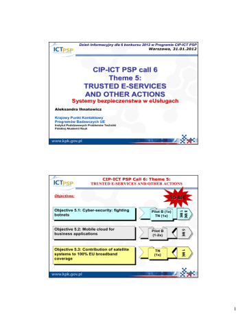 Dzień Informacyjny dla 6 konkursu 2012 w Programie CIP-ICT PSP Warszawa, 31.01.2012 CIP-ICT PSP call 6 Theme 5: TRUSTED E-SERVICES AND OTHER ACTIONS Systemy bezpieczenstwa w eUsł eUsługach Aleksandra Ihnatowicz Krajowy Punkt Kontaktowy Programów Badawczych UE Instytut Podstawowych Problemów Techniki Polskiej Akademii Nauk CIPCIP-ICT PSP Call 6: Theme 5: TRUSTED EE-SERVICES AND OTHER ACTIONS Objectives: 15 M€ M Pilot PilotBB(1x) (1x) TN TN(1x) (1x) Objective Objective5.2: 5.2:Mobile Mobilecloud cloudfor for business applications business applications Pilot PilotBB (1-2x) (1-2x) M€ M 55M€ TN TN (1x) (1x) M€ M 11M€ Objective Objective5.3: 5.3:Contribution Contributionof ofsatellite satellite systems systemsto to100% 100%EU EUbroadband broadband coverage coverage M€ M 88M€ M€ 11M€ Objective Objective5.1: 5.1:Cyber-security: Cyber-security:fighting fighting botnets botnets 1 Objective 5.1: CyberCyber-security: fighting botnets Bezpieczeństwo w sieci: zwalczanie botnetów Zagroż Zagrożenie: Botnety Definicja: sieć sieć zainfekowanych komputeró komputerów kontrolowanych jako grupa bez wiedzy wł właścicieli Metoda stosowana w cyber przestepczoś przestepczości (np. atakowanie i blokowanie usł usług, spyware, spam) Przykł Przykłady: Conficker: spamming za pomocą 10 millionów botów (2009) DDoS atak na Estoński rząd (2007) DNSChanger (2011), przekierowywanie do płatnych serwisów Działania Anonymous (2012) Skutek: Obniż Obniżenie zaufania do eUsł eUsług Jak zwalczać zwalczać ? -Analiza -Przeciwdziałanie Znalezienie podejść podejść do ró różnorodnych technologii botnetó botnetów -Zwalczanie Dobór narzę ędzi do ograniczenia botnetów, Zapobieganie infekcji, Zidentyfikowanie i przejęcie kontroli nad głównym serwerem atakującym Brać pod uwagę czynniki prawne i ekonomiczne Zaangażowanie różnych odbiorców: dostawcy usług internetowych, operatorzy sieci, producenci oprogramowania, organy władzy, jednostki badawczo rozwojowe Budowanie zaufania pomiędzy użytkownikami: wymiana informacji i umożliwienie współpracy 2 Projekt: Pilotaż Pilotaż B Fighting botnets Śledź, integruj, demonstruj -Najlepsze dostępne techniki i narzę ędzia do wykrywania, ograniczania i symulacji botnetów. -Wdrożenie najlepszych praktyk poprzez rozwój platform pilotażowych -Zwiększanie świadomości użytkowników o zasadach bezpieczenstwa i środkach ostrożności Identyfikuj Możliwości i bariery w formach interwencji w przypadku ataku z dostosowaniem się do przepisów prawnych i praw użytkowników Projekt: Thematic Network Community building for information sharing and effective responses to cyber threats Buduj Trwałą infrastrukturę sieciową zapewniającą bezpieczną ą wymianę ę informacji wobec zagrożen i ataków Okreś ślaj Wspólne wymagania adresujące cyber ataki i wymianę najlepszych praktyk Organizuj Regularne warsztaty, seminaria i szkolenia podnoszące świadomość i rozszerzające kompetencje Łączność z istniejącymi podmiotami i inicjatywami 3 CIPCIP-ICT PSP Call 6: Theme 5.1: CyberCyber-security: fighting botnets Zakł Zakładane rezultaty: rezultaty: Specyfikacja techniczna wykrywania i zwalczania botnetów Przykładowa implementacja do dalszego wdrażania na terenie Europy Przewodniki i zestawienie najlepszych praktyk w zwalczaniu botnetów Większa świadomość pośród użytkowników Przyspieszonie wprowadzenia innowacyjnych rozwiązań bezpieczeństwa w sieci Wzmacnianie współpracy międzysektorowej Zwiększenie zaufania wobec dalszych wspólnych działań przeciw cyber-przestępczości Rezultat: Zwiększenie cyber bezpieczeństwa! Objective 5.2: Mobile cloud for business applications Mobilne aplikacje dla businessu w chmurze Obecnie: -Mobilny ekosystem pofragmentowany: różne aplikacje dla innych platform -Utrudniona komunikacja między platformami -Sieć mobilna nie zapewnia wymaganej w przypadku aplikacji businesowych niezawodności i wiarygodności 4 Objective 5.2: Mobile cloud for business applications Dział Działanie: Stymulacja powstania mobilnej chmury dla klientów korzystających z aplikacji businesowych poprzez urządzenia przenośne Zorientowane na użytkownika businesowego aplikacje, w których możliwość współpracy, bezpieczna wymiana danych i niezawodność są podstawowymi wyznanicznikami Uwzględnienie aspektów bezpieczeń ństwa, zaufania, zgodnoś ści i uwierzytelniania jak również zarządzania i zdalnego wsparcia potrzebnego w środowisku biznesowym Otwartoś śc i interoperacyjność ść między chmurami a platformami mobilnymi Projekt: dział działania pilotaż pilotażowe Istota projektu: Zbadanie właściwości sieci mobilnych wpływających na jakość usług (dostępność sieci-przerwy w dostawie usług, zmienna jakość i szybkość przesyłu danych) Powinien zawierać 4 do 8 uzupełniających się eksperymentów obejmujących zastosowania mobilnej chmury w oparciu o istniejące już aplikacje lub usługi. Rozwinię ęcie istniejącej już platformy dla aplikacji businessowych na której mogłaby byc zaprojektowana i wdrożona aplikacja dla mobilnej chmury. Kompleksowe businessowe scenariusze zastosowań ń obejmujące współłpracę ę róż żnych aplikacji i urzą ądzeń ń 5 Mobilne aplikacje w oparciu o chmurę chmurę w programach EU Rozwój Rozwójtechnologii technologii Aplikacje Aplikacjew woparciu oparciuoomobilna mobilnachmurę chmurę są sączęścią częściązintegrowanego zintegrowanegoprogramu programu partnerstwa publiczno prywatnego partnerstwa publiczno prywatnego Businessowe Businessoweaplikacje aplikacje w ąąchmurę ęę woparciu oparciuoomobilną mobilną chmurę na przenośnych na przenośnychurzadzeniach urzadzeniach Badanie Rozwój Wdrożenie Objective 5.3: Contribution of satellite systems to 100% EU broadband coverage Cele wyznaczone przez Europejską Agendę Cyfrową: Dostę Dostęp do Internetu 2013 BB/internet dla 100% 2020 ≥30