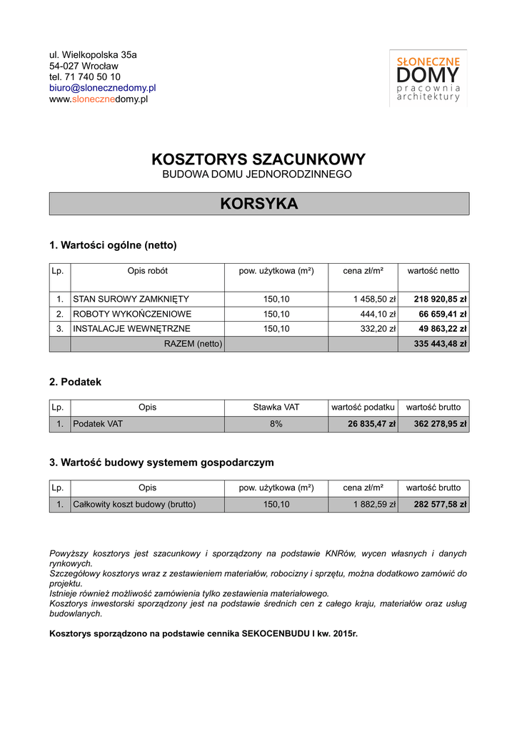 ul. Wielkopolska 35a 54-027 Wrocław tel. 71 740 50 10 [email protected] www.slonecznedomy.pl KOSZTORYS SZACUNKOWY BUDOWA DOMU JEDNORODZINNEGO KORSYKA 1. Wartości ogólne (netto) Lp. Opis robót pow. użytkowa (m²) cena zł/m² wartość netto 1. STAN SUROWY ZAMKNIĘTY 150,10 1 458,50 zł 218 920,85 zł 2. ROBOTY WYKOŃCZENIOWE 150,10 444,10 zł 66 659,41 zł 3. INSTALACJE WEWNĘTRZNE 150,10 332,20 zł 49 863,22 zł RAZEM (netto) 335 443,48 zł 2. Podatek Lp. 1. Opis Podatek VAT Stawka VAT 8% wartość podatku 26 835,47 zł wartość brutto 362 278,95 zł 3. Wartość budowy systemem gospodarczym Lp. 1. Opis Całkowity koszt budowy (brutto) pow. użytkowa (m²) 150,10 cena zł/m² 1 882,59 zł wartość brutto 282 577,58 zł Powyższy kosztorys jest szacunkowy i sporządzony na podstawie KNRów, wycen własnych i danych rynkowych. Szczegółowy kosztorys wraz z zestawieniem materiałów, robocizny i sprzętu, można dodatkowo zamówić do projektu. Istnieje również możliwość zamówienia tylko zestawienia materiałowego. Kosztorys inwestorski sporządzony jest na podstawie średnich cen z całego kraju, materiałów oraz usług budowlanych. Kosztorys sporządzono na podstawie cennika SEKOCENBUDU I kw. 2015r.