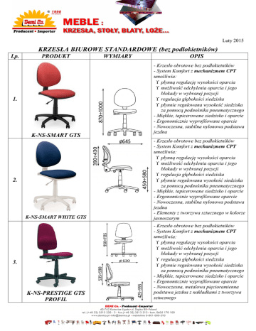 Luty 2015 KRZESŁA BIUROWE STANDARDOWE (bez podłokietników) Lp. PRODUKT 1. K-NS-SMART GTS WYMIARY OPIS - Krzesło obrotowe bez podłokietników - System Komfort z mechanizmem CPT umożliwia: ° płynną regulację wysokości oparcia ° możliwość odchylenia oparcia i jego blokady w wybranej pozycji ° regulacja głębokości siedziska ° płynnie regulowana wysokość siedziska za pomocą podnośnika pneumatycznego - Miękkie, tapicerowane siedzisko i oparcie - Ergonomicznie wyprofilowane oparcie - Nowoczesna, stabilna nylonowa podstawa jezdna K-NS-SMART WHITE GTS - Krzesło obrotowe bez podłokietników - System Komfort z mechanizmem CPT umożliwia: ° płynną regulację wysokości oparcia ° możliwość odchylenia oparcia i jego blokady w wybranej pozycji ° regulacja głębokości siedziska ° płynnie regulowana wysokość siedziska za pomocą podnośnika pneumatycznego - Miękkie, tapicerowane siedzisko i oparcie - Ergonomicznie wyprofilowane oparcie - Nowoczesna, stabilna nylonowa podstawa jezdna - Elementy z tworzywa sztucznego w kolorze jasnoszarym K-NS-PRESTIGE GTS PROFIL - Krzesło obrotowe bez podłokietników - System Komfort z mechanizmem CPT umożliwia: ° płynną regulację wysokości oparcia ° możliwość odchylenia oparcia i jego blokady w wybranej pozycji ° regulacja głębokości siedziska ° płynnie regulowana wysokość siedziska za pomocą podnośnika pneumatycznego - Miękkie, tapicerowane siedzisko i oparcie - Ergonomicznie wyprofilowane oparcie - Nowoczesna, metalowa pięcioramienna podstawa jezdna z nakładkami z tworzywa sztucznego 2. 3. - Krzesło obrotowe bez podłokietników - Siedzisko i oparcie ze sklejki - Płynnie regulowana wysokość siedziska - Nowoczesna, stabilna pięcioramienna chromowana podstawa jezdna 15. K-NS-BINGO wood gts chrome - Krzesło obrotowe bez podłokietników - Miękkie tapicerowane siedzisko i oparcie - Płynnie regulowana wysokość siedziska - Nowoczesna, stabilna pięcioramienna chromowana podstawa jezdna 16. K-NS-BINGO wood plus gts chrome - Krzesło obrotowe bez podłokietników - System Ergo z mechanizmem EPRON SYNCHRON umożliwia: 19. K-NS- EXTREME II gts ° synchroniczne odchylenie oparcia wraz z siedziskiem w stosunku 2:1 ° możliwość blokady siedziska i oparcia w 4 pozycjach ° regulowaną siła oporu oparcia ° funkcję Up&Down -płynnie regulowana wysokość oparcia i podparcia lędźwi ° Anti-Shock - zabezpieczenie przed uderzeniem oparcia w plecy ° płynnie regulowaną wysokość siedziska - Miękkie, tapicerowane siedzisko i oparcie - Dekoracyjny element z tylu oparcia - Stabilna, nylonowa podstawa jezdna - Krzesło obrotowe bez podłokietników - System Ergo z mechanizmem EPRON SYNCHRON umożliwia: 20. K-NS-EXTREME II gts steel 02 chrome ° synchroniczne odchylenie oparcia wraz z siedziskiem w stosunku 2:1 ° możliwość blokady siedziska i oparcia w 4 pozycjach ° regulowaną siła oporu oparcia ° funkcję Up&Down -płynnie regulowana wysokość oparcia i podparcia lędźwi ° Anti-Shock - zabezpieczenie przed uderzeniem oparcia w plecy ° płynnie regulowaną wysokość siedziska - Miękkie, tapicerowane siedzisko i oparcie - Dekoracyjny element z tylu oparcia - Stabilna, chromowana podstawa jezdna Więcej informacji na temat produktów znajdziesz również na naszych stronach internetowych www.meblebiurowe.demico.pl oraz www.demico.pl