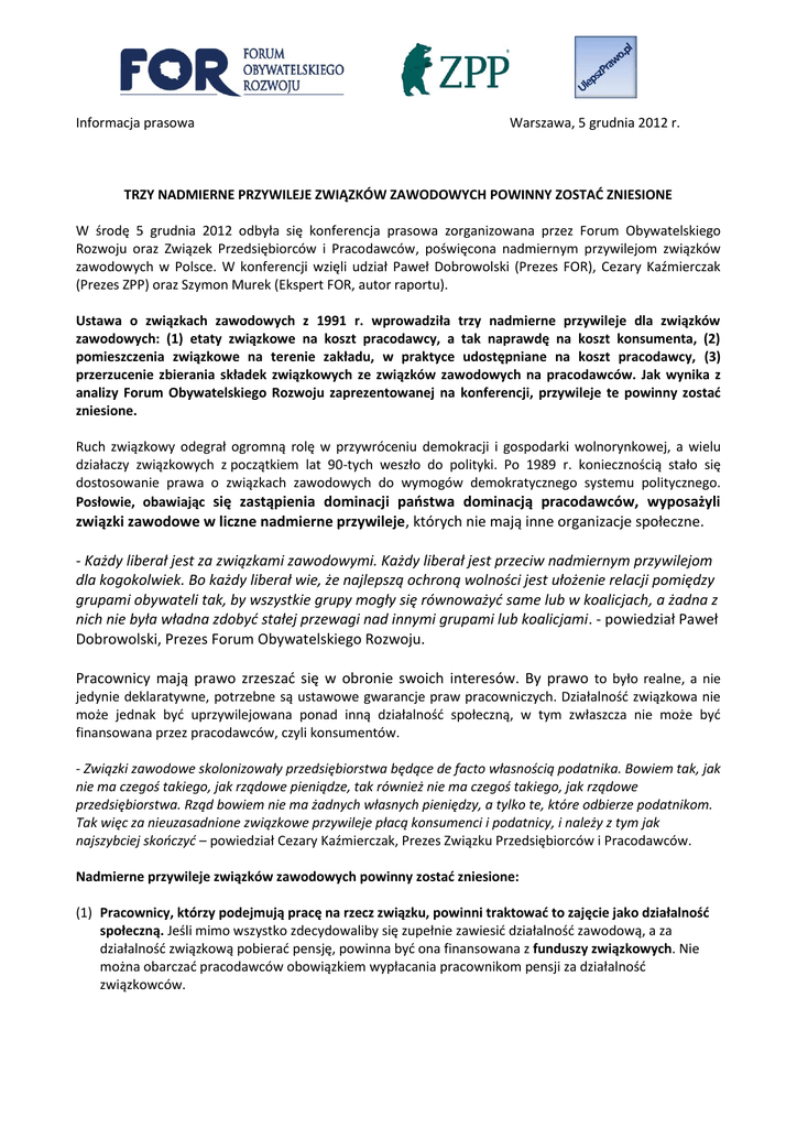 Informacja prasowa Warszawa, 5 grudnia 2012 r. TRZY NADMIERNE PRZYWILEJE ZWIĄZKÓW ZAWODOWYCH POWINNY ZOSTAĆ ZNIESIONE W środę 5 grudnia 2012 odbyła się konferencja prasowa zorganizowana przez Forum Obywatelskiego Rozwoju oraz Związek Przedsiębiorców i Pracodawców, poświęcona nadmiernym przywilejom związków zawodowych w Polsce. W konferencji wzięli udział Paweł Dobrowolski (Prezes FOR), Cezary Kaźmierczak (Prezes ZPP) oraz Szymon Murek (Ekspert FOR, autor raportu). Ustawa o związkach zawodowych z 1991 r. wprowadziła trzy nadmierne przywileje dla związków zawodowych: (1) etaty związkowe na koszt pracodawcy, a tak naprawdę na koszt konsumenta, (2) pomieszczenia związkowe na terenie zakładu, w praktyce udostępniane na koszt pracodawcy, (3) przerzucenie zbierania składek związkowych ze związków zawodowych na pracodawców. Jak wynika z analizy Forum Obywatelskiego Rozwoju zaprezentowanej na konferencji, przywileje te powinny zostać zniesione. Ruch związkowy odegrał ogromną rolę w przywróceniu demokracji i gospodarki wolnorynkowej, a wielu działaczy związkowych z początkiem lat 90-tych weszło do polityki. Po 1989 r. koniecznością stało się dostosowanie prawa o związkach zawodowych do wymogów demokratycznego systemu politycznego. Posłowie, obawiając się zastąpienia dominacji państwa dominacją pracodawców, wyposażyli związki zawodowe w liczne nadmierne przywileje, których nie mają inne organizacje społeczne. - Każdy liberał jest za związkami zawodowymi. Każdy liberał jest przeciw nadmiernym przywilejom dla kogokolwiek. Bo każdy liberał wie, że najlepszą ochroną wolności jest ułożenie relacji pomiędzy grupami obywateli tak, by wszystkie grupy mogły się równoważyć same lub w koalicjach, a żadna z nich nie była władna zdobyć stałej przewagi nad innymi grupami lub koalicjami. - powiedział Paweł Dobrowolski, Prezes Forum Obywatelskiego Rozwoju. Pracownicy mają prawo zrzeszać się w obronie swoich interesów. By prawo to było realne, a nie jedynie deklaratywne, potrzebne są ustawowe gwarancje praw pracowniczych. Działalność związkowa nie może jednak być uprzywilejowana ponad inną działalność społeczną, w tym zwłaszcza nie może być finansowana przez pracodawców, czyli konsumentów. - Związki zawodowe skolonizowały przedsiębiorstwa będące de facto własnością podatnika. Bowiem tak, jak nie ma czegoś takiego, jak rządowe pieniądze, tak również nie ma czegoś takiego, jak rządowe przedsiębiorstwa. Rząd bowiem nie ma żadnych własnych pieniędzy, a tylko te, które odbierze podatnikom. Tak więc za nieuzasadnione związkowe przywileje płacą konsumenci i podatnicy, i należy z tym jak najszybciej skończyć – powiedział Cezary Kaźmierczak, Prezes Związku Przedsiębiorców i Pracodawców. Nadmierne przywileje związków zawodowych powinny zostać zniesione: (1) Pracownicy, którzy podejmują pracę na rzecz związku, powinni traktować to zajęcie jako działalność społeczną. Jeśli mimo wszystko zdecydowaliby się zupełnie zawiesić działalność zawodową, a za działalność związkową pobierać pensję, powinna być ona finansowana z funduszy związkowych. Nie można obarczać pracodawców obowiązkiem wypłacania pracownikom pensji za działalność związkowców. (2) Lokal na terenie zakładu to nie prawo, ale nadmierny przywilej. Inne organizacje społeczne nie mogą oczekiwać, że ktoś inny zapewni im na swój koszt lokal i jego wyposażenie do działalności. Można rozważać zagwarantowanie prawa związkowców do zwołania spotkania pracowników na terenie zakładu. (3) Wiele organizacji społecznych pobiera od swych członków składki. Związki zawodowe nie są tu wyjątkiem, ale mają wyjątkowy przywilej zbierania swoich składek przez pracodawców i na koszt pracodawców. Powinny to robić na własny koszt i ryzyko, chyba że pracodawca dobrowolnie zgodzi się zbierać składki związkowe. *** Do informacji prasowej dołączone zostały materiały video. ZPP i FOR, jako ich producenci, udzielają zgody na nieodpłatną publikację tych materiałów w internecie i telewizji oraz w serwisach mobilnych. Komentarz Pawła Dobrowolskiego - Prezesa Forum Obywatelskiego Rozwoju: Pobierz (Plik Zapisz stronę jako…): http://www.for.org.pl/FORinternet.MP4 Obejrzyj: http://youtu.be/N7Cy14yzkbE Komentarz Cezarego Kaźmierczaka - Prezesa Związku Przedsiębiorców i Pracodawców: Pobierz (Plik Zapisz stronę jako…): http://www.for.org.pl/ZPPinternet.MP4 Obejrzyj: http://youtu.be/wrKEvLkvIf0 Pełna wersja wypowiedzi wraz z przebitkami Pobierz (Plik Zapisz stronę jako…): http://www.for.org.pl/FORZPP.MP4 *** Dodatkowe informacje: Szymon Murek (autor analizy) kom. 604 289 999, e-mail: [email protected] Natalia Wykrota (Forum Obywatelskiego Rozwoju) kom. 609 717 102, e-mail: [email protected] www.for.org.pl Katarzyna Klimek (Związek Przedsiębiorców i Pracodawców) kom. 502-605-126, e-mail: [email protected] www.zpp.net.pl