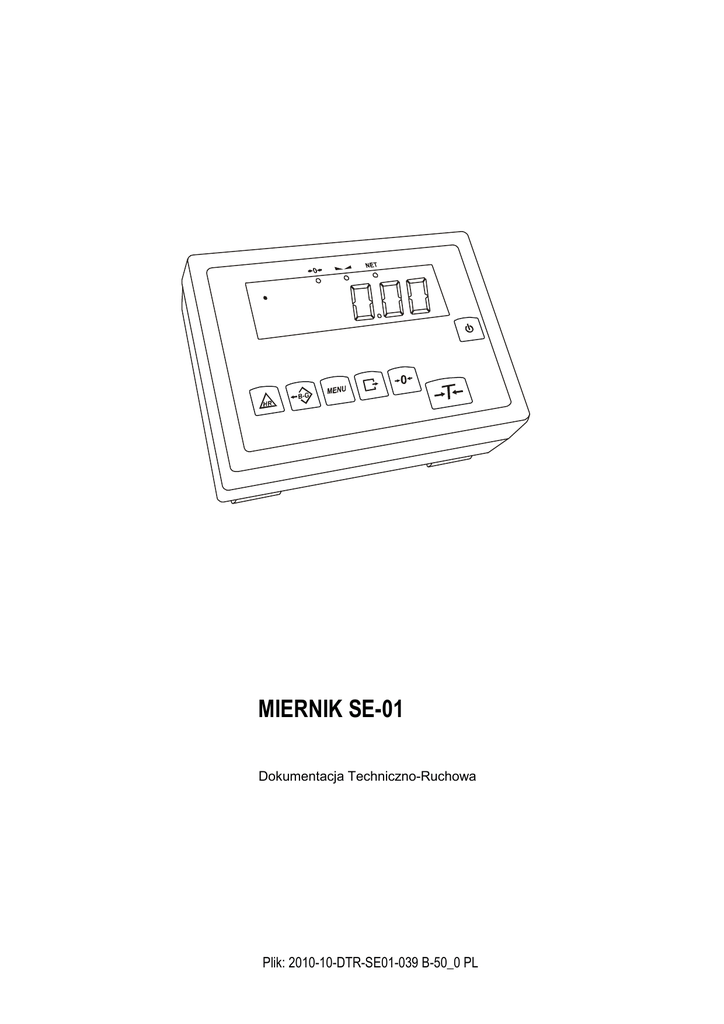 MIERNIK SE-01 Dokumentacja Techniczno-Ruchowa Plik: 2010-10-DTR-SE01-039 B-50_0 PL 2 INSTRUKCJA OBSŁUGI _____________________________________________________________________________________________________________________ Spis treści: 1. Wstęp ............................................................................................................................................... 3 2. Certyfikaty ........................................................................................................................................ 3 3. Kompletacja...................................................................................................................................... 3 4. Zasady bezpieczeństwa ................................................................................................................... 4 5. Zasady postępowania ze zuŜytym miernikiem ................................................................................. 4 6. Klawisze i wskaźniki wagi................................................................................................................. 5 7. Dane techniczne............................................................................................................................... 6 8. MontaŜ i podłączenie urządzeń zewnętrznych ................................................................................. 8 8.1 Złącza komunikacyjne .................................................................................................................... 10 8.2 Złącze przekaźników ...................................................................................................................... 11 8.3 Złącze zewnętrznych klawiszy........................................................................................................ 12 8.4 Złącze 4-20mA ............................................................................................................................... 13 8.5 Listwa do podłączeń urządzeń zewnętrznych ................................................................................ 15 9. Ogólne zasady eksploatacji............................................................................................................ 16 10. Współpraca miernika z układami automatyki (opcja)...................................................................... 16 11. Współpraca z komputerem lub drukarką (opcja) ............................................................................ 16 12. Informacje dodatkowe - złącza szeregowe wagi ............................................................................ 19 13. Podstawowe funkcje wagi .............................................................................................................. 20 13.1 Zwykłe waŜenie .............................................................................................................................. 20 13.2 WaŜenie z tarowaniem ................................................................................................................... 21 13.3 Powiększanie rozdzielczości wagi.................................................................................................. 21 14. Opis funkcji specjalnych wagi......................................................................................................... 22 14.1 Aktualizacja menu funkcji specjalnych (ACtIV i dEFAUL)............................................................... 23 14.2 Funkcja autozerowania (AutoZE) .................................................................................................. 24 14.3 Funkcja liczenia sztuk (PCS).......................................................................................................... 25 14.4 Automatyczny tryb transmisji dla drukarki (PrInt) ........................................................................... 26 14.5 Funkcja ustawiania parametrów portu szeregowego (Port)............................................................ 27 14.6 Funkcja wpisywania tary (tArE) ...................................................................................................... 28 14.7 Funkcja wyliczania średniej (AVErAG) ........................................................................................... 30 14.8 Funkcja sumowania składników receptury (rECIPE) ...................................................................... 31 14.9 Funkcja przeliczania procentowego (PErC).................................................................................... 32 14.10 Funkcja filtr antywstrząsowy (FILtEr).............................................................................................. 33 14.11 Funkcja wskazywania wartości maksymalnej (UP)......................................................................... 34 14.12 Funkcja pomiaru siły (nEWto)......................................................................................................... 35 14.13 Funkcja waŜenia ludzi i zwierząt (LOC).......................................................................................... 36 14.14 Funkcja porównania z zadanymi wartościami progowymi (thr)....................................................... 37 14.15 Funkcja sumowania serii waŜeń (totAL) ......................................................................................... 40 14.16 Funkcja ustawiania aktualnej daty i czasu (dAtE)........................................................................... 42 14.17 Funkcja wyboru numeru etykiety (LAbEL)...................................................................................... 43 14.18 Funkcja kalibracji czułości wagi (CALIb)......................................................................................... 44 14.19 Funkcja ustawiania czasu stabilizacji (Stb).................................................................................... 45 14.20 Funkcja wpisywania zera odniesienia (