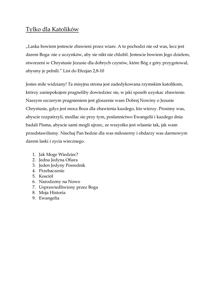 Tylko dla Katolików „Laska bowiem jestescie zbawieni przez wiare. A to pochodzi nie od was, lecz jest darem Boga: nie z uczynków, aby sie nikt nie chlubil. Jestescie bowiem Jego dzielem, stworzeni w Chrystusie Jezusie dla dobrych czynów, które Bóg z góry przygotowal, abysmy je pelnili.” List do Efezjan 2,8-10 Jestes mile widziany! Ta misyjna strona jest zadedykowana rzymskim katolikom, którzy zaniepokojeni pragneliby dowiedziec sie, w jaki sposób uzyskac zbawienie. Naszym szczerym pragnieniem jest gloszenie wam Dobrej Nowiny o Jezusie Chrystusie, gdyz jest moca Boza dla zbawienia kazdego, kto wierzy. Prosimy was, abyscie rozpatrzyli, modlac sie przy tym, poslannictwo Ewangelii i kazdego dnia badali Pisma, abyscie sami mogli ujrzec, ze wszystko jest wlasnie tak, jak wam przedstawilismy. Niechaj Pan bedzie dla was milosierny i obdarzy was darmowym darem laski i zycia wiecznego. 1. 2. 3. 4. 5. 6. 7. 8. 9. Jak Moge Wiedziec? Jedna Jedyna Ofiara Jeden Jedyny Posrednik Przebaczenie Kosciól Narodzony na Nowo Usprawiedliwiony przez Boga Moja Historia Ewangelia JAK MOGE WIEDZIEC? Pisma Swiete „moga cie nauczyc madrosci wiodacej ku zbawieniu przez wiare w Chrystusie Jezusie” (2 List do Tymoteusza 3,15). Jezus opisal nam dwie drogi: szeroka, która prowadzi do zaglady i waska, która prowadzi do zycia. Skad moge wiedziec, która to z dróg prowadzi do nieba i uniknac drugiej? Ewangelia jest prawdziwa droga do zycia, poniewaz jest oredziem Boga do ludzkosci. Ludzie wymyslili wiele religii, ale wszystkie one sa falszywe. Biblia nas przestrzega, ze „swiat przez madrosc nie poznal Boga” (1 List do Koryntian 1,21). Oredzie Boga zostalo zapisane w Biblii. Ona zostala napisana przez wybrane, kierowane przez Ducha Swietego osoby. Mozemy zaufac Biblii, gdyz jest ksiega Boga. Mozemy równiez miec pewnosc, ze jest ona bezpiecznym przewodnikiem do nieba. Pisma Swiete „moga cie nauczyc madrosci wiodacej ku zbawieniu przez wiare w Chrystusie Jezusie” (2 List do Tymoteusza 3,15). I co mam sadzic o tradycji koscielnej? Jezus przestrzegl nas przed tradycjami (Ewangelia Marka 7,1-13). On oskarzyl Zydów, ze uchylaja „przykazanie Boze, aby swoja tradycje zachowac”. Powinni pozostac wierni Biblii. W taki sam sposób, tradycja koscielna zmienila wyrazne nauczanie Biblii. Dla przykladu, Kosciól nakazuje uzycie figur, mimo ze drugie przykazanie zakazuje produkcji rzezbionych wizerunków i oddawania im czci (Ksiega Wyjscia 20,4-5). I co mam sadzic o róznych religijnych mistrzach? Powinnismy ich sluchac, ale tylko wówczas, jezeli ich nauczanie bedzie zgodne z Biblia. Badz jak mieszkancy Berei, którzy „przyjeli nauke z cala gorliwoscia i codziennie badali Pisma, czy istotnie tak jest” (Dzieje Apostolskie 17,11). I co mam sadzic o moich wlasnych zdolnosciach rozróznienia i zrozumienia? Powinienes szukac, z wszystkich sil, drogi Bozej, a nie wlasnej. „Z calego serca Bogu zaufaj, a nie polegaj na swoim rozsadku” (Ksiega Przyslów 3,5). Biblia jest jedynym bezpiecznym przewodnikiem do nieba. Osoba, która nauczy sie, uwierzy i pozostanie posluszna jej oredziu, bedzie mogla powiedziec: „Twoje slowo jest lampa dla moich stóp i swiatlem na mojej sciezce" (Psalm 119,105). Seite 2 von 19 OFIARA ZA GRZECH „Chrystus raz jeden byl ofiarowany dla zgladzenia grzechów wielu” (List do Hebrajczyków 9,28). Jestesmy odpowiedzialni za posluszenstwo i za milosc do naszego Stwórcy. Jednakze, od samego poczatku buntujemy sie przeciw Niemu i, z powodu naszych grzechów, jestesmy winni i znajdujemy sie na krawedzi piekla. Istnieje tylko jeden sposób, aby sie uratowac, wlasnie ten, o którym naucza Biblia: „bez rozlania krwi nie ma odpuszczenia grzechów” (List do Hebrajczyków 9,22). W Starym Testamencie Bóg nakazal Swojemu ludowi, aby ten skladal na oltarzu ofiary ze zwierzat. Uczynil to, aby nauczyc go dwóch podstawowych prawd: 1. grzech powinien zostac ukarany; 2. grzesznik moze zostac uwolniony z winy, jezeli inny bedzie ukarany w jego miejsce. Bylo to, co jest oczywiste, wzorem tego, co Jezus, „Baranek Bozy”, mial uczynic na Kalwarii. „Chrystus bowiem równiez raz umarl za grzechy, sprawiedliwy za niesprawiedliwych, aby was do Boga przyprowadzic” (1 List Piotra 3,18). Chrystus, jedyny doskonaly i niewinny, przyjal na siebie grzechy swojego ludu, cierpial i umarl na krzyzu, aby zaplacic cene zazadana przez Prawo Boze. Uwolnieni ze swoich grzechów, Jego uczniowie moga juz teraz isc do Boga bez bojazni. Chrystus zbawil Swój lud z jego grzechów poprzez Swoja ofiare na krzyzu. W przeddzien Swojego cierpienia Jezus ustanowil „Wieczerze Panska”, aby Jego uczniowie dalej wspominali o Nim i o Jego cierpieniu, az do chwili Jego powrotu. Niestety, tradycja dokonala zmiany w jej rozumieniu. Kosciól Katolicki naucza, ze chleb i wino zostaja przemienione w prawdziwe cialo i krew Chrystusa. Prawda jest, ze Jezus powiedzial: „To jest moje cialo... To jest moja krew”. Jednakze, za kazdym razem On dodawal: „To czyncie na moja pamiatke”. Chleb i wino sa wspomnieniem Jego ofiary na krzyzu na Kalwarii. Jednym z powazniejszych bledów w nauczaniu Kosciola Katolickiego jest ten mówiacy, ze msza jest ofiara za grzech. W rzeczywistosci rosci sobie prawo do uznania mszy jako samej ofiary Chrystusa, bowiem ona „uwiecznia” i „czyni obecna” ofiare krzyza. Takie nauczanie przeciwstawia sie wyraznemu nauczaniu Biblii: „Chrystus bowiem wszedl... do samego nieba, aby teraz wstawiac sie za nami przed obliczem Boga, nie po to, aby sie czesto mial ofiarowac jak arcykaplan, który co roku wchodzi do swiatyni z krwia cudza. Inaczej musialby cierpiec wiele razy od stworzenia swiata. A tymczasem raz jeden ukazal sie teraz na koncu wieków na zgladzenie grzechów przez ofiare z samego siebie... Chrystus raz jeden byl ofiarowany dla zgladzenia grzechów wielu” (List do Hebrajczyków 9,24-28). Codzienna ofiara mszy zaklada, ze jeszcze istnieja grzech i wina. W chrzescijanstwie biblijnym nie 