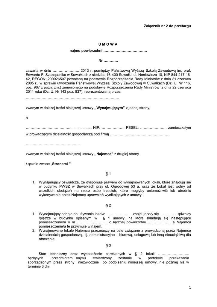 Załącznik nr 2 do przetargu UMOWA najmu powierzchni ……………………………… Nr ………… zawarta w dniu …………………. 2013 r. pomiędzy Państwową Wyższą Szkołą Zawodową im. prof. Edwarda F. Szczepanika w Suwałkach z siedzibą 16-400 Suwałki, ul. Noniewicza 10, NIP 844-217-1642, REGON: 200026507 powołaną na podstawie Rozporządzenia Rady Ministrów z dnia 21 czerwca 2005 r., w sprawie utworzenia Państwowej Wyższej Szkoły Zawodowej w Suwałkach (Dz. U. Nr 116, poz. 967 z późn. zm.) zmienionego na podstawie Rozporządzenia Rady Ministrów z dnia 22 czerwca 2011 roku (Dz. U. Nr 143 poz. 837), reprezentowaną przez: ………………………………………………………………….. zwanym w dalszej treści niniejszej umowy ,,Wynajmującym” z jednej strony, a ……………….………………...................., NIP: ………………, PESEL: …………………, zamieszkałym w prowadzącym działalność gospodarczą pod firmą ………………………………………… …..…………………………………. zwanym w dalszej treści niniejszej umowy ,,Najemcą” z drugiej strony. Łącznie zwane „Stronami ” §1 1. Wynajmujący oświadcza, że dysponuje prawem do wynajmowanych lokali, które znajdują się w budynku PWSZ w Suwałkach przy ul. Ogrodowej 53 a, oraz że Lokal jest wolny od wszelkich obciążeń na rzecz osób trzecich, które mogłyby uniemożliwić lub utrudnić wykonywanie przez Najemcę uprawnień wynikających z umowy. §2 1. Wynajmujący oddaje do używania lokal/e ………………….znajdujące/y się ……………/piwnicy /piętrze w budynku opisanym w § 1 umowy, na które składa/ją się następujące pomieszczenie/a o nr ……………………. o łącznej powierzchni ………………, a Najemca pomieszczenie/a te przyjmuje w najem. 2. Wynajmowane lokale Najemca przeznaczy na cele związane z prowadzoną przez Najemcę działalnością gospodarczą, tj. administracyjno – biurową, usługową lub inną nieuciążliwą dla otoczenia. §3 Stan techniczny oraz wyposażenie określonych w § 2 lokali …………………….. będących przedmiotem najmu stwierdzony zostanie w protokole przekazania sporządzonym przez strony niezwłocznie po podpisaniu niniejszej umowy, nie później niż w terminie 3 dni. 1 §4 1. Najemca zobowiązuje się do używania lokalu/li określonego/ych w § 2 niniejszej umowy zgodnie z ich przeznaczeniem, przestrzegając przepisów bhp i p.poż, a także w sposób nie zakłócający działalności najemców sąsiednich lokali. 2. Najemca zobowiązuje się do dokonywania bieżących drobnych napraw przedmiotu najmu na swój koszt, celem zachowania przedmiotu najmu w stanie nie pogorszonym. 3. Wszelkie przebudowy, zmiany i ulepszenia dokonywane w przedmiocie Najmu wymagają uprzedniej, pisemnej zgody Wynajmującego i są dokonywane na koszt Najemcy. Strony oświadczają, że po rozwiązaniu lub wygaśnięciu umowy w razie dokonania przez Najemcę przebudowy, zmiany lub ulepszeń w przedmiocie najmu Wynajmujący nie jest obowiązany do zwrotu Najemcy poczynionych na ten cel nakładów. 4. Najemca nie jest uprawniony do oddania przedmiotu najmu w podnajem ani do bezpłatnego używania osobom trzecim bez zgody Wynajmującego. 5. Umieszczanie jakichkolwiek reklam, szyldów czy oznaczeń Najemcy na zewnątrz lub wewnątrz budynku wymaga uzyskania pisemnej zgody Wynajmującego. 6. Najemca jest zobowiązany przestrzegać bezwzględnego zakazu palenia tytoniu i używania otwartego ognia w wynajmowanych pomieszczeniach oraz na korytarzach budynku. Palenie tytoniu może odbywać się wyłącznie w miejscach do tego wyznaczonych. §5 1. Wynajmujący zobowiązuje się wydać Najemcy przedmiot najmu określony w § 2 umowy w stanie przydatnym do umówionego użytku i utrzymywać go w takim stanie przez cały czas trwania umowy. 2. Wynajmujący zobowiązuje się do usunięcia na własny koszt wad przedmiotu najmu, jeżeli wady te uniemożliwiają korzystnie z przedmiotu najmu zgodnie z umową. 3. Wynajmujący zapewni Najemcy dostęp do urządzeń sanitarnych znajdujących się na tym samym piętrze /kondygnacji/ w budynku przy ul. Ogrodowej 53 A, Suwałkach, jak również łącze telefoniczne oraz dostawę do najmowanych pomieszczeń energii elektrycznej. 4. Wynajmujący ma prawo do kontroli przedmiotu najmu przy udziale Najemcy. Najemca zobowiązuje się udostępnić przedmiot najmu celem kontroli osobie wskazanej przez Wynajmującego po uprzednim powiadomieniu go o terminie kontroli z 3 – dniowym wyprzedzeniem. §6 1. Strony ustalają miesięczny czynsz najmu za Lokal/e na kwotę …………….. PLN brutto (słownie: …………………………. złotych) i oświadczają, iż wskazana kwota brutto stanowi ogół opłat obciążających Najemcę w związku z zawarciem niniejszej umowy. Powyższe oznacza, iż wszelkie opłaty związane z lokalem, w szczególności opłaty eksploatacyjne, opłaty za dostarczone do lokalu media (wodę zimną i ciepłą, energię elektryczną, energię cieplną, itp.), są uwzględnione w powyższej kwocie czynszu najmu i w żaden sposób nie mogą dodatkowo obciążać Najemcy. 2. Niezależnie od opłat wymienionych w § 6 ust. 1, Najemca będzie ponosił następujące koszty: a) z tytułu korzystania z udostępnionych linii telefonicznych w liczbie i o numerach określonych w protokole, o którym mowa w § 3 niniejszej umowy, na podstawie specyfiki połączeń, dostarczanych każdego miesiąca Najemcy przez Wynajmującego. 3. Czynsz będzie stały przez okres pierwszych 12 miesięcy począwszy od dnia wydania Przedmiotu Najmu Najemcy. Po upływie tego okresu kwota czynszu może ulec zmianie o wysokość kwartalnego wskaźnika wzrostu cen towarów i usług konsumpcyjnych ogłaszanych przez Prezesa GUS w Monitorze Polskim po upływie 7 dni od dnia otrzymania i podpisania przez obydwie strony aneksu do umowy. 4. Czynsz będzie płat