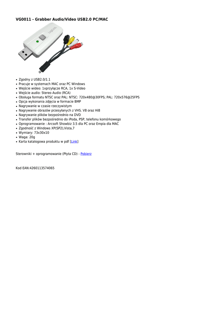 VG0011 - Grabber Audio/Video USB2.0 PC/MAC ● ● ● ● ● ● ● ● ● ● ● ● ● ● ● Zgodny z USB2.0/1.1 Pracuje w systemach MAC oraz PC Windows Wejście wideo: 1xprzyłącze RCA, 1x S-Video Wejście audio: Stereo Audio (RCA) Obsługa formatu NTSC oraz PAL: NTSC: 720x480@30FPS; PAL: 720x576@25FPS Opcja wykonania zdjęcia w formacie BMP Nagrywanie w czasie rzeczywistym Nagrywanie obrazów przesyłanych z VHS. V8 oraz Hi8 Nagrywanie plików bezpośrednio na DVD Transfer plików bezpośrednio do iPoda, PSP, telefonu komórkowego Oprogramowanie : Arcsoft Showbiz 3.5 dla PC oraz Empia dla MAC Zgodność z Windows XP(SP2),Vista,7 Wymiary: 73x30x10 Waga: 20g Karta katalogowa produktu w pdf [Link] Sterowniki + oprogramowanie (Płyta CD) - Pobierz Kod EAN:4260113574065