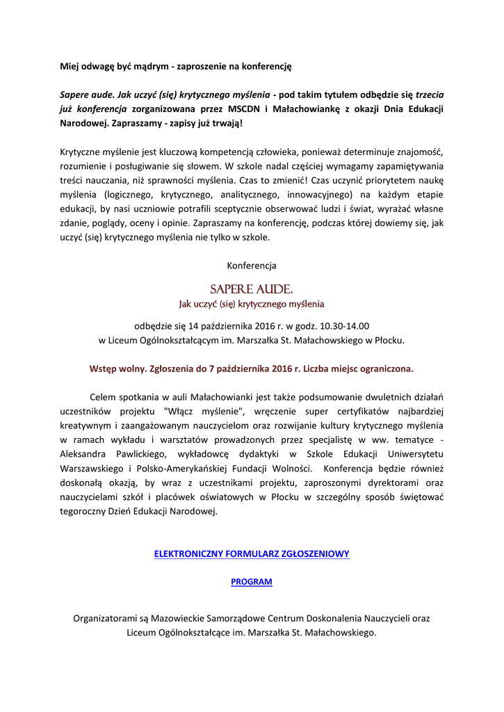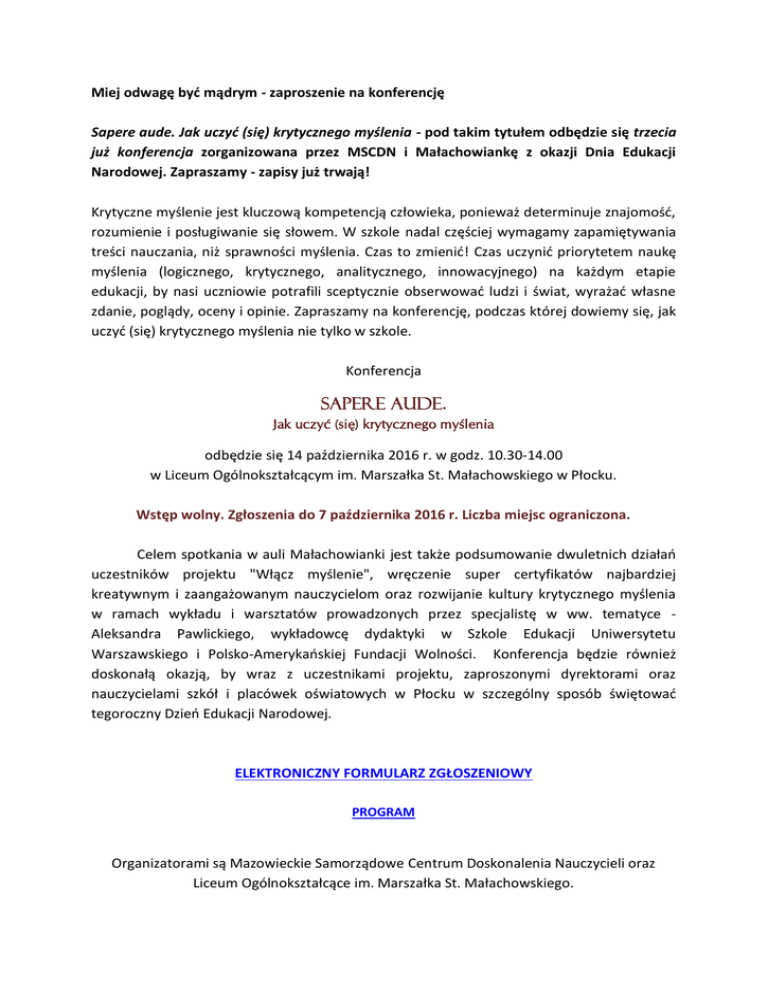 Miej odwagę być mądrym - zaproszenie na konferencję Sapere aude. Jak uczyć (się) krytycznego myślenia - pod takim tytułem odbędzie się trzecia już konferencja zorganizowana przez MSCDN i Małachowiankę z okazji Dnia Edukacji Narodowej. Zapraszamy - zapisy już trwają! Krytyczne myślenie jest kluczową kompetencją człowieka, ponieważ determinuje znajomość, rozumienie i posługiwanie się słowem. W szkole nadal częściej wymagamy zapamiętywania treści nauczania, niż sprawności myślenia. Czas to zmienić! Czas uczynić priorytetem naukę myślenia (logicznego, krytycznego, analitycznego, innowacyjnego) na każdym etapie edukacji, by nasi uczniowie potrafili sceptycznie obserwować ludzi i świat, wyrażać własne zdanie, poglądy, oceny i opinie. Zapraszamy na konferencję, podczas której dowiemy się, jak uczyć (się) krytycznego myślenia nie tylko w szkole. Konferencja Sapere aude. Jak uczyć (się) krytycznego myślenia odbędzie się 14 października 2016 r. w godz. 10.30-14.00 w Liceum Ogólnokształcącym im. Marszałka St. Małachowskiego w Płocku. Wstęp wolny. Zgłoszenia do 7 października 2016 r. Liczba miejsc ograniczona. Celem spotkania w auli Małachowianki jest także podsumowanie dwuletnich działań uczestników projektu "Włącz myślenie", wręczenie super certyfikatów najbardziej kreatywnym i zaangażowanym nauczycielom oraz rozwijanie kultury krytycznego myślenia w ramach wykładu i warsztatów prowadzonych przez specjalistę w ww. tematyce Aleksandra Pawlickiego, wykładowcę dydaktyki w Szkole Edukacji Uniwersytetu Warszawskiego i Polsko-Amerykańskiej Fundacji Wolności. Konferencja będzie również doskonałą okazją, by wraz z uczestnikami projektu, zaproszonymi dyrektorami oraz nauczycielami szkół i placówek oświatowych w Płocku w szczególny sposób świętować tegoroczny Dzień Edukacji Narodowej. ELEKTRONICZNY FORMULARZ ZGŁOSZENIOWY PROGRAM Organizatorami są Mazowieckie Samorządowe Centrum Doskonalenia Nauczycieli oraz Liceum Ogólnokształcące im. Marszałka St. Małachowskiego.