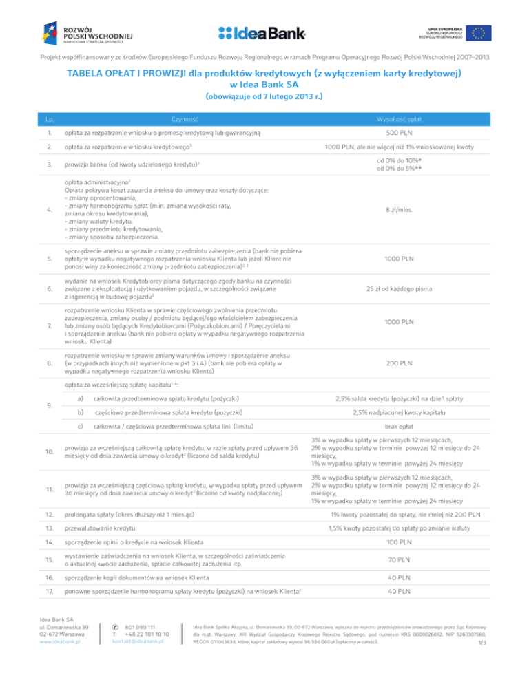k. Jedna firma.Wspieramy Jeden bank. przedsiębiorczych. Projekt współfinansowany ze środków Europejskiego Funduszu Rozwoju Regionalnego w ramach Programu Operacyjnego Rozwój Polski Wschodniej 2007–2013. TABELA OPŁAT I PROWIZJI dla produktów kredytowych (z wyłączeniem karty kredytowej) w Idea Bank SA (obowiązuje od 7 lutego 2013 r.) Lp. Czynność Wysokość opłat 1. opłata za rozpatrzenie wniosku o promesę kredytową lub gwarancyjną 500 PLN 2. opłata za rozpatrzenie wniosku kredytowego¹ 3. prowizja banku (od kwoty udzielonego kredytu)2 4. opłata administracyjna2 Opłata pokrywa koszt zawarcia aneksu do umowy oraz koszty dotyczące: - zmiany oprocentowania, - zmiany harmonogramu spłat (m.in. zmiana wysokości raty, zmiana okresu kredytowania), - zmiany waluty kredytu, - zmiany przedmiotu kredytowania, - zmiany sposobu zabezpieczenia. 8 zł/mies. 5. sporządzenie aneksu w sprawie zmiany przedmiotu zabezpieczenia (bank nie pobiera opłaty w wypadku negatywnego rozpatrzenia wniosku Klienta lub jeżeli Klient nie ponosi winy za konieczność zmiany przedmiotu zabezpieczenia)2, 3 1000 PLN 6. wydanie na wniosek Kredytobiorcy pisma dotyczącego zgody banku na czynności związane z eksploatacją i użytkowaniem pojazdu, w szczególności związane z ingerencją w budowę pojazdu2 7. rozpatrzenie wniosku Klienta w sprawie częściowego zwolnienia przedmiotu zabezpieczenia, zmiany osoby / podmiotu będącej/ego właścicielem zabezpieczenia lub zmiany osób będących Kredytobiorcami (Pożyczkobiorcami) / Poręczycielami i sporządzenie aneksu (bank nie pobiera opłaty w wypadku negatywnego rozpatrzenia wniosku Klienta) 8. rozpatrzenie wniosku w sprawie zmiany warunków umowy i sporządzenie aneksu (w przypadkach innych niż wymienione w pkt 3 i 4) (bank nie pobiera opłaty w wypadku negatywnego rozpatrzenia wniosku Klienta) 1000 PLN, ale nie więcej niż 1% wnioskowanej kwoty od 0% do 10%* od 0% do 5%** 25 zł od każdego pisma 1000 PLN 200 PLN opłata za wcześniejszą spłatę kapitału1, 4: 9. a) całkowita przedterminowa spłata kredytu (pożyczki) b) częściowa przedterminowa spłata kredytu (pożyczki) c) całkowita / częściowa przedterminowa spłata linii (limitu) 2,5% salda kredytu (pożyczki) na dzień spłaty 2,5% nadpłaconej kwoty kapitału brak opłat 3% w wypadku spłaty w pierwszych 12 miesiącach, 2% w wypadku spłaty w terminie powyżej 12 miesięcy do 24 miesięcy, 1% w wypadku spłaty w terminie powyżej 24 miesięcy 10. prowizja za wcześniejszą całkowitą spłatę kredytu, w razie spłaty przed upływem 36 miesięcy od dnia zawarcia umowy o kredyt2 (liczone od salda kredytu) 11. 3% w wypadku spłaty w pierwszych 12 miesiącach, prowizja za wcześniejszą częściową spłatę kredytu, w wypadku spłaty przed upływem 2% w wypadku spłaty w terminie powyżej 12 miesięcy do 24 2 Idea Bank Spółka Domaniewskaumowy 39, 02-672 Warszawa, wpisana do rejestruod przedsiębiorców prowadzonego przez Sąd Rejonowy miesięcy, 36 miesięcy odAkcyjna, dnia ul.zawarcia o kredyt (liczone kwoty nadpłaconej) dla m.st. Warszawy, XIII Wydział Gospodarczy Krajowego Rejestru Sądowego, pod numerem KRS 0000026052, NIP 5260307560, REGON 1% w wypadku spłaty w terminie powyżej 24 miesięcy 011063638, której kapitał zakładowy wynosi 77 346 316 zł (opłacony w całości). 12. prolongata spłaty (okres dłuższy niż 1 miesiąc) 13. przewalutowanie kredytu 14. sporządzenie opinii o kredycie na wniosek Klienta 100 PLN 15. wystawienie zaświadczenia na wniosek Klienta, w szczególności zaświadczenia o aktualnej kwocie zadłużenia, spłacie całkowitej zadłużenia itp. 70 PLN 16. sporządzenie kopii dokumentów na wniosek Klienta 40 PLN 17. ponowne sporządzenie harmonogramu spłaty kredytu (pożyczki) na wniosek Klienta1 40 PLN 801 999 111 +48 22 288 80 12 +48 22 288 82 11 [email protected] T: F: Idea Bank SA ul. Domaniewska 39 02-672 Warszawa www.ideabank.pl 801 999 111 +48 22 101 10 10 [email protected] T: 1% kwoty pozostałej do spłaty, nie mniej niż 200 PLN 1,5% kwoty pozostałej do spłaty po zmianie waluty Idea Bank Spółka Akcyjna, ul. Domaniewska 39, 02-672 Warszawa, wpisana do rejestru przedsiębiorców prowadzonego przez Sąd Rejonowy dla m.st. Warszawy, XIII Wydział Gospodarczy Krajowego Rejestru Sądowego, pod numerem KRS 0000026052, NIP 5260307560, REGON 011063638, której kapitał zakładowy wynosi 96 936 060 zł (opłacony w całości). 1/3 k. Jedna firma.Wspieramy Jeden bank. przedsiębiorczych. Projekt współfinansowany ze środków Europejskiego Funduszu Rozwoju Regionalnego w ramach Programu Operacyjnego Rozwój Polski Wschodniej 2007–2013. 18. sporządzenie historii spłaty kredytu (pożyczki) 40 PLN za bieżący rok, 80 PLN za każdy poprzedni rok, ale nie więcej niż 500 PLN 19. wydanie zaświadczenia o zwolnieniu hipoteki5 60 PLN 20. wydanie zaświadczenia o zwolnieniu zastawu 60 PLN 21. uzyskanie przez bank odpisu, na pisemną prośbę a) z księgi wieczystej Klienta lub w razie niespełnienia przez Kredytobiorcę (Pożyczkobiorcę) warunku z umowy, lub w wypadku b) z rejestru zastawów działań restrukturyzacyjnych / windykacyjnych 22. opłata za pełnomocnictwa związane z wpisem / ze zmianą wpisu hipoteki / zastawu na koszt Kredytobiorcy (Pożyczkobiorcy) (za 1 przedmiot zabezpieczenia) 23. sporządzenie uwierzytelnionych kopii lub odpisów dokumentów na wniosek Klienta2 40 PLN 24. opłata za wezwanie do spełnienia warunków wymaganych zgodnie z umową o kredyt / pożyczkę 100 PLN 25. opłata za wezwanie do dostarczenia dokumentów dotyczących sytuacji finansowo-ekonomicznej 100 PLN 26. opłata za zmianę waluty, w której spłacany jest kredyt / pożyczka 27. inspekcja nieruchomości przed wypłatą transzy kredytu 28. opłata za monitoring, inspekcja realizacji inwestycji deweloperskiej 29. opłata za monitoring zabezpieczeń kredytu / pożyczki nie więcej niż 500,00 PLN 30. opłata za monitoring Kredytobiorcy nie więcej