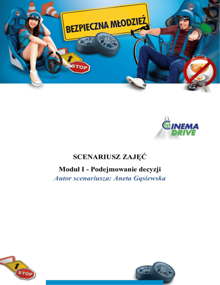SCENARIUSZ ZAJĘĆ Moduł I - Podejmowanie decyzji Autor scenariusza: Aneta Gąsiewska SCENARIUSZ ZAJĘĆ Moduł I – Podejmowanie decyzji Autor scenariusza: Aneta Gąsiewska Cel zajęć: Uczniowie poznają czynniki obiektywne i osobowościowe wpływające na proces decyzyjny. Uczestnicy: uczniowie biorący udział w projekcie. Realizatorzy: nauczyciele, pedagodzy, psycholodzy z poszczególnych szkół biorących udział w projekcie. Metody: ćwiczenia, dyskusja Czas trwania zajęć: 45 min. Materiały: kartki, długopisy Wprowadzenie teoretyczne do tematu – informacje dla prowadzącego Decyzja – to wybór jednej możliwości spośród co najmniej dwóch opcji. Samo dokonanie wyboru nie oznacza jeszcze podjęcia działania, ponieważ do tego potrzebna jest skuteczna motywacja oraz obiektywne możliwości realizacji decyzji. Podejmowanie decyzji to złożony proces poznawczy, na który wpływ mają elementy poznawcze, emocjonalne i motywacyjne a także wiedza i doświadczenie decydenta jak i czynniki kontekstualne. Szczególną role odgrywają również takie zmienne indywidualne jak: temperament czy też osobowość decydenta. Odkładamy decyzje, ponieważ wybory nas kosztują. Z tego samego względu unikamy podejmowania decyzji, starając się, w miarę możliwości zrzucić ten ciężar z nas i przerzucić odpowiedzialność za wybór na kogoś innego. Niełatwo podjąć decyzję osobistą i niezależną, niełatwo jest także ją wyrazić. Głębia osoby dąży do ukrywania się w anonimowości grupy. Podjęcie decyzji wymaga kosztów, ponieważ kosztuje nas samookreślenie siebie. Warsztaty Na początek prowadzący zadaje pytanie: Co powoduje że człowiek podejmuje odpowiedzialne, dobre decyzje w trudnej sytuacji? Zapisuje podawane propozycje na tablicy. Prowadzący powinien tak moderować przebieg dyskusji aby pojawiły się tam takie wyznaczniki jak: poczucie własnej skuteczności, pozytywna samoocena, wiedza oraz umiejętności komunikowania się. I. Ćwiczenie Prowadzący dzieli uczestników na dwie grupy. Grupa pierwsza otrzymuje polecenie: Zapisz wszystkie możliwe pomysły, zachowania, słowa których użyjesz, żeby powstrzymać swojego przyjaciela od prowadzenia samochodu w sytuacji, kiedy chory: ma wysoką temperaturę powyżej 38°C, zawroty głowy, nie może utrzymać równowagi, ciężko oddycha i ma wysoki puls. Grupa druga otrzymuje polecenie: Zapisz wszystkie możliwe pomysły, zachowania, słowa których użyjesz, żeby powstrzymać swojego przyjaciela od prowadzenia samochodu w sytuacji, kiedy jest pod wpływem alkoholu. Prowadzący prosi lidera każdej z grup do prezentacji prac, grupa pomaga liderowi. Następnie prowadzący podsumowuje ćwiczenie. Zadaje pytanie: Które z zadań jest łatwiejsze do wykonania, co sprzyjało, co utrudniało wykonanie zadania. Co takiego powoduje, że zajmujemy się osobą chorą i o jej bezpieczeństwo się troszczymy? Co utrudnia takie zachowanie wobec osoby pod wpływem alkoholu? Jakie czynniki sprzyjają podjęciu decyzji o interwencji wobec osoby pod wpływem alkoholu? II. Ćwiczenie Prowadzący prosi, aby każdy z uczestników zapisywał odpowiedzi zgodnie z poleceniami: pomiędzy poleceniami należy dać uczestnikom czas na odpowiedź 1. Przypomnij sobie sytuację albo zdarzenie z przeszłości, które miało dla Ciebie niekorzystny przebieg (dla ułatwienia nadaj jej tytuł). 2. Zanotuj, co myślałeś o sobie w trakcie tego zdarzenia. 3. Odpowiedz sobie na pytania: a. czy to było pomocne dla Ciebie w tej sytuacji? b. czy wpłynęło pozytywnie na Twoje uczucia, poziom stresu, samoocenę, zachowanie, stosunki z innymi? 4. Jeśli Ci to nie pomagało, to czemu o sobie myślałeś w ten sposób? 5. Spróbuj sformułować alternatywny komunikat - przeciwny do tych które dałeś sobie, który byłby pomocny w takiej sytuacji. Podsumowanie: Sposób myślenia o sobie, samoocena, doświadczanie w różnych, trudnych sytuacjach, przyglądanie się własnym strategiom, sprzyja kształtowaniu umiejętności podejmowania decyzji. III. Ćwiczenie Prowadzący prosi aby każdy z uczestników posłuchał polecenia i zapisał na kartce: 1. Zrób listę rzeczy, których pragniesz. Postaraj się zapisać co najmniej 15 stwierdzeń. Nie zastanawiaj się, nie cenzuruj tego co piszesz. Jeśli przychodzą Ci do głowy myśli negatywne, np.: „nie mogę sobie na to pozwolić” lub „to niemożliwe”, to odnotuj to ale kontynuuj swą listę. 2. Przeczytaj listę i zastanów się, jaki jeden mały krok musiałbyś zrobić dziś, żeby przybliżyć się do realizacji planów i pragnień – zapisz obok każdego z pragnień. 3. Następnie na skali od 1 do 5 określ jak bardzo realny jest ten krok. Prowadzący zapisuje skalę na tablicy. 1. 20% realne 2. 40% realne 3. 60% realne 4. 80% realne 5. 100% realne Następnie prosi uczniów, którzy są chętni, aby podzielili się wybranymi pragnieniami. Prowadzący omawia z nimi „małe kroki”, np.: Pragnienie: „Pragnę jeździć konno” Krokami będzie: znaleźć blisko stadninę (internet) – realne na 5, sprawdzić cenę – realne na 5, pojechać i zobaczyć – realne na 3. (Prowadzący może dopytywać np.: Jak to zrobisz, kiedy to możliwe, do kogo zadzwonisz, pojedziesz sam czy z kimś? Jak z kimś, to po co? Jeżeli pragnienie będzie sformułowane zbyt ogólnie np. „Pragnę być szczęśliwa”, prowadzący powinien dopytać „A co to jest dla Ciebie bycie szczęśliwą. Po czym poznasz, że jesteś szczęśliwa? Podsumowanie Ogólne, niesprecyzowane cele, mają niewielką szansę na realizację. Trudno mieć poczucie własnej skuteczności w ich realizacji. Nie doceniamy znaczenia „małych kroków” a to one mogą być źródłem sukcesów i motorem kolejnych działań. Listę pragnień uczniowie zabierają ze sobą planując zrobienie jednego kroku, który przybliży ich do realizacji jednego z zapisanych pragnień. IV. Omówienie i podsumowanie warsztatu Prowadzący zadaj