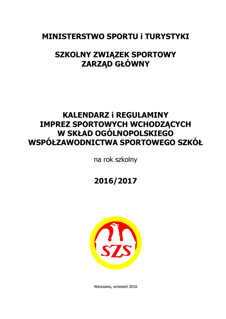 MINISTERSTWO SPORTU i TURYSTYKI SZKOLNY ZWIĄZEK SPORTOWY ZARZĄD GŁÓWNY KALENDARZ i REGULAMINY IMPREZ SPORTOWYCH WCHODZĄCYCH W SKŁAD OGÓLNOPOLSKIEGO WSPÓŁZAWODNICTWA SPORTOWEGO SZKÓŁ na rok szkolny 2016/2017 Warszawa, wrzesień 2016 SPIS TREŚCI: 1 Ogólnopolskie Współzawodnictwo Sportowe Szkół – dyscypliny podstawowe oraz Ramowy terminarz szkolnych imprez sportowych na rok szkolny 2016/2017 strona 3 2 Zasady współzawodnictwa sportowego w roku szkolnym 2016/2017 – regulamin ogólny 3 ROZPORZĄDZENIE MINISTRA ZDROWIA z dnia 24 września 2013 r. - w sprawie świadczeń gwarantowanych z zakresu podstawowej opieki zdrowotnej (Dz. U. 2013 poz. 1248 z dn. 28 października 2013 r.) 10 WYJAŚNIENIE ZARZĄDU GŁÓWNEGO SZKOLNEGO ZWIĄZKU SPORTOWEGO w sprawie wymaganych badań lekarskich dopuszczających młodzież szkolną do zawodów 12 Regulaminy dyscyplin podstawowych: - Igrzyska Młodzieży Szkolnej - Gimnazjada - Licealiada 15 26 35 4 5 Wykaz Wojewódzkich SZS 6 - na stronie internetowej www.szs.pl Tabele punktowe - na stronie internetowej www.szs.pl www.szs.pl 2 dofinansowano ze środków Ministerstwa Sportu i Turystyki srs.szs.pl W skład Ogólnopolskiego Współzawodnictwa Sportowego Szkół wchodzą następujące dyscypliny i zawody sportowe: Igrzyska Młodzieży Szkolnej (13 lat i młodsi) Szkoły przystępujące do współzawodnictwa muszą obowiązkowo zarejestrować się przez system rejestracji szkół srs.szs.pl nie później niż do 15 września 2016 r. 1 2 3 4 5 6 7 8 9 10 11 12 13 Ogólnopolskie dyscypliny podstawowe Mini koszykówka Mini siatkówka Piłka ręczna Mini piłka nożna Unihokej Czwórbój Lekkoatletyczny Sztafetowe biegi przełajowe Tenis stołowy drużynowy Badminton drużynowy Szachy drużynowe Sztafety pływackie Narciarstwo biegowe Drużynowe biegi przełajowe Oprócz wymienionych wyżej dyscyplin i zawodów Wojewódzkie Szkolne Związki Sportowe organizują także zawody w innych dyscyplinach. Ich wykaz i zasięg umieszczony jest w dalszej części Kalendarza. G I M N A Z J AD A ( 1 4 – 1 6 L A T ) Szkoły przystępujące do współzawodnictwa muszą obowiązkowo zarejestrować się przez system rejestracji szkół srs.szs.pl nie później niż do 15 września 2016 r. 1 2 3 4 5 6 7 8 9 10 11 12 13 14 Ogólnopolskie dyscypliny podstawowe Koszykówka Piłka siatkowa Piłka ręczna Piłka nożna Unihokej Szkolna drużynowa Liga Lekkoatletyczna Sztafetowe biegi przełajowe Tenis stołowy drużynowy Badminton drużynowy Szachy drużynowe Sztafety pływackie Narciarstwo biegowe Piłka siatkowa plażowa Drużynowe biegi przełajowe Oprócz wymienionych wyżej dyscyplin i zawodów Wojewódzkie Szkolne Związki Sportowe organizują także zawody w innych dyscyplinach. Ich wykaz i zasięg umieszczony jest w dalszej części Kalendarza. www.szs.pl 3 dofinansowano ze środków Ministerstwa Sportu i Turystyki srs.szs.pl L I C E A L I A D A (uczniowie dziennych szkół ponadgimnazjalnych) Szkoły przystępujące do współzawodnictwa muszą obowiązkowo zarejestrować się przez system rejestracji szkół srs.szs.pl nie później niż do 15 września 2016 r. . Ogólnopolskie dyscypliny podstawowe Koszykówka Piłka siatkowa Piłka ręczna Piłka nożna Unihokej Szkolna Liga Lekkoatletyczna w dwóch rzutach (jesiennym i wiosennym) Sztafetowe biegi przełajowe Tenis stołowy drużynowy Badminton drużynowy Szachy drużynowe Sztafety pływackie Drużynowe biegi przełajowe Piłka siatkowa plażowa 1 2 3 4 5 6 7 8 9 10 11 12 13 Oprócz wymienionych wyżej dyscyplin i zawodów Wojewódzkie Szkolne Związki Sportowe organizują także zawody w innych dyscyplinach. Ich wykaz i zasięg umieszczony jest w dalszej części Kalendarza. 1 2 3 4 5 6 7 8 9 10 11 12 13 Minikoszykówka Minisiatkówka Piłka ręczna Minipiłka nożna Unihokej 4-bój LA Sztafetowe biegi przełajowe Tenis stołowy drużynowy Badminton drużynowy Szachy drużynowe Sztafety pływackie Narciarstwo biegowe Drużynowe biegi przełajowe www.szs.pl Półfinał Rejon Gmina Dyscyplina Powiat Lp. Finał wojewódzki RAMOWY TERMINARZ SZKOLNYCH IMPREZ SPORTOWYCH NA ROK SZKOLNY 2016/2017 IMS (13 lat i młodsi) od IX.2016 do VI.2017 od IX.2016 do VI.2017 od IX.2016 do VI.2017 od IX.2016 do VI.2017 od IX.2016 do XII.2016 od IX.2016 do VI.2017 od IX.2016 do X.2016 od IX.2016 do VI.2017 od IX.2016 do XII.2016 od IX.2016 do XII.2016 od IX.2016 do V.2017 od XII.2016 do III.2017 od III.2017 do V.2017 4 Finał Ogólnopolski VI.2017 VI.2017 VI.2017 VI.2017 V.2017 VI.2017 X.2016 VI.2017 VI.2017 V.2017 do szczebla finału wojewódzkiego III.2017 do szczebla finału wojewódzkiego dofinansowano ze środków Ministerstwa Sportu i Turystyki srs.szs.pl 1 2 3 4 5 6 7 8 9 10 11 12 13 14 G I M N A Z J AD A (16 lat i młodsi) Koszykówka od IX.2016 do VI.2017 VI.2017 Piłka siatkowa od IX.2016 do VI.2017 VI.2017 Piłka ręczna od IX.2016 do VI.2017 VI.2017 Piłka nożna 10 osobowa od IX.2016 do VI.2017 VI.2017 Unihokej /duże bramki/ od IX.2016 do XII.2016 V.2017 Szkolna Liga LA od IX.2016 do VI.2017 VI.2017 Sztafetowe biegi przełajowe od IX.2016 do X.2016 X.2016 Tenis stołowy drużynowy od IX.2016 do VI.2017 VI.2017 Badminton drużynowy od IX.2016 do XII.2016 VI.2017 Szachy drużynowe od IX.2016 do XII.2016 V.2017 do szczebla finału wojewódzkiego Sztafety pływackie od IX.2016 do V.2017 Narciarstwo biegowe od XII.2016 do III.2017 III.2017 do szczebla finału wojewódzkiego Drużynowe biegi przełajowe od III.2017 do V.2017 Piłka siatkowa plażowa od IV.2017 do VI.2017 VI.2017 L I C E A L I A D A (uczniowie dziennych szkół ponadgimnazjalnych) 1 2 3 4 5 6 7 8 9 10 11 12 13 Koszykówka Piłka siatkowa Piłka ręczna Piłka nożna Unihokej Szkolna Liga LA I i II rzut Sztafetowe biegi przełajowe Tenis stołowy drużynowy Badminton drużynowy Szachy drużynowe Sztafety pływackie Drużynowe biegi przełajowe Piłka siatkowa plażowa www.szs.pl od IX.2016 do VI.2017 od IX.2016 do VI.2017 od IX.2016 do VI.2017 od IX.20