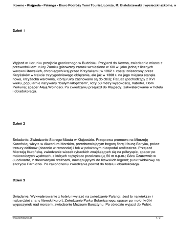 Kowno - Kłajpeda - Pałanga - Biuro Podróży Tomi Tourist, Łomża, M. Białobrzewski | wycieczki szkolne, w Dzień 1 Wyjazd w kierunku przejścia granicznego w Budzisku. Przyjazd do Kowna, zwiedzanie miasta z przewodnikiem: ruiny Zamku (pierwotny zamek wzniesiono w XIII w. jako jedną z licznych warowni litewskich, chroniących kraj przed Krzyżakami; w 1362 r. został zniszczony przez Krzyżaków w trakcie trzytygodniowego oblężenia, ale już w 1368 r. na jego miejscu stanęła nowa, krzyżacka warownia, której ruiny zachowane są do dziś); Ratusz (pochodzący z XVI wieku, popularnie nazywany "białym łabędziem", liczy 53 metry wysokości), Katedra, Dom Perkuna; spacer Aleją Wolności. Po zwiedzaniu przejazd do Kłajpedy, zakwaterowanie w hotelu i obiadokolacja. Dzień 2 Śniadanie. Zwiedzanie Starego Miasta w Kłajpedzie. Przeprawa promowa na Mierzeję Kurońską, wizyta w Akwarium Morskim, przedstawiającym bogatą florę i faunę Bałtyku, pokaz tresury delfinów (obecnie w remoncie) i fok w położonym nieopodal amfiteatrze. Przejazd Mierzeją Kurońską, zwiedzanie wiosek rybackich znajdujących się na półwyspie, spacer po malowniczych wydmach, z których najwyższe przekraczają 50 m n.p.m.; Góra Czarownic w Juodkrante, z drewnianymi rzeźbami, nawiązującymi do litewskich legend; punkt widokowy na szczycie Parnidzio. Po zakończeniu zwiedzania powrót do hotelu i obiadokolacja. Dzień 3 Śniadanie. Wykwaterowanie z hotelu i wyjazd na zwiedzanie Pałangi. Jest to największy i najbardziej znany litewski kurort. Zwiedzanie Parku Botanicznego, spacer po molo, krótki wypoczynek nad morzem, zwiedzenie Muzeum Bursztynu. Po obiedzie wyjazd do Polski. www.tomitourist.pl 1/2 Kowno - Kłajpeda - Pałanga - Biuro Podróży Tomi Tourist, Łomża, M. Białobrzewski | wycieczki szkolne, w CENA: od 545 zł* obejmuje: 1. 2. 3. 4. 5. 6. 7. 8. 9. Transport 2 noclegi (w hotelu ***) 2 śniadania 2 obiadokolacje, 1 obiad Usługę przewodnika wg programu Opieke pilota Ubezpieczenie NNW, KL Podatek VAT UWAGA: Bilety do zwiedzanych obiektów opłacają uczestnicy – ok. 25 litów. * Ostateczna cena uzależniona jest od standardu hotelu oraz autokaru, a także ilości osób. www.tomitourist.pl 2/2