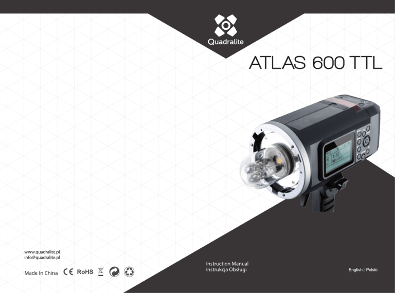 Wprowadzenie Bezpieczeństwo Dziękujemy za zakup lampy Quadralite Quadralite Atlas 600 TTL to lampa o mocy 600Ws, która jest kompatybilna z systemem automatycznego pomiaru światła błyskowego Canon E-TTL II/Nikon i-TTL/Sony ADI* i w pełni współpracuje z radiowym systemem sterowania Quadralite Navigator X. Dzięki zastosowaniu automatyki TTL pozwala na szybką i wygodną pracę ze światłem błyskowym nawet w gwałtownie zmieniających się warunkach oświetleniowych. Quadralite Atlas 600 TTL to kompletne narzędzie, które charakteryzuje się wydajnym akumulatorem, bezprzewodowym sterowaniem zdalnym oraz możliwością zastosowania szerokiej kamy modyfikatorów światła z mocowaniem typu Bowens. Nie demontuj, ani nie modyfikuj urządzenia! Lampa składa się z komponentów pracujących pod wysokim napięciem. Nawet po odłączeniu od zasilania i wyłączeniu urządzenia w jego komponentach wewnętrznych może znajdować się prąd o wysokim napięciu! Demontaż obudowy urządzenia może być przeprowadzony tylko przez autoryzowany serwis Quadralite. Silne wstrząsy mogą doprowadzić do uszkodzenia palnika i/lub wewnętrznych elementów lampy. Jeżeli obudowa zostanie naruszona np. w wyniku upadku, zaleca się odesłanie urządzenia do autoryzowanego punktu serwisowego w celu kontroli i ewentualnej naprawy. Unikaj wilgoci! Nie obsługuj urządzenia mokrymi rękami, nie zanurzaj go w wodzie, nie wystawiaj na działanie czynników atmosferycznych (np. deszcz, śnieg). Nie wystawiaj urządzenia na działanie wysokich temperatur! Lampa jest przystosowana do pracy w temperaturze od 10 do 40 stopni Celsjusza. Podstawowe cechy lampy: kompatybilna z aparatami marki Canon/Nikon/Sony* wykorzystującymi automatyczny pomiar światła błyskowego E-TTL II/i-TTL/ADI* (synchronizacja z krótkimi czasami otwarcia migawki, korekta ekspozycji światła błyskowego, bracketing światła błyskowego, blokada ekspozycji, itd.), maksymalna moc błysku wynosząca aż 600 Ws, szeroka regulacja mocy błysku w przedziale 9 stopni przysłony w 25 krokach (od 1/1 do 1/256) co 1/3 stopnia EV, zasilana z akumulatora o pojemności 8700mAh, który pozwala na wykonanie do 500 błysków z pełną mocą lampy, niezwykle krótkie czasy trwania błysku sięgające nawet 1/10000 s (t0.1, przy 1/256 mocy), stabilna temperatura barwowa błysków (5600K±200K), oświetlenie modelujące LED o mocy 10W, w pełni współpracuje z systemem radiowego sterowania Quadralite Navigator, wyposażona w mocowanie akcesoriów typu Bowens. * wymagane jest stosowanie odpowiedniego sterownika Quadralite Navigator X aby zapewnić pełną współpracę z konkretnym modelem aparatu. Urządzenie nie może być użytkowane gdy zachodzi niebezpieczeństwo kontaktu z łatwopalnymi cieczami lub ich oparami, a także w warunkach wysokiego zapylenia. Lampa przystosowana jest do pracy i przechowywania w suchych i dobrze wentylowanych pomieszczeniach zamkniętych. Nie należy dotykać osłony palnika błyskowego podczas wyzwalania błysku. Wydzielane wówczas ciepło może spowodować oparzenia. Nagrzewanie się palnika podczas pracy jest zjawiskiem normalnym. Przechowuj urządzenie w miejscu niedostępnym dla dzieci! Nie należy wyzwalać błysku w bezpośredniej bliskości oczu gdyż może to doprowadzić do trwałego lub tymczasowego uszkodzenia narządu wzroku! Nie błyskaj lampą bezpośrednio w oczy z małej odległości. W trakcie fotografowania dzieci minimalny dystans pomiędzy lampą a oczami to 1 metr. Zaleca się używanie dyfuzorów czy innych nakładek rozpraszających błysk światła w celu ochrony wzroku. Zignorowanie powyższych zasad bezpieczeństwa może skutkować poważnym porażeniem elektrycznym, zwarciem, pożarem lub zaburzeniem pracy urządzenia. Producent nie ponosi odpowiedzialności za wszelkie szkody wynikłe z użytkowania sprzętu w sposób niezgodny z zapisami instrukcji obsługi. Prosimy o dokładne przeczytanie niniejszej instrukcji obsługi przed rozpoczęciem korzystania z urządzenia. Zawiera ona istotne informacje dotyczące bezpieczeństwa pracy, użytkowania i konserwacji sprzętu. Stosowanie zaleceń zawartych w instrukcji pozwoli efektywnie wykorzystać jego możliwości. Prosimy zachować niniejszą instrukcję i przechowywać ją w miejscu łatwo dostępnym dla wszystkich użytkowników urządzenia. - 1 - - 2 - Spis Treści 1 Wprowadzenie 2 Bezpieczeństwo 4 Spis treści 5 Elementy urządzenia 5 Lampa błyskowa 6 Ekran LCD 7 Akcesoria w zestawie 8 Akcesoria dostępne oddzielnie 8 Instalowanie modyfikatorów światła 8 Instalowanie palnika błyskowego 8 Regulacja kąta nachylenia lampy 9 Akumulator 10 Włączenie lampy i tryb uśpienia 10 Zdalne sterowanie 11 Tryb automatyczny TTL 11 FEC: korekta ekspozycji światła błyskowego 11 High-Speed Sync 12 Tryb manualny 14 Tryb stroboskopowy (Multi) 15 Radiowe sterowanie bezprzewodowe 15 Ustawienia zdalnego wyzwalania 15 Ustawienia kanałów komunikacji radiowej 16 Ustawienia grup lamp w komunikacji radiowej 16 Fotografowanie z lampą sterowaną radiowo 18 Sterowanie bezprzewodowe – wyzwalanie lampy za pomocą błysku 18 Ustawienia zdalnego wyzwalania za pomocą błysku 19 Ustawienia kanałów komunikacji bezprzewodowej 19 Ustawienia grup lamp w komunikacji bezprzewodowej 20 C.Fn: Funkcje Custom 21 Oświetlenie pilotujące 21 Pozostałe ustawienia i funkcje 21 Sterowanie bezprzewodowe w systemie Quadralite Navigator 21 Przewodowa synchronizacja błysku 22 Funkcje ochronne Zanim zaczniesz: 23 Parametry techniczne Ta instrukcja została przygotowana w założeniu, że w trakcie użytkowania zarówno aparat jak i lampa błyskowa są włączone. 24 Rozwiązywanie problemów Odnośniki do stron są oznaczone symbolem: „str. ##” 24 Aktualizacja oprogramowania W instrukcji wykorzystano następujące ikony: 24 Użytkowanie i konserwacja dla ostrzeżeń zapobiegających problemom z lampą dla informacji uzupełniających - 3- - 4 - Elementy urządzenia Element
