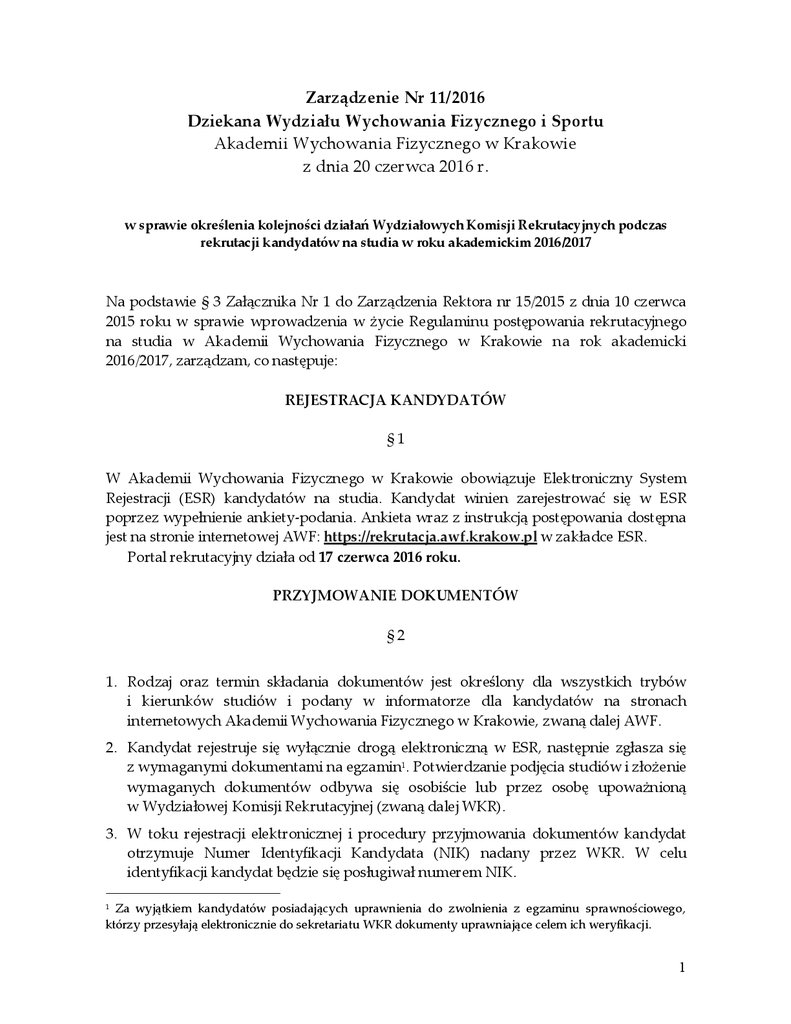 Zarządzenie Nr 11/2016 Dziekana Wydziału Wychowania Fizycznego i Sportu Akademii Wychowania Fizycznego w Krakowie z dnia 20 czerwca 2016 r. w sprawie określenia kolejności działań Wydziałowych Komisji Rekrutacyjnych podczas rekrutacji kandydatów na studia w roku akademickim 2016/2017 Na podstawie § 3 Załącznika Nr 1 do Zarządzenia Rektora nr 15/2015 z dnia 10 czerwca 2015 roku w sprawie wprowadzenia w życie Regulaminu postępowania rekrutacyjnego na studia w Akademii Wychowania Fizycznego w Krakowie na rok akademicki 2016/2017, zarządzam, co następuje: REJESTRACJA KANDYDATÓW §1 W Akademii Wychowania Fizycznego w Krakowie obowiązuje Elektroniczny System Rejestracji (ESR) kandydatów na studia. Kandydat winien zarejestrować się w ESR poprzez wypełnienie ankiety-podania. Ankieta wraz z instrukcją postępowania dostępna jest na stronie internetowej AWF: https://rekrutacja.awf.krakow.pl w zakładce ESR. Portal rekrutacyjny działa od 17 czerwca 2016 roku. PRZYJMOWANIE DOKUMENTÓW §2 1. Rodzaj oraz termin składania dokumentów jest określony dla wszystkich trybów i kierunków studiów i podany w informatorze dla kandydatów na stronach internetowych Akademii Wychowania Fizycznego w Krakowie, zwaną dalej AWF. 2. Kandydat rejestruje się wyłącznie drogą elektroniczną w ESR, następnie zgłasza się z wymaganymi dokumentami na egzamin1. Potwierdzanie podjęcia studiów i złożenie wymaganych dokumentów odbywa się osobiście lub przez osobę upoważnioną w Wydziałowej Komisji Rekrutacyjnej (zwaną dalej WKR). 3. W toku rejestracji elektronicznej i procedury przyjmowania dokumentów kandydat otrzymuje Numer Identyfikacji Kandydata (NIK) nadany przez WKR. W celu identyfikacji kandydat będzie się posługiwał numerem NIK. Za wyjątkiem kandydatów posiadających uprawnienia do zwolnienia z egzaminu sprawnościowego, którzy przesyłają elektronicznie do sekretariatu WKR dokumenty uprawniające celem ich weryfikacji. 1 1 4. Kandydat ubiegający się o przyjęcie na studia wnosi opłatę za postępowanie rekrutacyjne. Wysokość opłaty zostanie podana na stronie internetowej AWF, po ukazaniu się Rozporządzenia Ministra Nauki i Szkolnictwa Wyższego w sprawie maksymalnej wysokości opłat za postępowanie związane z przyjęciem na studia. Wysokość opłaty rekrutacyjnej na poszczególne kierunki i tryby postępowania zostanie ustalona przez Rektora w drodze Zarządzenia. Opłata jest bezzwrotna. W uzasadnionych przypadkach Rektor może zwolnić kandydata z obowiązku uiszczenia opłaty. Opłata rekrutacyjna nie podlega również zwrotowi, jeśli złożone dokumenty nie spełniają wymagań określonych w warunkach rekrutacji (dotyczy to również niekompletnych dokumentów). Wpłaty należy dokonać zgodnie z instrukcją zawartą w elektronicznym systemie rejestracji kandydatów. 5. Kandydaci winni wykonać badania lekarskie, potwierdzające zdolność do podjęcia studiów na wybranym kierunku (Rozporządzenie Ministra Zdrowia z dnia 26 sierpnia 2014 roku w sprawie badań lekarskich kandydatów do szkół ponadpodstawowych i ponadgimnazjalnych lub wyższych, uczniów tych szkół, studentów i uczestników studiów doktoranckich. Dz.U z 28 sierpnia 2014, poz. 1144). 6. Kandydaci na studia I stopnia muszą dostarczyć zaświadczenie lekarskie na egzamin sprawnościowy. Jeżeli dokumenty będą niekompletne lub niewłaściwe, kandydat nie zostanie dopuszczony do egzaminu wstępnego do czasu ich uzupełnienia. 7. Skierowanie na badania lekarskie kandydat może wydrukować ze strony internetowej uczelni lub zostanie ono imiennie wygenerowane dla kandydata po zarejestrowaniu się w ESR i dokonaniu opłaty rekrutacyjnej. Skierowanie należy opatrzyć pieczęcią AWF w sekretariacie WKR, co umożliwia kandydatowi wykonanie badania bezpłatnie w wyznaczonych placówkach. 8. Kandydaci na studia II stopnia muszą dostarczyć zaświadczenia lekarskie wraz z kompletem pozostałych dokumentów w terminie podanym przez WKR w trakcie potwierdzania podjęcia studiów. 9. Kandydat otrzyma drogą elektroniczną (za pośrednictwem ESR) kompletną informację dotyczącą terminów i miejsca organizacji egzaminów kwalifikacyjnych, a także sposobu ogłaszania wyników. 2 PRZEBIEG EGZAMINÓW §3 Niestawienie się kandydata na którąkolwiek część postępowania kwalifikacyjnego uniemożliwia jego dalszy udział w tym postępowaniu, chyba, że WKR biorąc pod uwagę szczególne okoliczności, określi inny tryb postępowania, o czym niezwłocznie powiadamia przewodniczącego UKR. KIERUNEK WYCHOWANIE FIZYCZNE, SPORT, KULTURA FIZYCZNA OSÓB STARSZYCH – STUDIA I STOPNIA PRZEBIEG EGZAMINU SPRAWNOŚCIOWEGO Procedura postępowania egzaminacyjnego z pływania (pływalnia Al. Jana Pawła II 78, Kraków) 1. Określona przez Komisję Rekrutacyjną grupa egzaminacyjna (K-1…, M-1..) (wszyscy jednocześnie) wchodzi na pływalnię o godzinie, na którą jest wyznaczony termin egzaminu z pływania. 2. Egzaminator sprawdza obecność według listy otrzymanej z Komisji Rekrutacyjnej i przedstawia kandydatom kryteria oraz regulamin egzaminu (zgodnie z wytycznymi zawartymi w informatorze dla kandydatów). 3. Przed przepłynięciem egzaminu (dystansu 50 m) nie ma wcześniejszej indywidualnej rozgrzewki w wodzie (ze względu na brak czasu i bezpieczeństwo). 4. Każdy kandydat pokonuje wymagany dystans pojedynczo na wyznaczonym torze. 5. Sposób pływania na dystansie dowolny – można pływać jednym stylem cały dystans lub dwoma, trzema itd. i zmieniać sposób płynięcia w trakcie pokonywania dystansu. 6. Na nawrocie po przepłynięciu 25 m należy obowiązkowo dotknąć ściany nawrotowej pływalni dowolną częścią ciała. Przed ścianą nawrotową (w trakcie zatrzymania) można stanąć na dnie pływalni, lecz nie wolno chodzić po dnie –w przeciwnym razie kandydat zostanie zdyskwalifikowany, co jest równoznaczne z nie zaliczeniem egzaminu. 7. W czasie płynięcia na dystansie nie