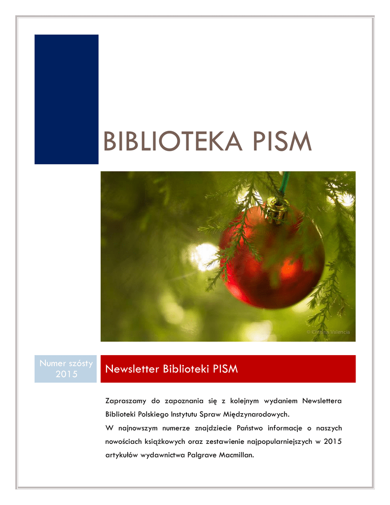 BIBLIOTEKA PISM Numer szósty 2015 Newsletter Biblioteki PISM Zapraszamy do zapoznania się z kolejnym wydaniem Newslettera Biblioteki Polskiego Instytutu Spraw Międzynarodowych. W najnowszym numerze znajdziecie Państwo informacje o naszych nowościach książkowych oraz zestawienie najpopularniejszych w 2015 artykułów wydawnictwa Palgrave Macmillan. Palgrave Macmillan Journals Najpopularniejsze artykuły w 2015 r. Palgrave Macmillan przygotowało zestawienie najpopularniejszych artykułów 2015 roku opublikowanych w czasopismach naukowych wydawnictwa. Artykuły będą dostępne w open access dla czytelników do 31 stycznia 2016 r. Publikacje zostały pogrupowane według czterech dziedzin (pod linkiem) : Business & Management Economics & Finance Politics, International Relations & Development Social & Cultural Studies Strona 1 Nowości książkowe Nowości książkowe NEWSLETTER BIBLIOTEKI PISM Bezpieczeństwo międzynarodowe Ewolucja ról międzynarodowych w Arktyce / Michał Łuszczuk. -- Lublin : Wydawnictwo Uniwersytetu Marii Curie-Skłodowskiej, 2015. The war that must never be fought : dilemmas of nuclear deterrence / edited by George P. Shultz and James E. Goodby. -- Stanford : Hoover Institution Press, 2015. Bliski Wschód The Sunni tragedy in the Middle East : Northern Lebanon from al-Qaeda to ISIS / Bernard Rougier. -- Princeton ; Oxford : Princeton University Press, cop. 2015. Chiny Chińskie marzenie o konstytucjonalizmie / Mateusz Stępień. -- Kraków : Wydawnictwo Uniwersytetu Jagiellońskiego, cop. 2015. Energetyka Capacity mechanisms in the EU energy market : law, policy, and economics / edited by Leigh Hancher, Adrien de Hauteclocque and Małgorzata Sadowska. -- Oxford : Oxford University Press, cop. 2015. Europa Zachodnia Mit Skandynawii, czyli Porażka polityki trzeciej drogi / Nima Sanandaji ; tł. Paweł Nowakowski. - Chicago ; Warszawa : Fijorr Publishing, 2016. Gospodarka Transatlantyckie partnerstwo w dziedzinie handlu i inwestycji : nowy etap instytucjonalizacji współpracy UE-USA / redakcja naukowa: Maria Dunin-Wąsowicz, Aleksandra Jarczewska. -- Warszawa : Wydawnictwo Naukowe Scholar, 2015. Single markets : economic integration in Europe and the United States / Michelle P. Egan. -Oxford ; New York : Oxford University Press, 2015. Strona 2 Historia dyplomacji Depesze szyfrowe poselstwa Rzeczypospolitej Polskiej w Budapeszcie 1 X 1939 - 1 I 1941 / wstęp i oprac. Paweł Pietrzyk ; Naczelna Dyrekcja Archiwów Państwowych. -- Warszawa : Naczelna Dyrekcja Archiwów Państwowych. Departament Organizacji i Udostępniania. Wydział Popularyzacji i Wydawnictw, 2014. Indie Reformy ekonomiczne i polityczne a rozwój gospodarczy Indii (1991-2012) / Grzegorz Bywalec. -- Łódź : Wydawnictwo Uniwersytetu Łódzkiego, 2015. Polska Przegląd bezpieczeństwa narodowego w planowaniu strategicznym Polski / Sławomir Kamiński. -- Warszawa : Difin, 2015. Relacje polityczne między Polską a Ukrainą : doświadczenia i perspektywy / redakcja Elżbieta Szczot, Jacek Szczot ; Katolicki Uniwersytet Lubelski Jana Pawła II. Wydział Prawa, Prawa Kanonicznego i Administracji. -- Lublin : Wydawnictwo KUL, 2015. Zbigniew Brzeziński wobec spraw Polski w latach 1977-1999 / Remigiusz Wodziński. -- Toruń : Wydawnictwo Adam Marszałek, 2015. Rosja Winter is coming : why Vladimir Putin and the enemies of the free world must be stopped / Garry Kasparov ; with Mig Greengard. -- London : Atlantic Books, 2015. Stany Zjednoczone Nieświęta wojna : grzech pierworodny Ameryki / F. William Engdahl ; [przekład Mateusz Kotowski]. -- Bielany Wrocławskie : Wydawnictwo "Wektory", cop. 2015. Stosunki międzynarodowe Globalizacja i regionalizacja we współczesnym świecie : wyzwania integracji i rozwoju / redakcja naukowa Edward Molendowski, Arkadiusz Mroczek. -- Warszawa : Szkoła Główna Handlowa - Oficyna Wydawnicza, 2015. Mechanizmy wpływu w środowisku międzynarodowym : zastosowanie CoG (Centre of Gravity) do analizy procesów decyzyjnych w sprawach globalnych / Małgorzata Zachara. -- Kraków : Wydawnictwo Uniwersytetu Jagiellońskiego, cop. 2015. Strona 3 Nowości książkowe Terroryzm The dynamics of a terrorist targeting process : Anders B. Breivik and the 22 July attacks in Norway / Cato Hemmingby and Tore Bjørgo. -- Basingstoke ; New York : Palgrave Macmillan, 2016. Tajny agent : moje życie wśród narkoterrorystów / Edward Follis, Douglas Century ; tłumaczenie: Agnieszka Szurek. -- Kraków : Wydawnictwo Uniwersytetu Jagiellońskiego, 2015. ISIS Państwo Islamskie : [brutalne początki armii terrorystów] / Benjamin Hall ; przełożył Paweł Wolak. -- Warszawa : Warszawskie Wydawnictwo Literackie Muza SA, 2015. Terrorism in cyberspace : the next generation / Gabriel Weimann. -- Washington : New York : Woodrow Wilson Center Press ; cop. 2015.Columbia University Press, Ukraina Relacje polityczne między Polską a Ukrainą : doświadczenia i perspektywy / redakcja Elżbieta Szczot, Jacek Szczot ; Katolicki Uniwersytet Lubelski Jana Pawła II. Wydział Prawa, Prawa Kanonicznego i Administracji. -- Lublin : Wydawnictwo KUL, 2015. Unia Europejska Integracja europejska w okresie przemian : aspekty ekonomiczne / Jan Barcz, Elżbieta Kawecka-Wyrzykowska, Krystyna Michałowska-Gorywoda. -- Warszawa : Polskie Wydawnictwo Ekonomiczne, 2016. EU home affairs diplomacy : why, what, where - and how / by Hugo Brady and Roderick Parkes ; European Union Institute for Security Studies. -- Paris : European Union Institute for Security Studies, 2015. Zarządzanie projektem europejskim / redakcja naukowa Michał Trocki ; [autorzy Emil Bukłaha, Włodzimierz Dzierżanowski, Bartosz Grucza, Mateusz Juchniewicz, Waldemar Rogowski, Alicja Ryszkiewicz, Anna Siejda, Michał Trocki, Paweł Wyrozębski]. -- Warszawa : Polskie Wydawnictwo Ekonomiczne, 2015. On target? : EU sanctions as security policy tools / edited by Iana Dreyer, José Luengo-Cabrera ; with contributions by Sara Bazoobandi, Thomas Bierst