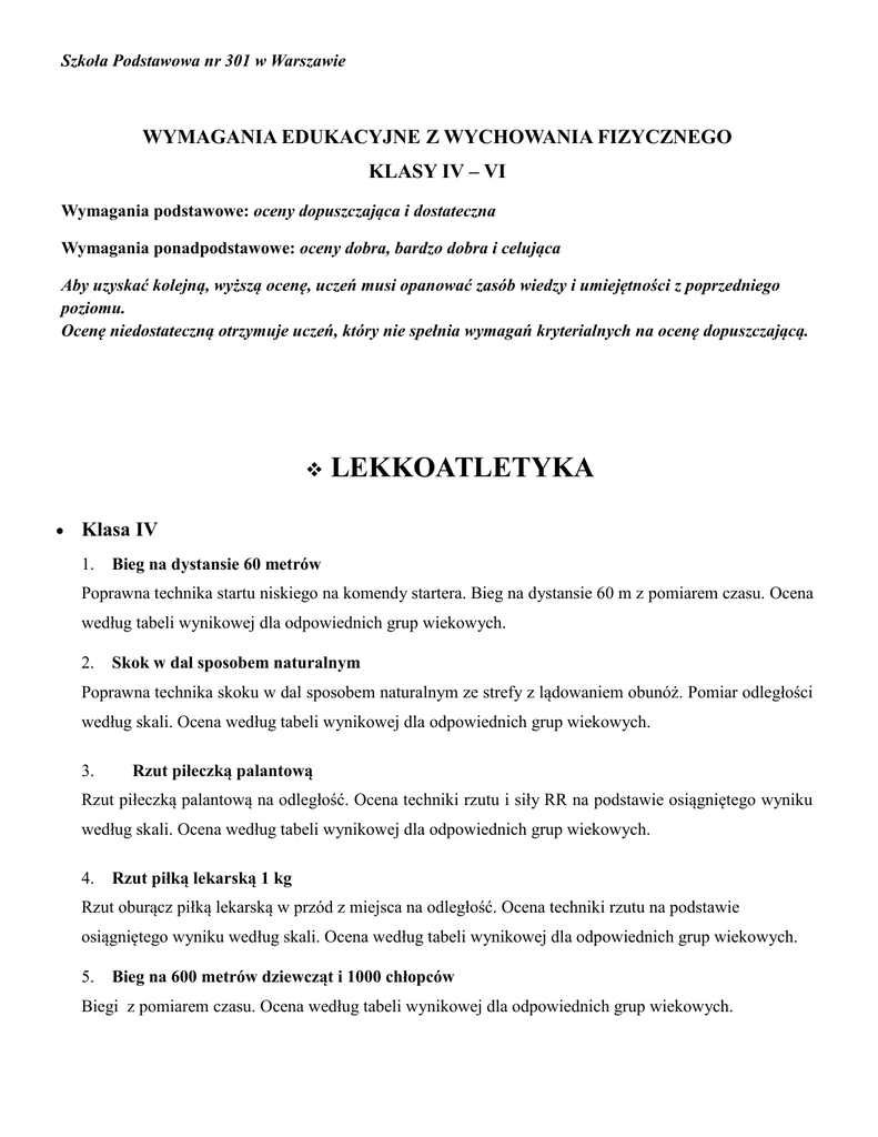 Szkoła Podstawowa nr 301 w Warszawie WYMAGANIA EDUKACYJNE Z WYCHOWANIA FIZYCZNEGO KLASY IV – VI Wymagania podstawowe: oceny dopuszczająca i dostateczna Wymagania ponadpodstawowe: oceny dobra, bardzo dobra i celująca Aby uzyskać kolejną, wyższą ocenę, uczeń musi opanować zasób wiedzy i umiejętności z poprzedniego poziomu. Ocenę niedostateczną otrzymuje uczeń, który nie spełnia wymagań kryterialnych na ocenę dopuszczającą. LEKKOATLETYKA Klasa IV Bieg na dystansie 60 metrów Poprawna technika startu niskiego na komendy startera. Bieg na dystansie 60 m z pomiarem czasu. Ocena według tabeli wynikowej dla odpowiednich grup wiekowych. Skok w dal sposobem naturalnym Poprawna technika skoku w dal sposobem naturalnym ze strefy z lądowaniem obunóż. Pomiar odległości według skali. Ocena według tabeli wynikowej dla odpowiednich grup wiekowych. Rzut piłeczką palantową Rzut piłeczką palantową na odległość. Ocena techniki rzutu i siły RR na podstawie osiągniętego wyniku według skali. Ocena według tabeli wynikowej dla odpowiednich grup wiekowych. Rzut piłką lekarską 1 kg Rzut oburącz piłką lekarską w przód z miejsca na odległość. Ocena techniki rzutu na podstawie osiągniętego wyniku według skali. Ocena według tabeli wynikowej dla odpowiednich grup wiekowych. Bieg na 600 metrów dziewcząt i 1000 chłopców Biegi z pomiarem czasu. Ocena według tabeli wynikowej dla odpowiednich grup wiekowych. Szkoła Podstawowa nr 301 w Warszawie Klasa V dla odpowiednich grup wiekowych Bieg na dystansie 60 metrów Poprawna technika startu niskiego na komendy startera. Bieg na dystansie 60m z pomiarem czasu. Ocena według tabeli wynikowej dla odpowiednich grup wiekowych. Skok w dal sposobem naturalnym Poprawna technika skoku w dal sposobem naturalnym ze strefy z lądowaniem obunóż. Pomiar odległości według skali. Ocena według tabeli wynikowej dla odpowiednich grup wiekowych. Rzut piłeczką palantową Rzut piłeczką palantową na odległość. Ocena techniki rzutu i siły RR na podstawie osiągniętego wyniku według skali. Ocena według tabeli wynikowej dla odpowiednich grup wiekowych. Rzut piłką lekarską 2kg chłopcy 1kg dziewczęta Rzut oburącz piłką lekarską w tył z miejsca na odległość. Ocena techniki rzutu na podstawie osiągniętego wyniku według skali. Ocena według tabeli wynikowej dla odpowiednich grup wiekowych. Bieg na dystansie 600 metrów dziewcząt i 1000 chłopców Biegi z pomiarem czasu. Ocena według tabeli wynikowej dla odpowiednich grup wiekowych. Klasa VI Bieg na dystansie 60 metrów Poprawna technika startu niskiego na komendy startera. Bieg na dystansie 60m z pomiarem czasu. Ocena według tabeli wynikowej dla odpowiednich grup wiekowych. Skok w dal sposobem naturalnym. Poprawna technika skoku w dal sposobem naturalnym ze strefy i lądowanie obunóż. Pomiar odległości według skali. Ocena według tabeli wynikowej dla odpowiednich grup wiekowych. Rzut piłeczką palantową Rzut piłeczką palantową na odległość. Ocena techniki rzutu i siły RR na podstawie osiągniętego wyniku według skali. Ocena według tabeli wynikowej dla odpowiednich grup wiekowych. Rzut piłką lekarską 2kg chłopcy 1kg dziewczęta Szkoła Podstawowa nr 301 w Warszawie Rzut oburącz piłką lekarską w tył z miejsca na odległość. Ocena techniki rzutu na podstawie osiągniętego wyniku według skali. Ocena według tabeli wynikowej dla odpowiednich grup wiekowych. Bieg na dystansie 800 metrów dziewcząt i 1000 chłopców Biegi z pomiarem czasu. Ocena według tabeli wynikowej dla odpowiednich grup wiekowych. Klasa IV sportowa 1. Bieg na dystansie 60 metrów Poprawna technika startu niskiego na komendy startera. Bieg na dystansie 60m z pomiarem czasu. Ocena według tabeli wynikowej dla odpowiednich grup wiekowych. 2. Skok w dal sposobem naturalnym Poprawna technika skoku w dal sposobem naturalnym ze strefy z lądowaniem obunóż. Pomiar odległości według skali. Ocena według tabeli wynikowej dla odpowiednich grup wiekowych. 3. Rzut piłeczką palantową Rzut piłeczką palantową na odległość. Ocena techniki rzutu i siły RR na podstawie osiągniętego wyniku według skali. Ocena według tabeli wynikowej dla odpowiednich grup wiekowych. 4. Rzut piłką lekarską 1 kg Rzut oburącz piłką lekarską w przód z miejsca na odległość. Ocena techniki rzutu na podstawie osiągniętego wyniku według skali. Ocena według tabeli wynikowej dla odpowiednich grup wiekowych. 5. Bieg na 600 metrów dziewcząt i 1000 chłopców Biegi z pomiarem czasu. Ocena według tabeli wynikowej dla odpowiednich grup wiekowych. 6. Test Coopera 12-minutowa próba biegowa. Ocena według tabeli wynikowej dla odpowiednich grup wiekowych. 7. Skok wzwyż Skok wzwyż techniką naturalną. Ocena techniki skoku na podstawie osiągniętego wyniku według skali. Ocena według tabeli wynikowej dla odpowiednich grup wiekowych. Klasa V sportowa 1. Bieg na dystansie 60 metrów Szkoła Podstawowa nr 301 w Warszawie Poprawna technika startu niskiego na komendy startera. Bieg na dystansie 60m z pomiarem czasu. Ocena według tabeli wynikowej dla odpowiednich grup wiekowych. 2. Skok w dal sposobem naturalnym Poprawna technika skoku w dal sposobem naturalnym ze strefy z lądowaniem obunóż. Pomiar odległości według skali. Ocena według tabeli wynikowej dla odpowiednich grup wiekowych. 3. Rzut piłeczką palantową Rzut piłeczką palantową na odległość. Ocena techniki rzutu i siły RR na podstawie osiągniętego wyniku według skali. Ocena według tabeli wynikowej dla odpowiednich grup wiekowych. 4. Rzut piłką lekarską 2kg chłopcy 1kg dziewczęta Rzut oburącz piłką lekarską w tył z miejsca na odległość. Ocena techniki rzutu na podstawie osiągniętego wyniku według skali. Ocena według tabeli wynikowej dla odpowiednich grup wiekowych. 5. Bieg na dystansie 600 metrów dziewcząt i 1000 chłopców Biegi z pomiarem czasu. Ocena według tabeli wynikowej dla odpow