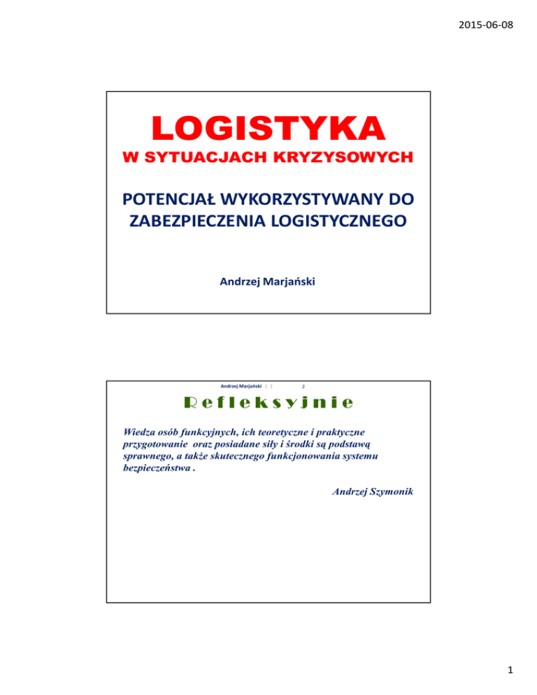 2015-06-08 LOGISTYKA W SYTUACJACH KRYZYSOWYCH POTENCJAŁ WYKORZYSTYWANY DO ZABEZPIECZENIA LOGISTYCZNEGO Andrzej Marjański Andrzej Marjański ( ) 2 Refleksyjnie Wiedza osób funkcyjnych, ich teoretyczne i praktyczne przygotowanie oraz posiadane siły i środki są podstawą sprawnego, a także skutecznego funkcjonowania systemu bezpieczeństwa . Andrzej Szymonik 1 2015-06-08 Andrzej Marjański ( ) 3 Agenda Istota potencjału logistycznego Gmina jako realizator zadań logistycznych Zasady przygotowywania potencjału logistycznego Rola i zadania zasobów ludzkich Andrzej Marjański ( ) 4 Istota potencjału logistycznego Potencjał logistyczny w sytuacjach kryzysowych określony zasób możliwości (zdolności) zaopatrzeniowych i usługowych (wytwórczych), który można użyć (wykorzystać, wyzyskać) do zabezpieczenia logistycznego ludności poszkodowanej. Potencjał ten stanowią zasoby ludzkie, zasoby zaopatrzeniowe oraz zasoby usługowe (w zakresie usług logistycznych i usług medycznych). Wielkość potencjału logistycznego na wypadek sytuacji kryzysowych określana jest na podstawie jego bilansu z prognozowanymi potrzebami logistycznymi ludności poszkodowanej. 2 2015-06-08 Andrzej Marjański ( ) 5 Hierarchiczność systemu logistycznego Hierarchiczna struktura systemu logistycznego powoduje, że odpowiedzialność za zabezpieczenie logistyczne ludności poszkodowanej rozkłada się na cztery szczeble administracji publicznej: gminę powiat, województwo szczebel centralny – rządowy Andrzej Marjański ( ) 6 Gmina jako bezpośredni realizator Potencjał logistyczny przygotowywany jest odpowiednio (stosownie do prognozowanych potrzeb logistycznych) na wszystkich szczeblach administracji Bezpośrednim realizatorem zadań logistycznych jest zwykle szczebel najniższy – gmina. Powoduje to, że wszystkie kolejne, wyższe szczeble, w zależności od potrzeb i sytuacji, służą swoim potencjałem logistycznym niższemu szczeblowi administracji publicznej, na zasadzie wsparcia bądź wzmocnienia. 3 2015-06-08 Andrzej Marjański ( ) 7 Zasada przygotowania potencjału Nie przygotowuje się potencjału logistycznego zaspokajającego wszystkie (maksymalne) potrzeby logistyczne występujące na danym szczeblu administracji publicznej. Głównie nie robi się tego z powodu bardzo wysokich kosztów. Natomiast zwykle przygotowywany jest potencjał logistyczny odpowiadający około 75% prognozowanych potrzeb logistycznych, „Brakujące” zasoby pozyskuje się ze szczebla nadrzędnego w ramach wsparcia bądź wzmocnienia. Andrzej Marjański ( ) 8 Zasoby ludzkie i ich predyspozycje do realizacji zadań logistycznych Zasoby (potencjał) ludzkie uczestniczące w organizacji i realizacji zadań logistycznych na rzecz ludności poszkodowanej w sytuacjach kryzysowych to przede wszystkim organy logistyczne: grupy robocze ZZK – grupa zabezpieczenia logistycznego grupa opieki zdrowotnej i pomocy socjalno-bytowej) stany osobowe podmiotów (jednostek, przedsiębiorstw) dowożących zaopatrzenie oraz świadczących usługi logistycznych i usługi medyczne. 4 2015-06-08 Andrzej Marjański ( ) 9 Zapewnienie ciągłości działania W skład grup logistycznych ZZK (grupy zabezpieczenia logistycznego oraz grupy opieki zdrowotnej i pomocy socjalnobytowej) wchodzą specjaliści – eksperci. W grupie zabezpieczenia logistycznego są to: specjaliści ds.: zaopatrzenia, usług gospodarczo- bytowych i transportu; w grupie opieki zdrowotnej i pomocy socjalnobytowej specjaliści ds.: ewakuacji medycznej, sanitarnohigienicznych, przeciwepidemicznych, zaopatrzenia w sprzęt i materiały medyczne, pomocy socjalno-bytowej. Skład liczebny grup logistycznych powinien zapewnić ich dwuzmianową (całodobową) pracę w ZZK. Andrzej Marjański ( ) 10 Rodzaje podmiotów tworzących ZL W zależności od sytuacji, skali i rodzaju realizowanych zadań logistycznych mogą to być: Jednostki ochrony przeciwpożarowej, jednostki służby zdrowia, jednostki (zespoły) pogotowia komunalnego, jednostki Policji, jednostki straży miejskich i gminnych, j jednostki wojskowe, jednostki Straży Granicznej, Organizacje pozarządowe, ludność miejscowa formacje obrony cywilnej, inne jednostki. 5 2015-06-08 Andrzej Marjański ( ) 11 Jednostki ochrony przeciwpożarowej W sytuacjach kryzysowych realizują swoje specjalistyczne zadania w ramach Krajowego systemu ratowniczo-gaśniczego W skład systemu, oprócz jednostek ochrony przeciwpożarowej wchodzą: inne służby, inspekcje, straże i instytucje specjaliści w sprawach ratownictwa inne podmioty (na zasadach dobrowolności – po uprzednim uzgodnieniu współdziałania na danym obszarze ze starostą, wojewodą lub Komendantem Głównym Państwowej Straży Pożarnej Andrzej Marjański ( ) 12 Pododdziały ochrony przeciwpożarowej Rota – dwuosobowy zespół ratowników, wchodzący w skład tego samego zastępu lub specjalistycznej grupy ratowniczej, wykonujący zadania ratownicze lub zabezpieczające, wyposażony w sprzęt ochrony osobistej zastęp – pododdział w sile od trzech do sześciu ratowników, w tym dowódca, wyposażony w pojazd przystosowany do realizacji zadania ratowniczego; sekcja – pododdział w sile dwóch zastępów, liczący od 9 do 12 ratowników, w tym dowódca; pluton – pododdział w sile od 3 do 4 zastępów lub dwóch sekcji, liczący od 15 do 21 ratowników, w tym dowódca; 6 2015-06-08 Andrzej Marjański ( ) 13 Pododdziały ochrony przeciwpożarowej kompania – pododdział w sile trzech plutonów lub czterech sekcji oraz dowódca; batalion – oddział w sile od trzech do pięciu kompanii oraz dowódca; brygada – związek pododdziałów i oddziałów realizujący w granicach administracyjnych województwa wieloobszarowe działanie ratownicze; specjalistyczna grupa ratownicza – pododdział ratowników posiadających specjalistyczne przeszkolenie i uprawnienia, wyposażony w sprzęt dostosowany do wykonywania specjalistycznego zadania ratowniczego, w 
