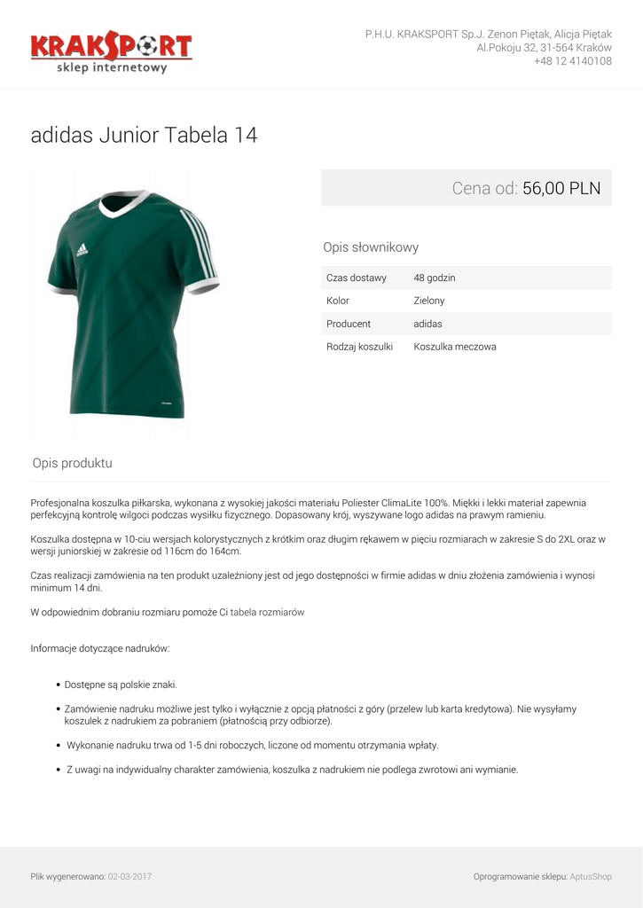 P.H.U. KRAKSPORT Sp.J. Zenon Piętak, Alicja Piętak Al.Pokoju 32, 31-564 Kraków +48 12 4140108 adidas Junior Tabela 14 Cena od: 56,00 PLN Opis słownikowy Czas dostawy 48 godzin Kolor Zielony Producent adidas Rodzaj koszulki Koszulka meczowa Opis produktu Profesjonalna koszulka piłkarska, wykonana z wysokiej jakości materiału Poliester ClimaLite 100%. Miękki i lekki materiał zapewnia perfekcyjną kontrolę wilgoci podczas wysiłku fizycznego. Dopasowany krój, wyszywane logo adidas na prawym ramieniu. Koszulka dostępna w 10-ciu wersjach kolorystycznych z krótkim oraz długim rękawem w pięciu rozmiarach w zakresie S do 2XL oraz w wersji juniorskiej w zakresie od 116cm do 164cm. Czas realizacji zamówienia na ten produkt uzależniony jest od jego dostępności w firmie adidas w dniu złożenia zamówienia i wynosi minimum 14 dni. W odpowiednim dobraniu rozmiaru pomoże Ci tabela rozmiarów Informacje dotyczące nadruków: Dostępne są polskie znaki. Zamówienie nadruku możliwe jest tylko i wyłącznie z opcją płatności z góry (przelew lub karta kredytowa). Nie wysyłamy koszulek z nadrukiem za pobraniem (płatnością przy odbiorze). Wykonanie nadruku trwa od 1-5 dni roboczych, liczone od momentu otrzymania wpłaty. Z uwagi na indywidualny charakter zamówienia, koszulka z nadrukiem nie podlega zwrotowi ani wymianie. Plik wygenerowano: 02-03-2017 Oprogramowanie sklepu: AptusShop P.H.U. KRAKSPORT Sp.J. Zenon Piętak, Alicja Piętak Al.Pokoju 32, 31-564 Kraków +48 12 4140108 Warianty produktu 128 56,00 PLN 140 56,00 PLN 152 56,00 PLN 164 56,00 PLN Galeria Plik wygenerowano: 02-03-2017 Powered by TCPDF (www.tcpdf.org) Oprogramowanie sklepu: AptusShop