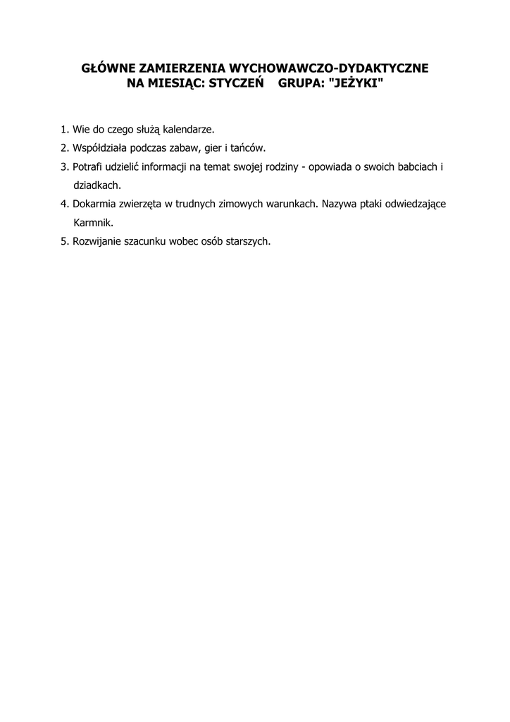 GŁÓWNE ZAMIERZENIA WYCHOWAWCZO-DYDAKTYCZNE NA MIESIĄC: STYCZEŃ GRUPA: "JEśYKI" 1. Wie do czego słuŜą kalendarze. 2. Współdziała podczas zabaw, gier i tańców. 3. Potrafi udzielić informacji na temat swojej rodziny - opowiada o swoich babciach i dziadkach. 4. Dokarmia zwierzęta w trudnych zimowych warunkach. Nazywa ptaki odwiedzające Karmnik. 5. Rozwijanie szacunku wobec osób starszych. Piosenka MÓJ DZIADEK LUBI … Mój dziadek lubi tańczyć, Cza - cza - cza - cza - cza. Mój dziadek lubi śpiewać, La - la - la - la - la. Mój dziadek lubi sprzątać, Szu - szu - szu - szu - szu. Mój dziadek to dla mnie wzór Ref.: Dziadku, dziadku, Jesteś tak wspaniały! Dziadku, dziadku, Bardzo cię kochamy! Dziadku, dziadku, Bądź zawsze wesoły! Dziadku, dziadku, śyj sto lat !!! słowa, muzyka - P. Megger WIERSZ DLA BABCI Siadaj babciu, siadaj blisko. Zaraz ci opowiem wszystko. Prawie całą noc nie spałam, Bo prezenty wymyślałam. Na kanapie się kręciłam, AŜ dla ciebie wymyśliłam: Z lodu broszkę i korale I śniegowe cztery szale. Dziesięć czapek w śnieŜną kratkę I lodową czekoladkę. Jak nie będzie ci smakować To mnie moŜesz poczęstować. D. Gellner