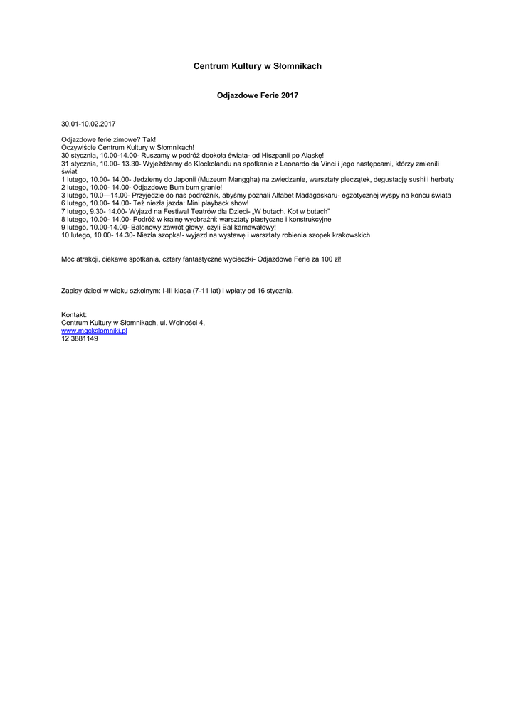 Centrum Kultury w Słomnikach Odjazdowe Ferie 2017 30.01-10.02.2017 Odjazdowe ferie zimowe? Tak! Oczywiście Centrum Kultury w Słomnikach! 30 stycznia, 10.00-14.00- Ruszamy w podróż dookoła świata- od Hiszpanii po Alaskę! 31 stycznia, 10.00- 13.30- Wyjeżdżamy do Klockolandu na spotkanie z Leonardo da Vinci i jego następcami, którzy zmienili świat 1 lutego, 10.00- 14.00- Jedziemy do Japonii (Muzeum Manggha) na zwiedzanie, warsztaty pieczątek, degustację sushi i herbaty 2 lutego, 10.00- 14.00- Odjazdowe Bum bum granie! 3 lutego, 10.0—14.00- Przyjedzie do nas podróżnik, abyśmy poznali Alfabet Madagaskaru- egzotycznej wyspy na końcu świata 6 lutego, 10.00- 14.00- Też niezła jazda: Mini playback show! 7 lutego, 9.30- 14.00- Wyjazd na Festiwal Teatrów dla Dzieci- „W butach. Kot w butach” 8 lutego, 10.00- 14.00- Podróż w krainę wyobraźni: warsztaty plastyczne i konstrukcyjne 9 lutego, 10.00-14.00- Balonowy zawrót głowy, czyli Bal karnawałowy! 10 lutego, 10.00- 14.30- Niezła szopka!- wyjazd na wystawę i warsztaty robienia szopek krakowskich Moc atrakcji, ciekawe spotkania, cztery fantastyczne wycieczki- Odjazdowe Ferie za 100 zł! Zapisy dzieci w wieku szkolnym: I-III klasa (7-11 lat) i wpłaty od 16 stycznia. Kontakt: Centrum Kultury w Słomnikach, ul. Wolności 4, www.mgckslomniki.pl 12 3881149